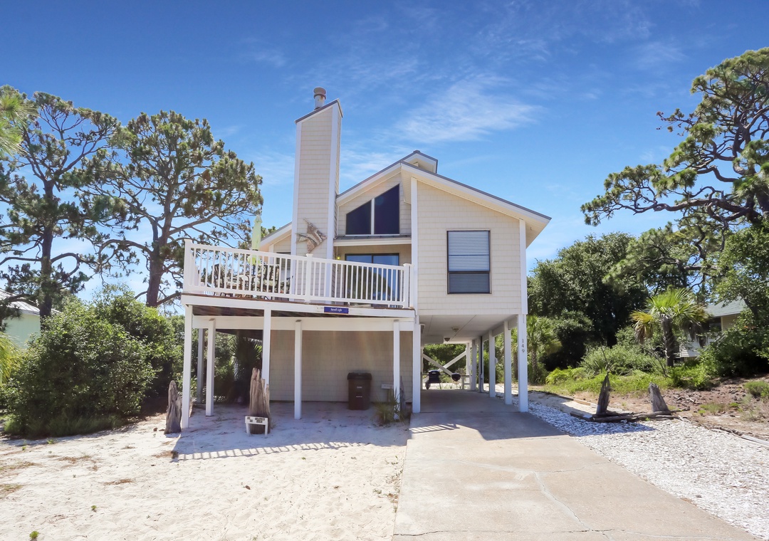 This 3 bedroom, 2 bath single-family home is a comfortable spot to call home base. Located just a short walk from the beach, you also have views of St. Joseph Bay in the opposite direction. There is a great open deck on the front of the house with a dining table and umbrella. Under the house, there is covered parking with a fish cleaning area and an enclosed outdoor shower. Once inside the property, the living area is an open space on the first floor with sliding glass doors and windows allowing natural sunlight to pour in. There are also two bedrooms on the first floor with a master suite on the top floor.