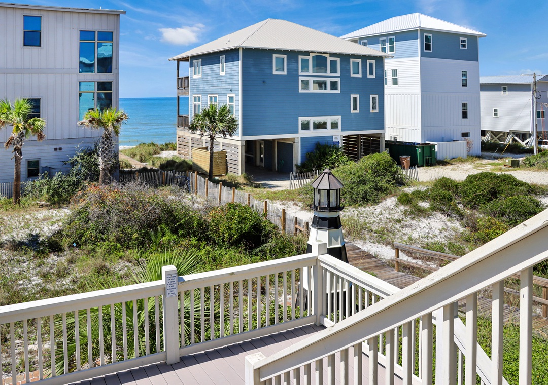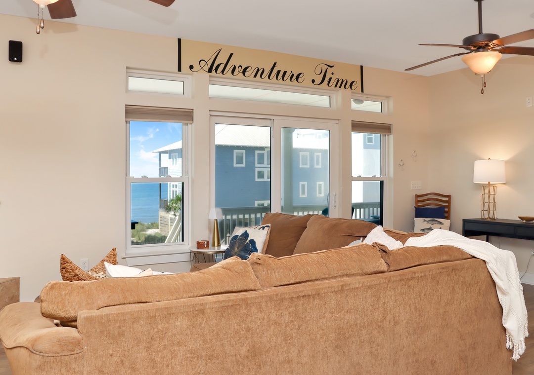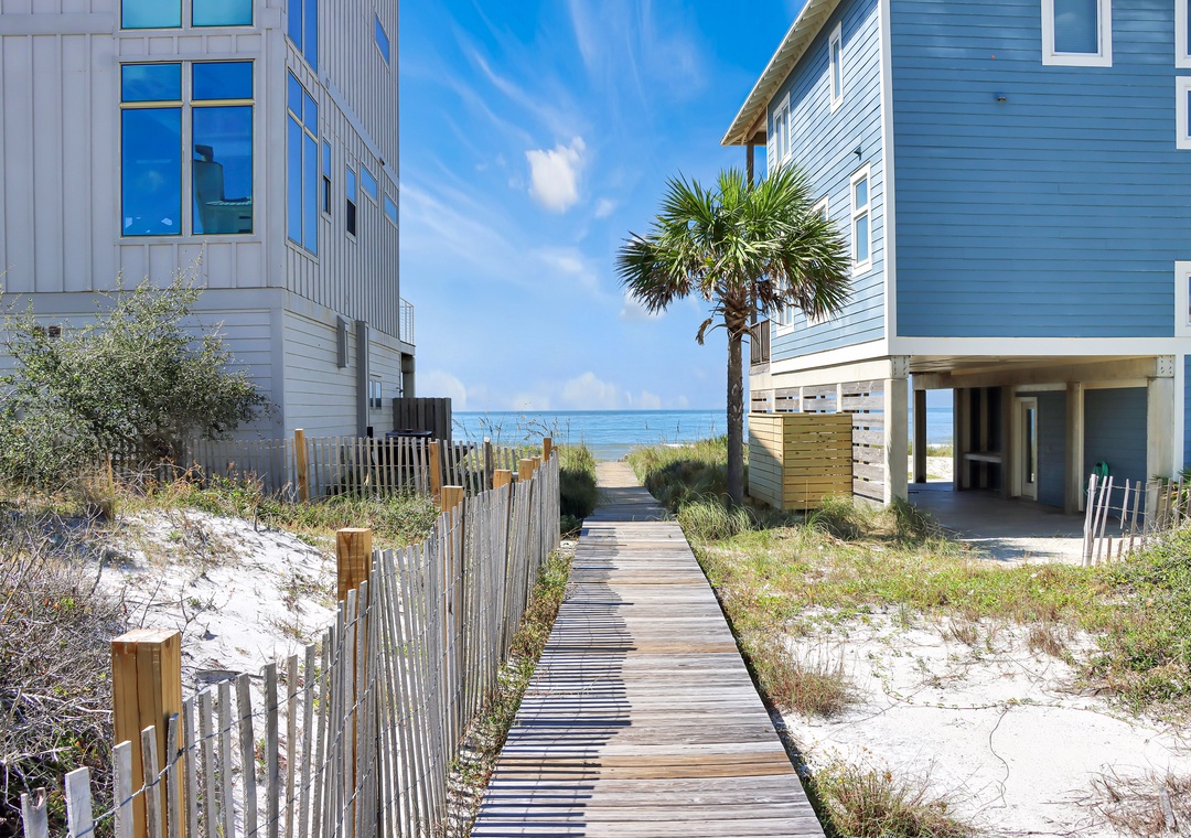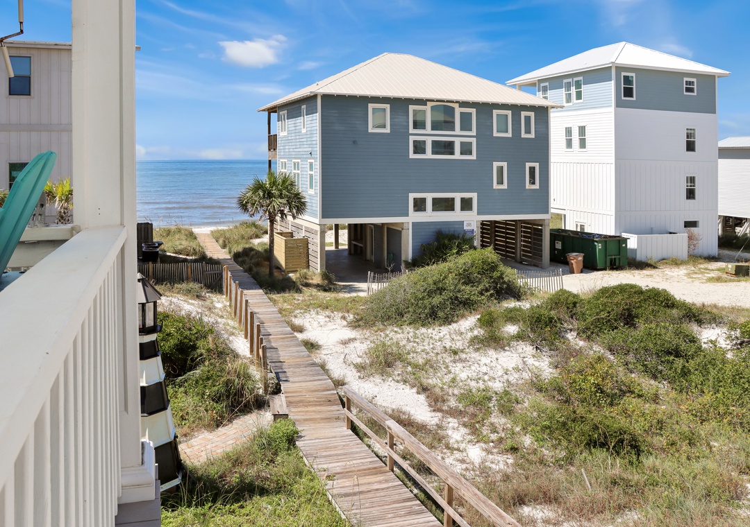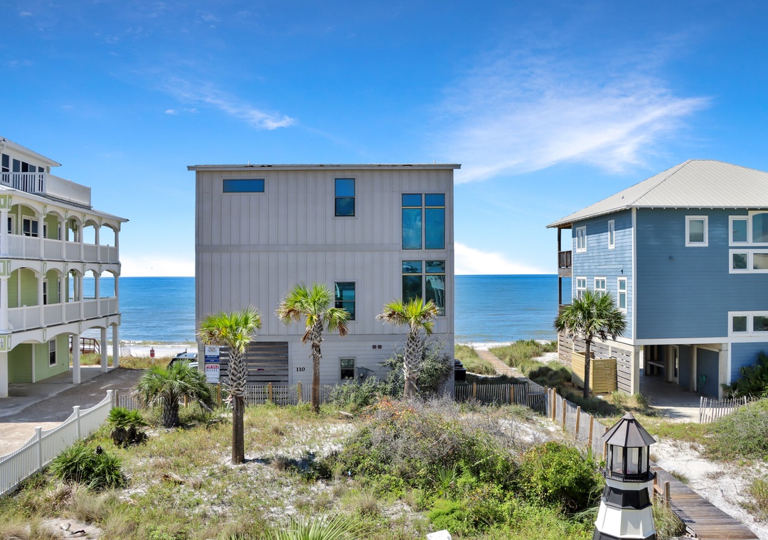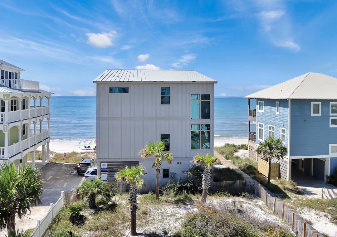 Explore the ultimate beachside retreat, perfect for families or groups of up to 14 looking for adventure. Immerse yourself in the tranquility of Gulf views from this stunning four-bedroom, four-bathroom beach house, Adventure Time. Enjoy easy beach access via a charming boardwalk that brings the salty breeze right to your doorstep, making the transition from sandy shores to the comfort of home a breeze. A variety of amenities are designed for the ultimate coastal living experience. An outdoor shower and towel rack make beach days carefree, while the large bunk room on the ground floor is perfect for kids or group lodging, complete with a TV room for entertainment. Relax or entertain on the main level, where an open living area with kitchen and dining space offers panoramic beach views from every angle. And when it's time to unwind, the luxurious top-floor master suite awaits, featuring a private deck and wet bar. Just steps away, indulge in the community pool with relaxing loungers and a picturesque beach view. Welcome to your personal slice of paradise, where every day feels like an adventure.