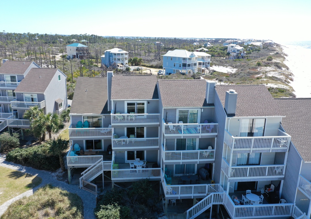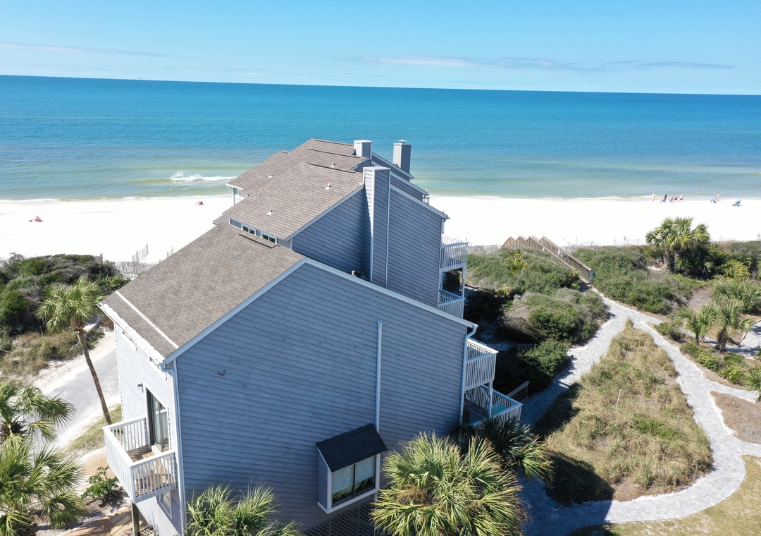 Click Here To Learn More!Floor Plan: Ground level – covered, paved parking and outdoor shower. 1st level – gulf front living room with a furnished balcony which has a gulf view beyond the natural vegetation; and a TV, VCR, DVD and Fireplace; kitchen, dining area and half bath. 2nd level – Bedroom 1-queen bed, full bath with shower only, flat screen TV and gulf front balcony with view; laundry closet and Bedroom 2 – queen bed, full bath with shower/tub combo, flat screen TV and a small side deck with great gulf view. 3rd level – a loft accessed by stairs with two double beds, and TV.