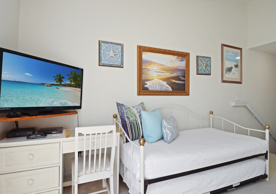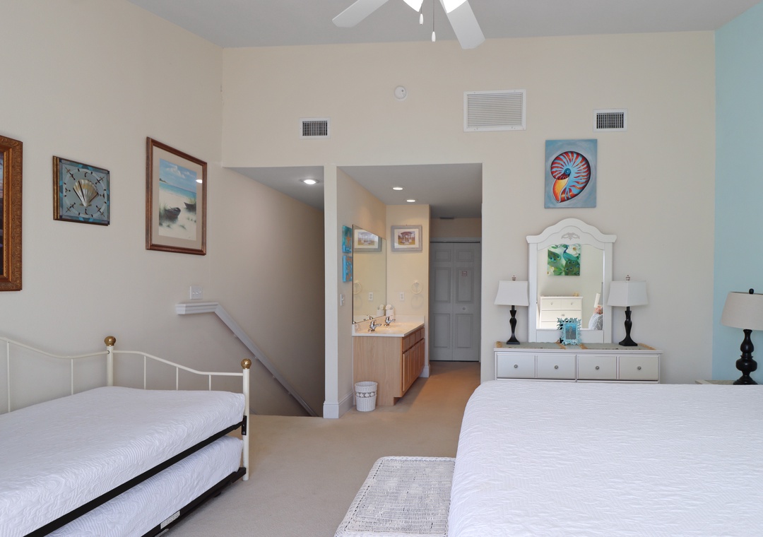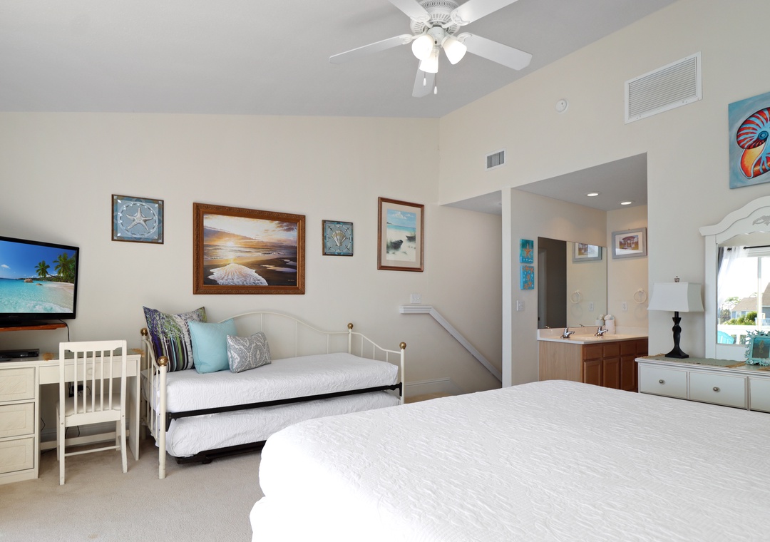 Floor Plan: Ground level-covered, paved parking and foyer. 1st level-living room with TV, DVD and furnished deck; dining area, kitchen, full bath with shower/tub combo and Bedroom 1 – queen bed, TV and sundeck with fantastic view of pool. 2nd level-Bedroom 2 – upstairs master suite with king bed, daybed and trundle, TV, DVD, open deck, laundry room and full bath with double vanities, separate shower and tub.