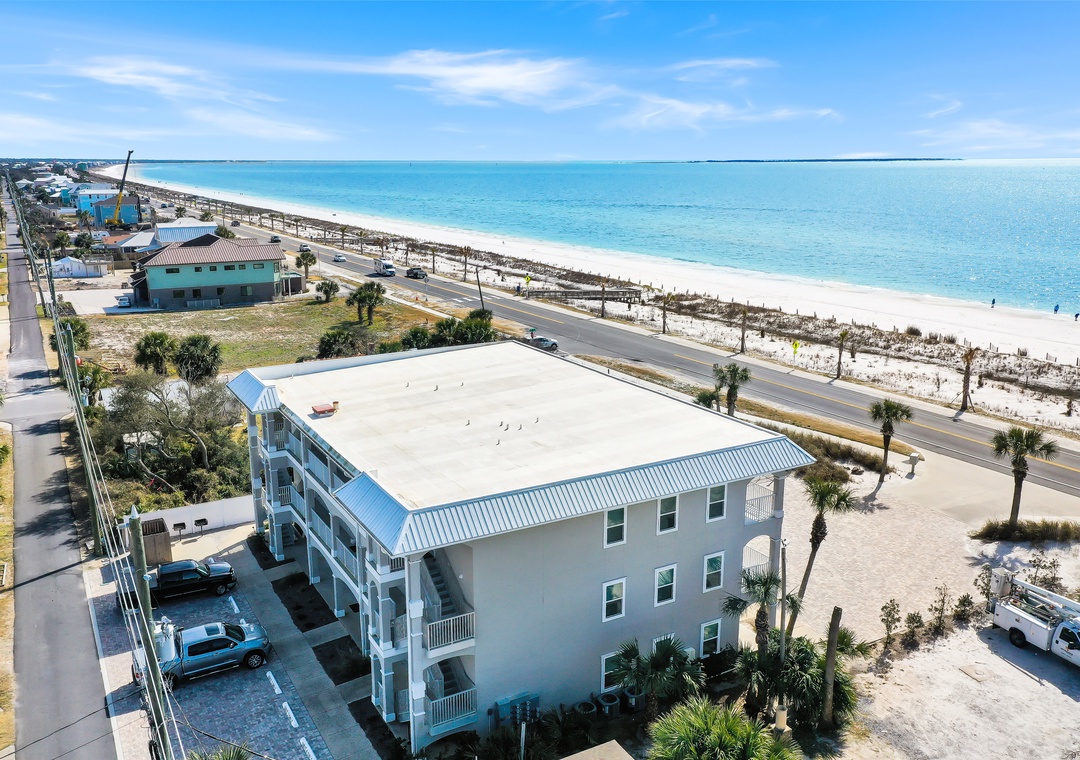 This unit is brand new inside, and they did a fantastic job in their choices of furniture, finishes, and decorating. Clean, open, fresh feel — better than the pictures, I thought. We loved the counter-height table and now plan to get one in our own MB condo (being rehabbed) based on liking this one. Everything in MB is still in the process of getting cleaned up on the outside, so we didn’t expect the exterior to be spic & span yet. Parking is in the back. The unit is on the middle of the 3rd floor. There is a spigot right outside the door for rinsing off feet if needed. When we arrived we found plenty of towels, hand soap and shower soap, a small amount of dishwasher soap and washing machine soap to get us started, a kitchen sponge, one pod of Folgers coffee, and one toilet paper in each bathroom. We were glad we brought coffee filters and paper towels with us. We loved how clean and new and stylish and comfortable the whole unit is — it’s really a nice place — and being right across the street from the beach with no visible barrier at all was a real treat. Easy to watch those famous Mexico beach sunsets.- Posted: 8/30/2020