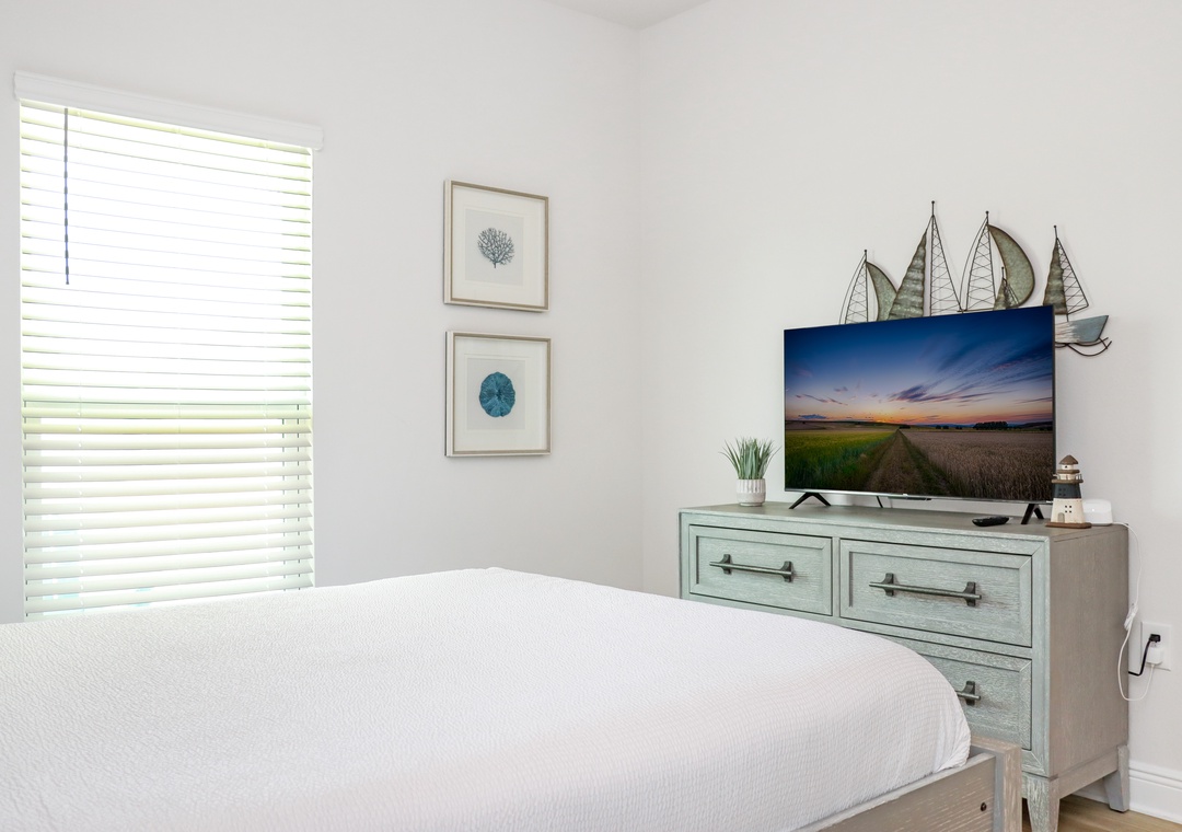 Nestled on a corner lot, this single level, ground-floor home features a large screened porch in the backyard, ideal for enjoying the balmy evenings while grilling up your favorite meals on the electric grill. Inside, you'll find an expansive, open living room, dining area, and kitchen, perfect for spending quality time together. Each bedroom is equipped with its own TV, and the living room boasts a large TV and extra-large sectional sofa for cozy movie nights – popcorn popper included!