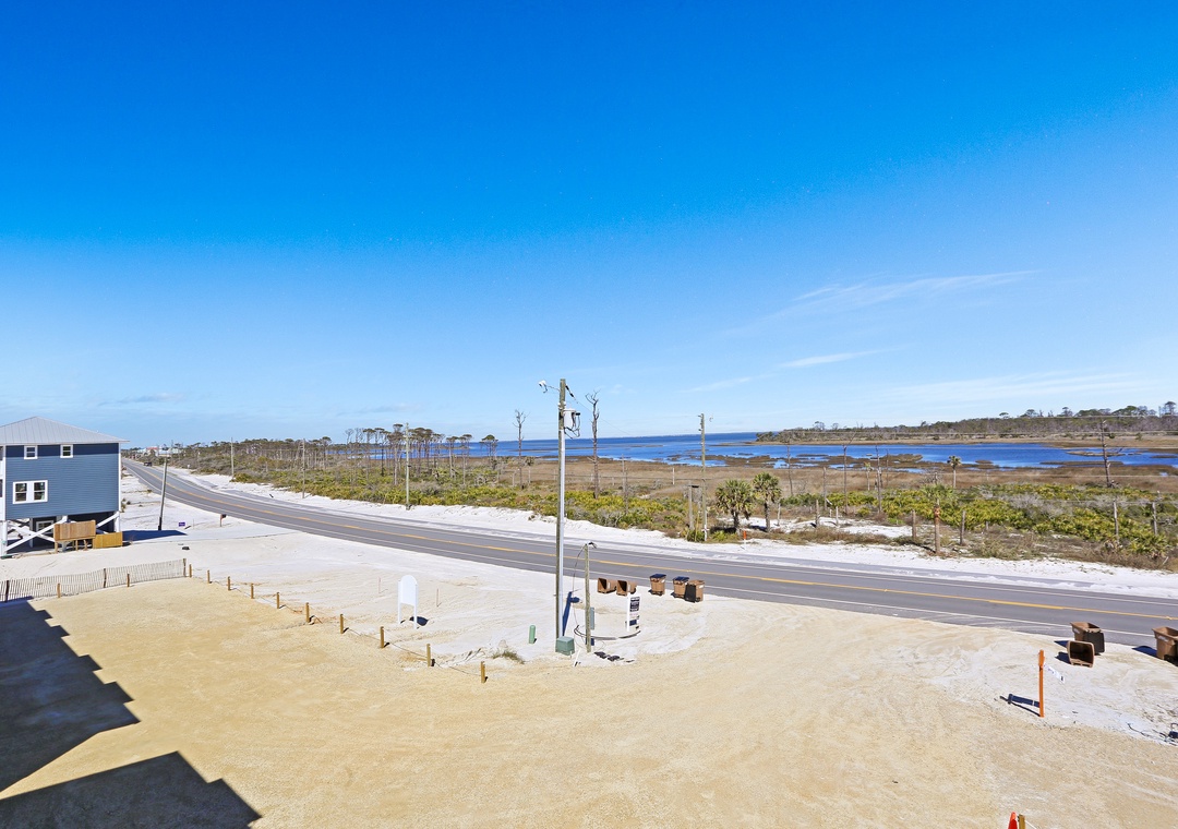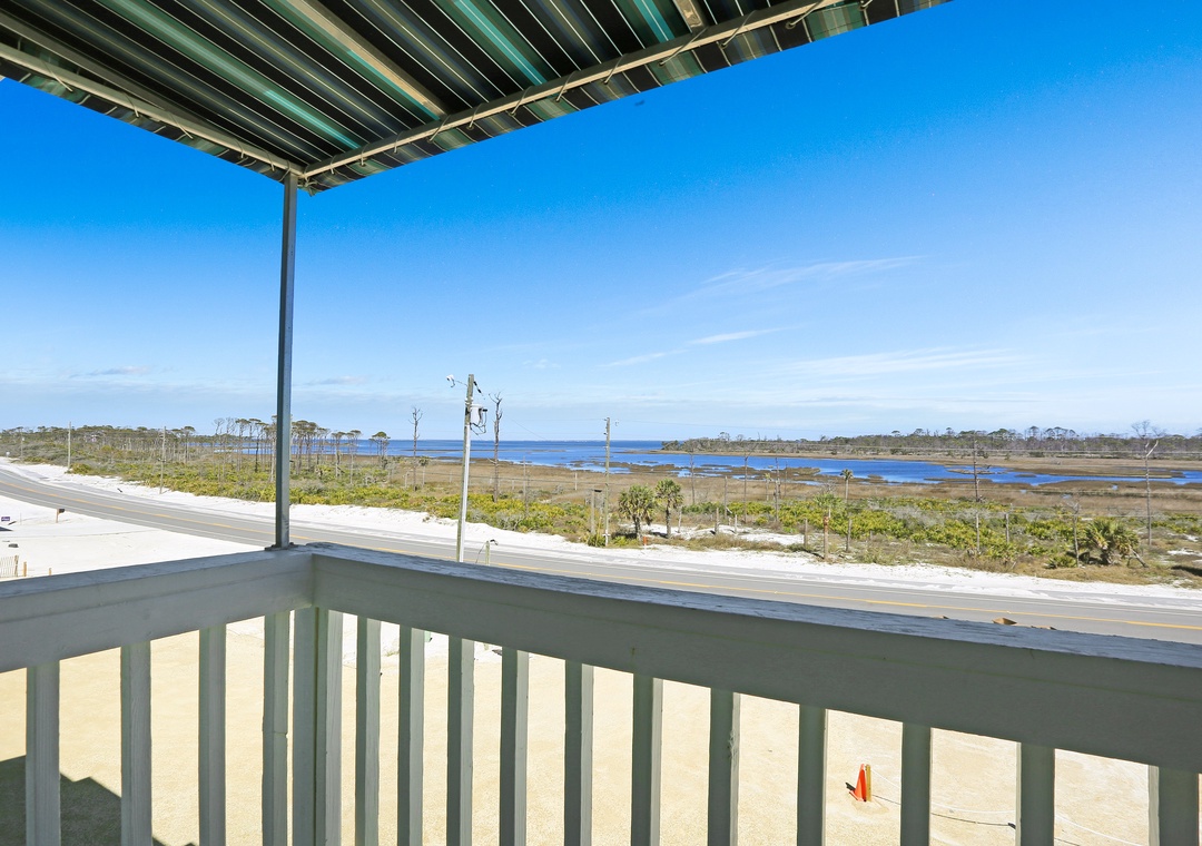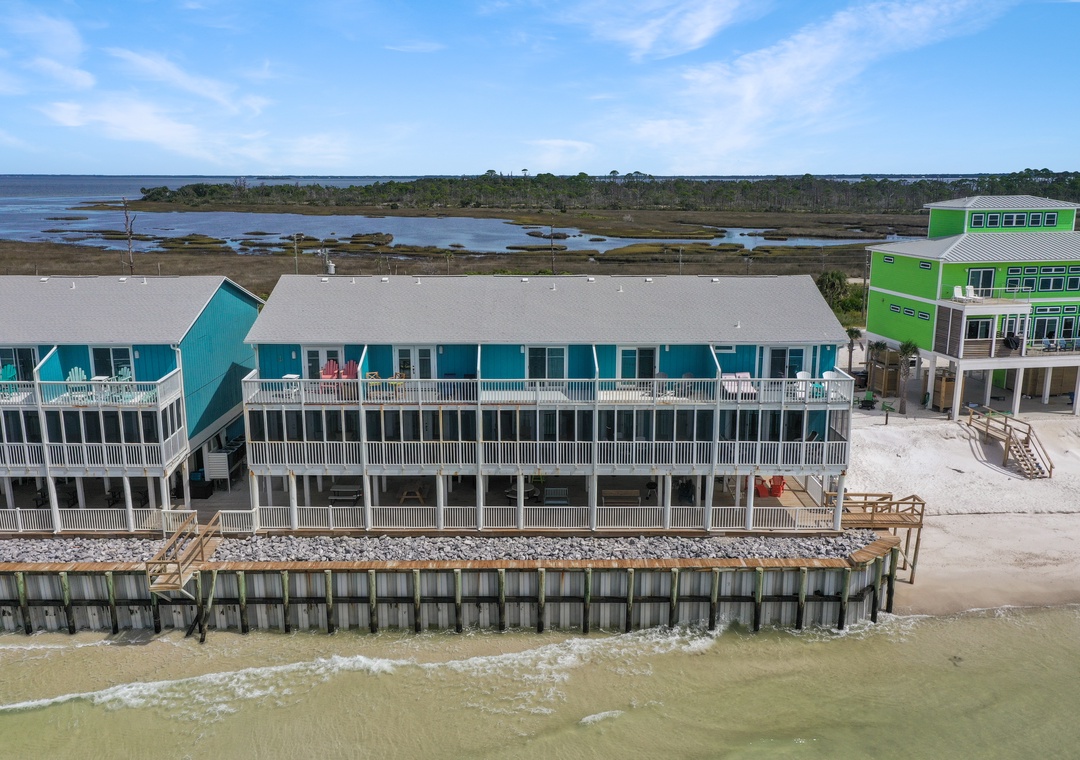 Click Here To Learn More!Floor Plan: Ground level – covered, paved parking. 1st level – gulf front living room with furnished, screened deck, sleeper sofa and TV; kitchen with stackable W/D, dining area and half bath. 2nd level Bedroom 1 – gulf front master bedroom with king bed, TV, open deck and full bath with shower/tub combo; full bath with shower only, Bedroom 2 – duo bunk set, TV and DVD; and Bedroom 3 – bay view bedroom with king bed, TV and small deck facing St. Joseph Bay.