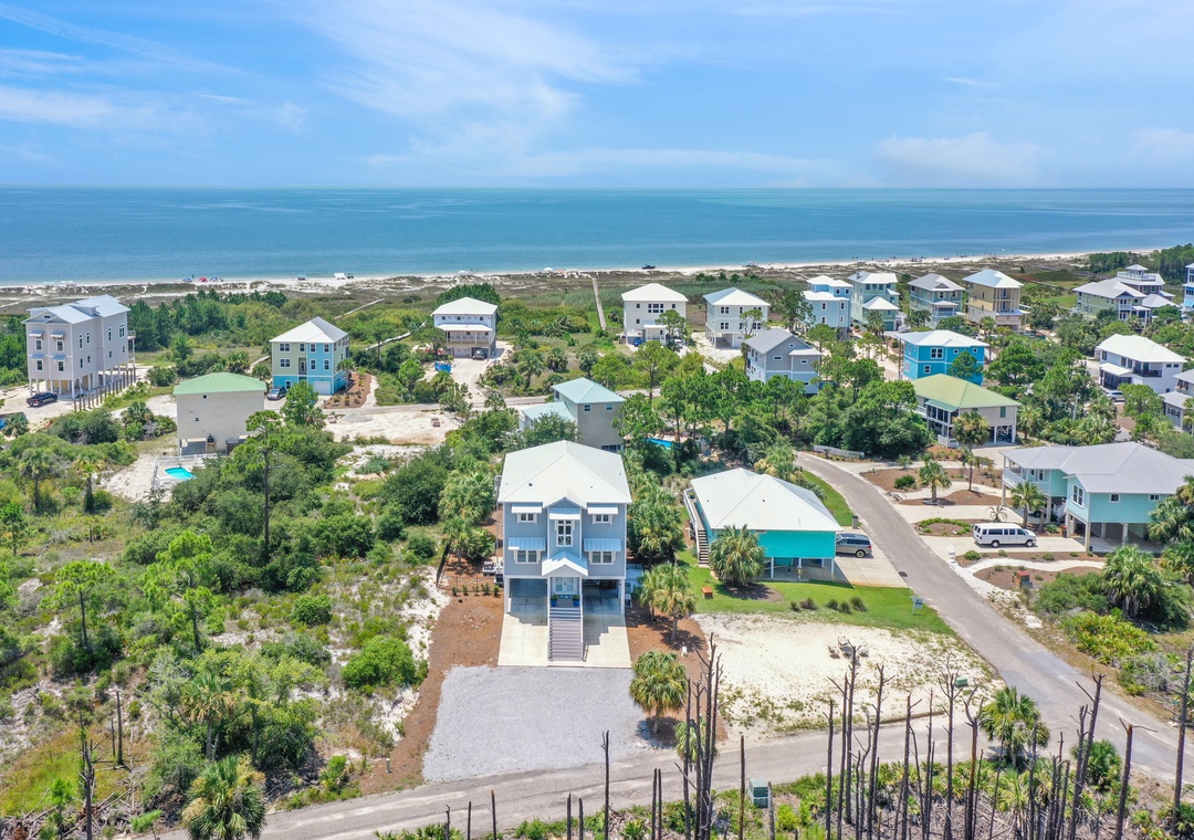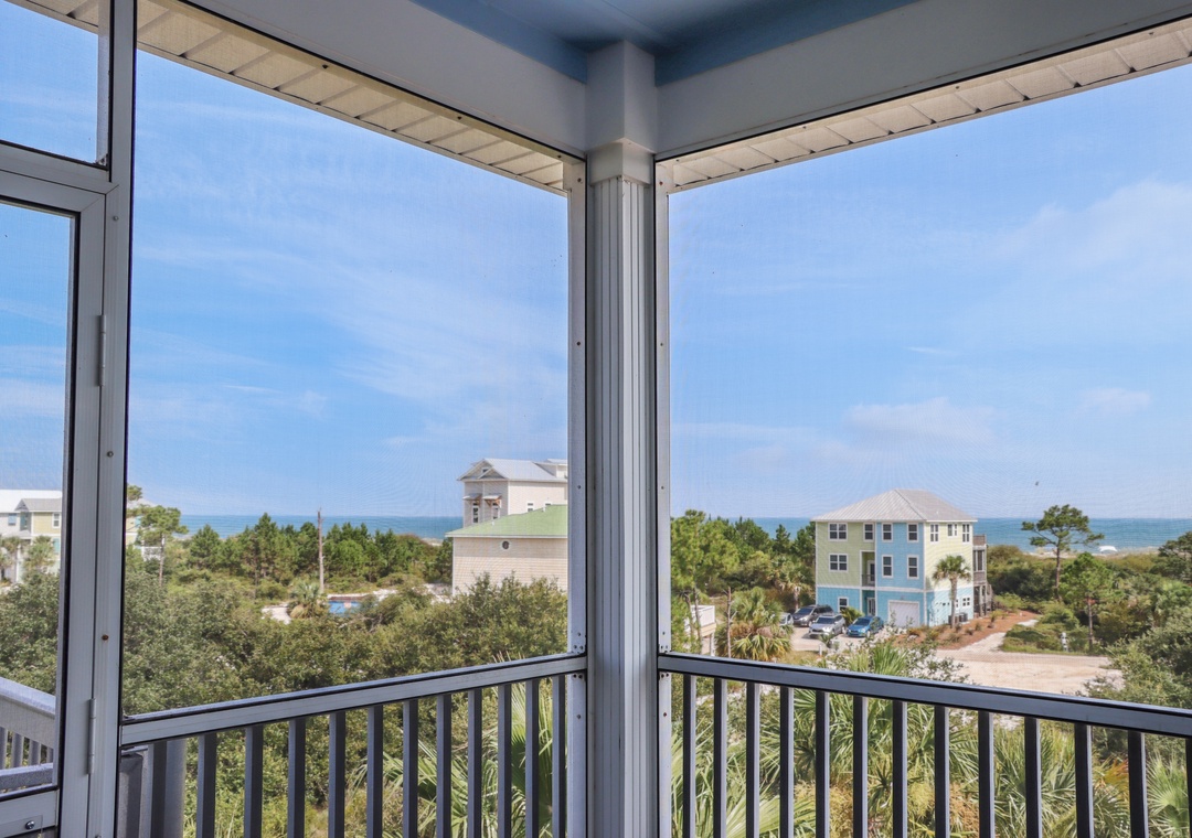 Located in a secluded area of South Cape San Blas, this beautiful beach vacation rental offers a wide range of amenities, including a private pool, outdoor lounging and dining areas, a gas grill, and screened porches. As a convenience, an enclosed outdoor shower and a private toilet are available when enjoying the pool. With four bedrooms that have access to baths and a view of the Gulf from the living room, it is perfect for families and groups. A separate living area is located on the first floor, allowing some separation. This room includes a TV, a sleeper sofa, and shelves full of games. The top-floor living room is an open, spacious room with incredible views all around. Additionally, the rental provides ample parking space for boats.