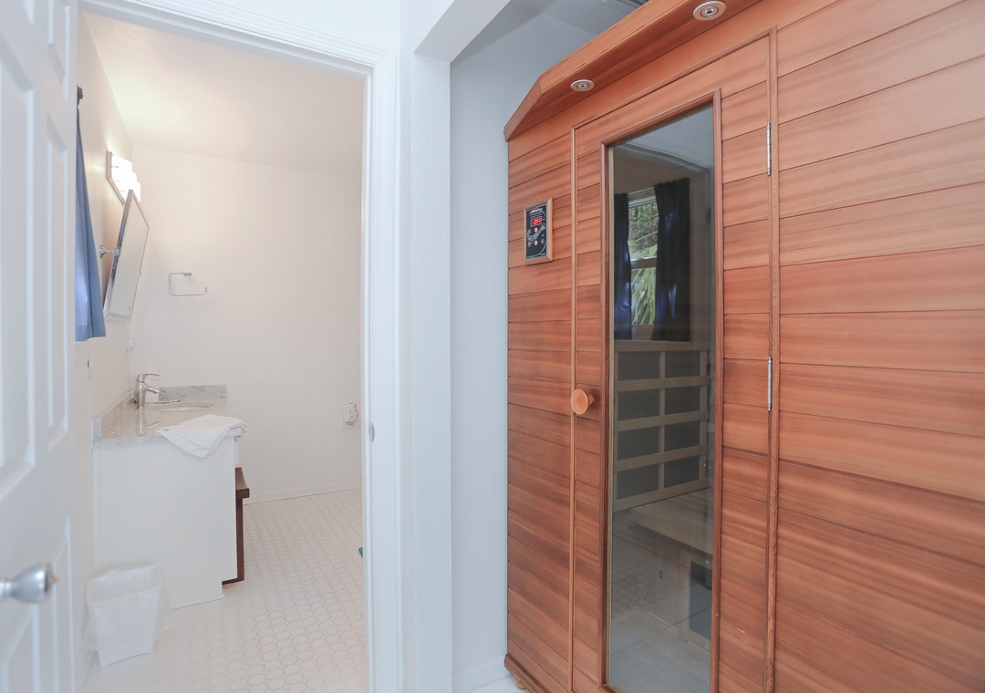 The first floor master bedroom includes a private full tub/shower bath, convenient access to the infrared, dry sauna, and a smart TV.