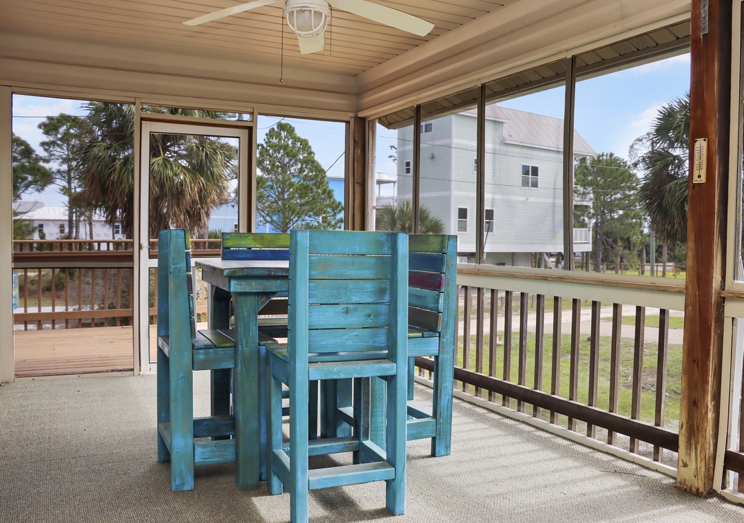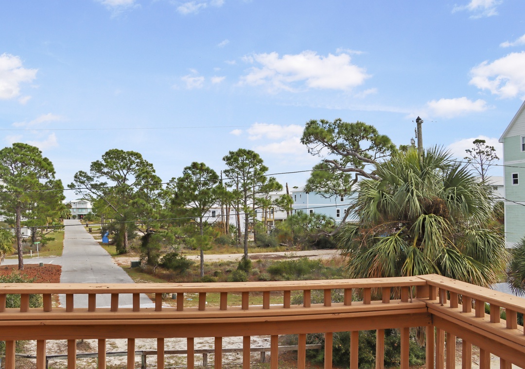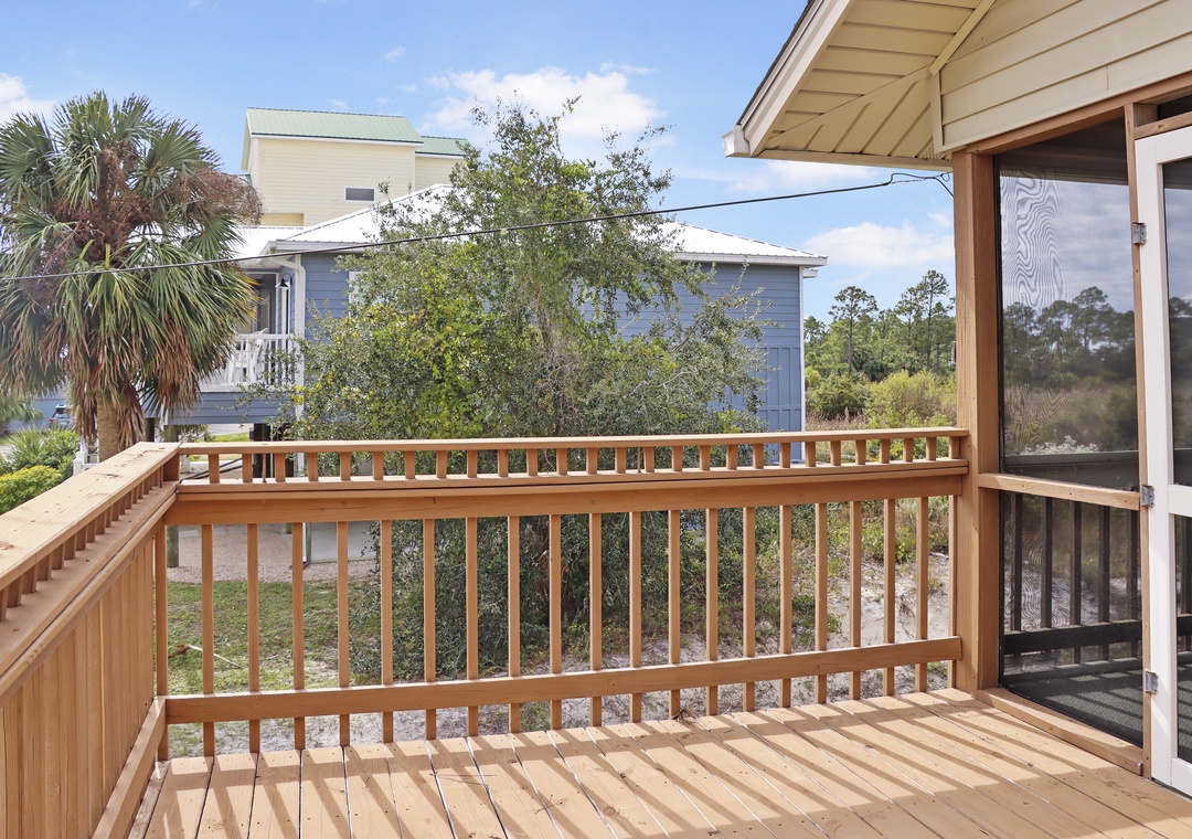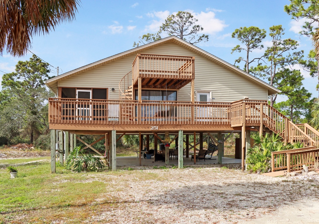 Nestled on the serene south end of Cape San Blas, Blue Moon Cottage offers a charming retreat where the beach is wider and blissfully less crowded. Situated on a secluded street surrounded by lush natural vegetation, this cozy, single-story home provides a tranquil escape with only a handful of neighboring houses. A short stroll to the end of the road will take you to pristine beaches where you can sit back, relax and soak up the sun. While the cottage may not boast a modern facade, its open-concept living, kitchen, and dining area is bathed in natural light through sliding glass doors on two sides, offering easy access to multiple decks. Enjoy leisurely meals on the furnished, screened deck facing the beach, or unwind on the roadside deck, which features both open and covered spaces. A spiral staircase leads to a rooftop sundeck, perfect for sunbathing. Pet-friendly and accommodating up to seven guests with its two bedrooms, Blue Moon Cottage is an inviting haven for families and friends alike.