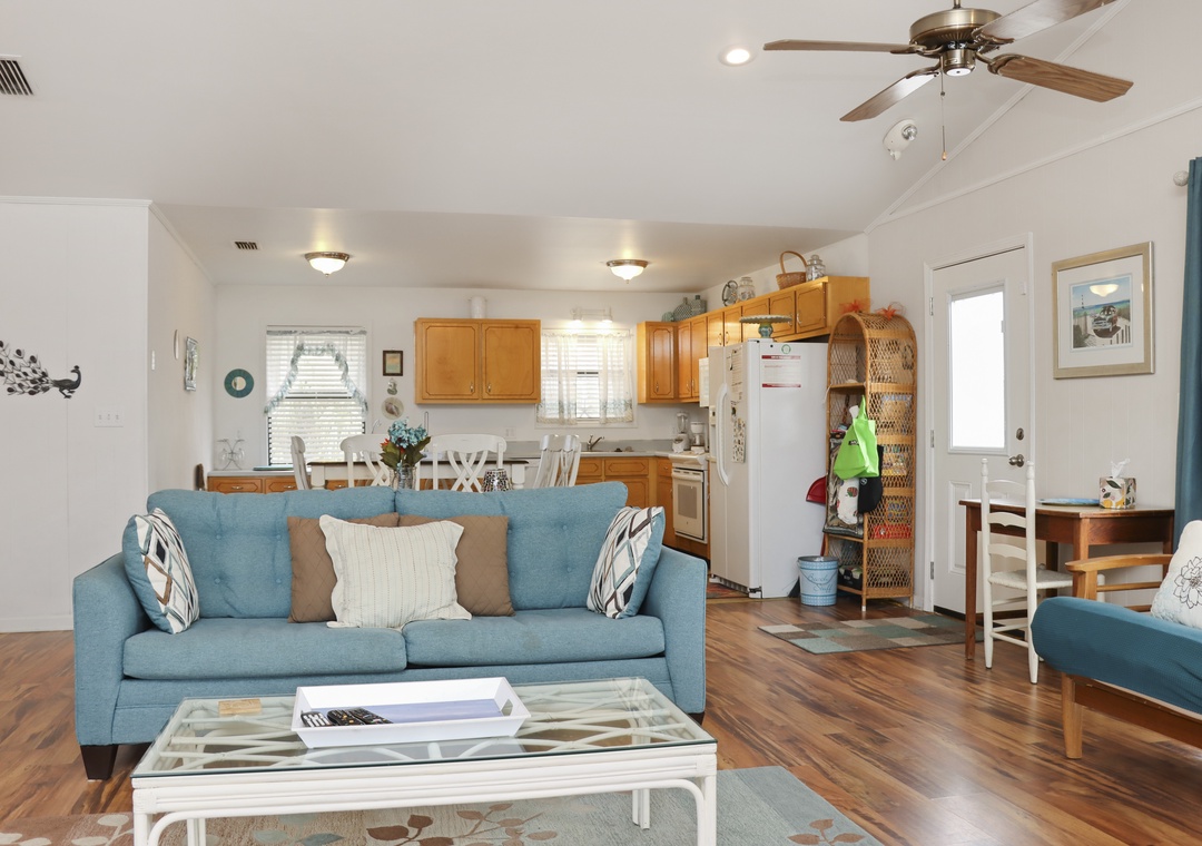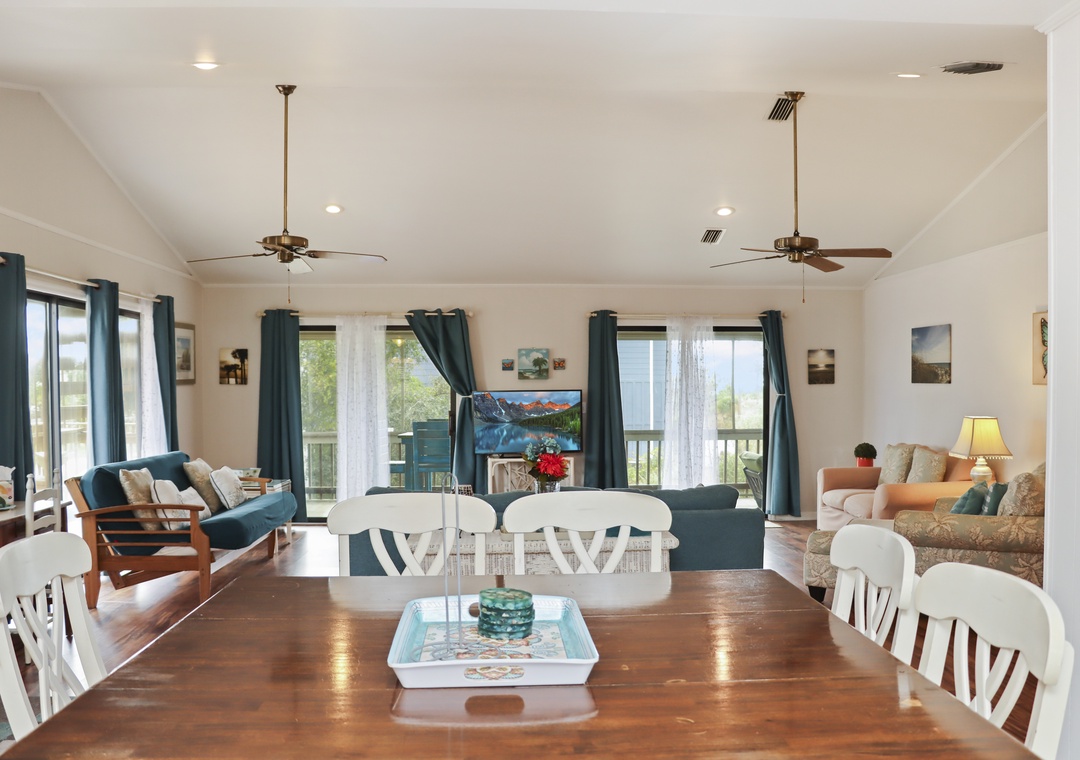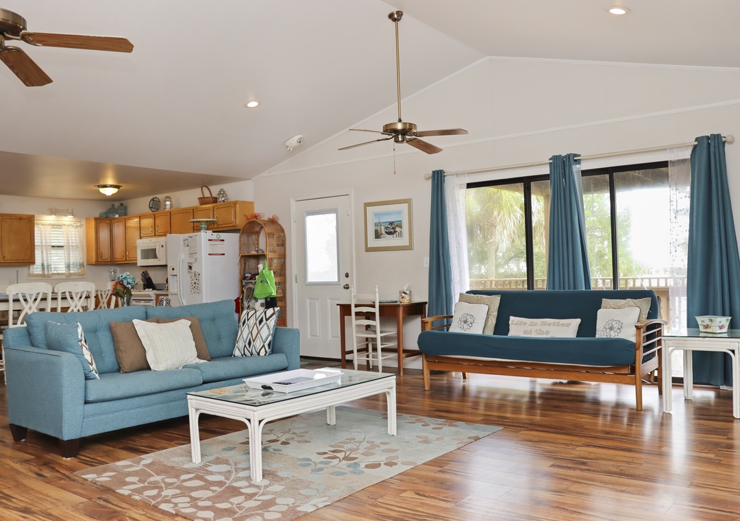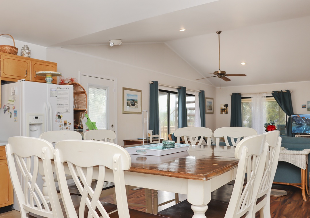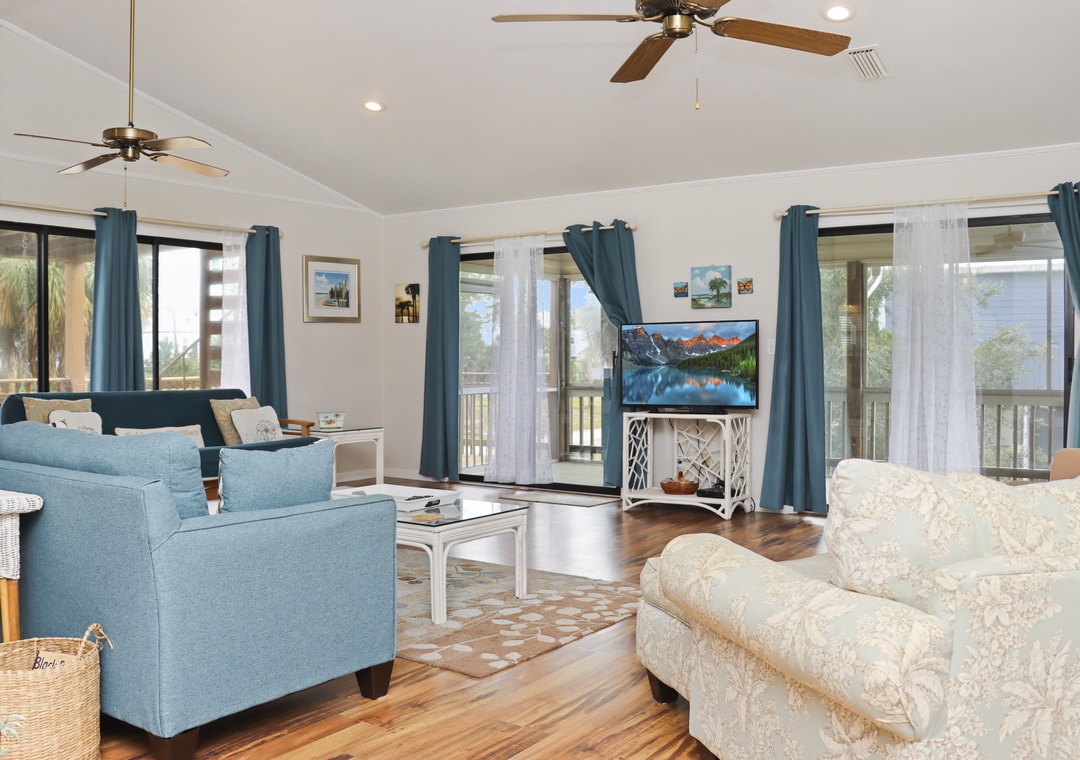 Nestled on the serene south end of Cape San Blas, Blue Moon Cottage offers a charming retreat where the beach is wider and blissfully less crowded. Situated on a secluded street surrounded by lush natural vegetation, this cozy, single-story home provides a tranquil escape with only a handful of neighboring houses. A short stroll to the end of the road will take you to pristine beaches where you can sit back, relax and soak up the sun. While the cottage may not boast a modern facade, its open-concept living, kitchen, and dining area is bathed in natural light through sliding glass doors on two sides, offering easy access to multiple decks. Enjoy leisurely meals on the furnished, screened deck facing the beach, or unwind on the roadside deck, which features both open and covered spaces. A spiral staircase leads to a rooftop sundeck, perfect for sunbathing. Pet-friendly and accommodating up to seven guests with its two bedrooms, Blue Moon Cottage is an inviting haven for families and friends alike.