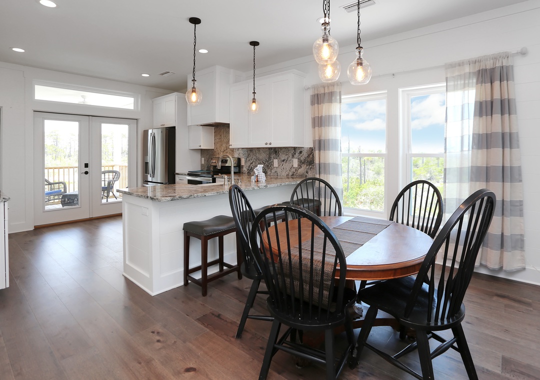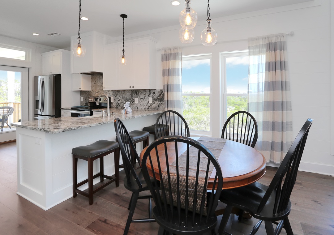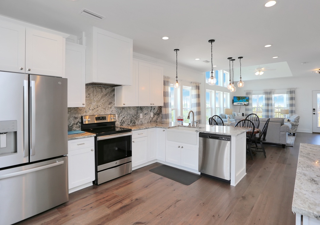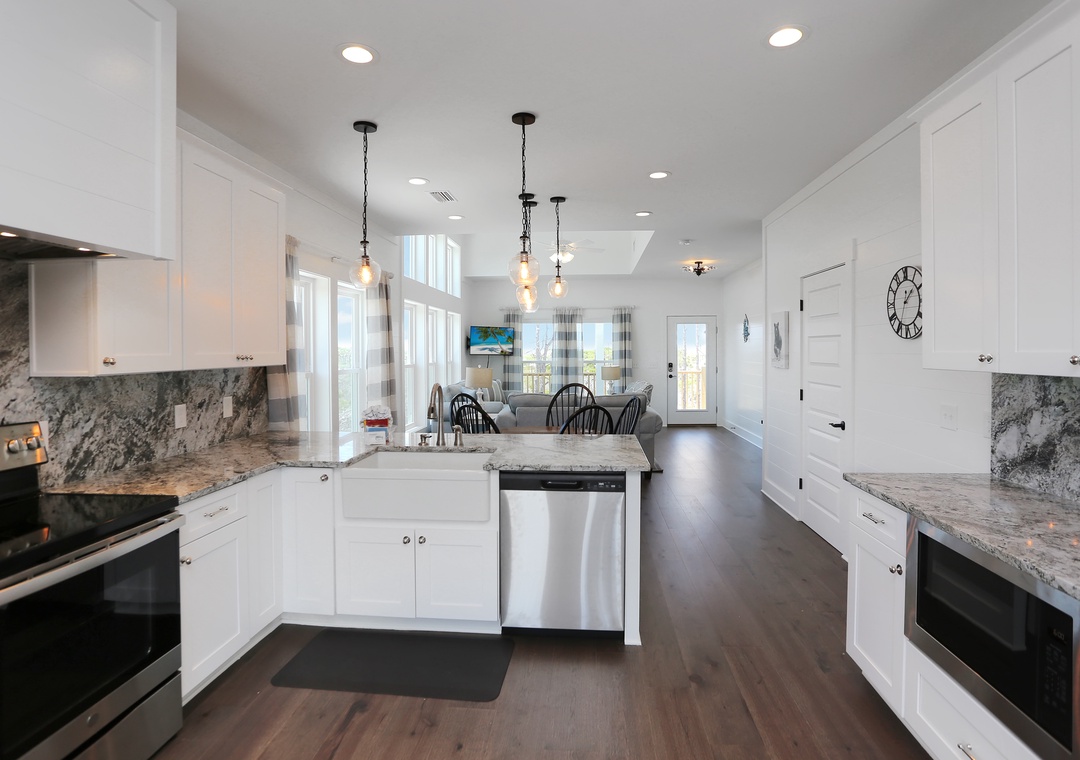 This 3-bedroom beach house is arranged on a single level and features an open design to host your group of up to eight. The natural light that pours in with floor-to-ceiling windows creates a bright and beachy spot, blurring the lines between indoors and out. The elevated ceilings stretch the interior space making it seem much roomier. There are two guest bedrooms and a master book-ending the open living area. It’s hard to determine which room is best, the stylishly furnished living room with a sleeper sofa or the wide-open kitchen that opens onto a covered, furnished deck. You can’t go wrong spending time in either.