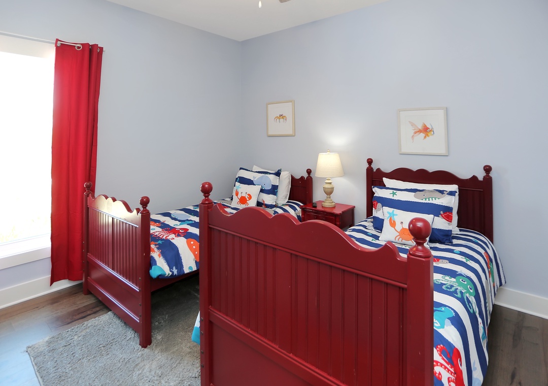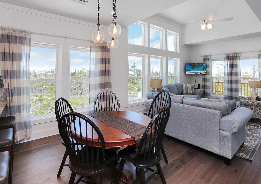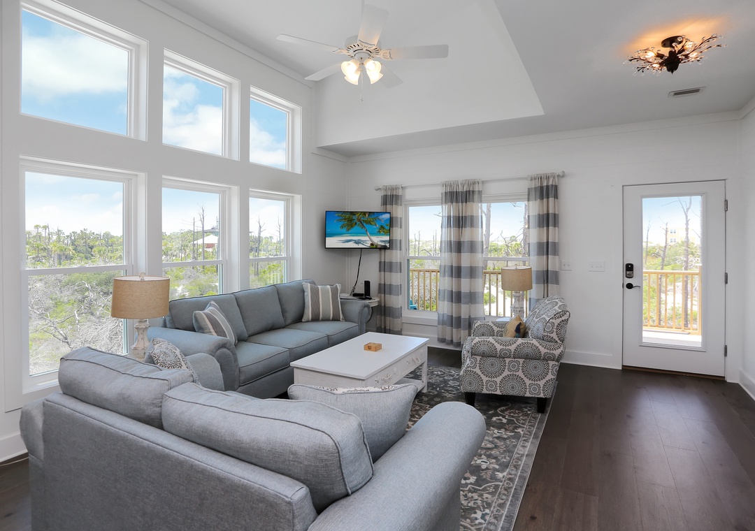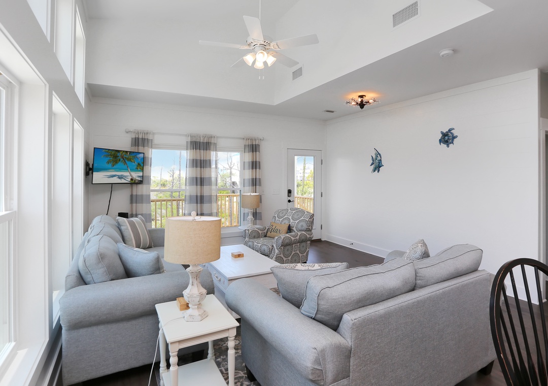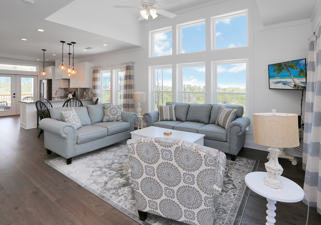 This 3-bedroom beach house is arranged on a single level and features an open design to host your group of up to eight. The natural light that pours in with floor-to-ceiling windows creates a bright and beachy spot, blurring the lines between indoors and out. The elevated ceilings stretch the interior space making it seem much roomier. There are two guest bedrooms and a master book-ending the open living area. It’s hard to determine which room is best, the stylishly furnished living room with a sleeper sofa or the wide-open kitchen that opens onto a covered, furnished deck. You can’t go wrong spending time in either.
