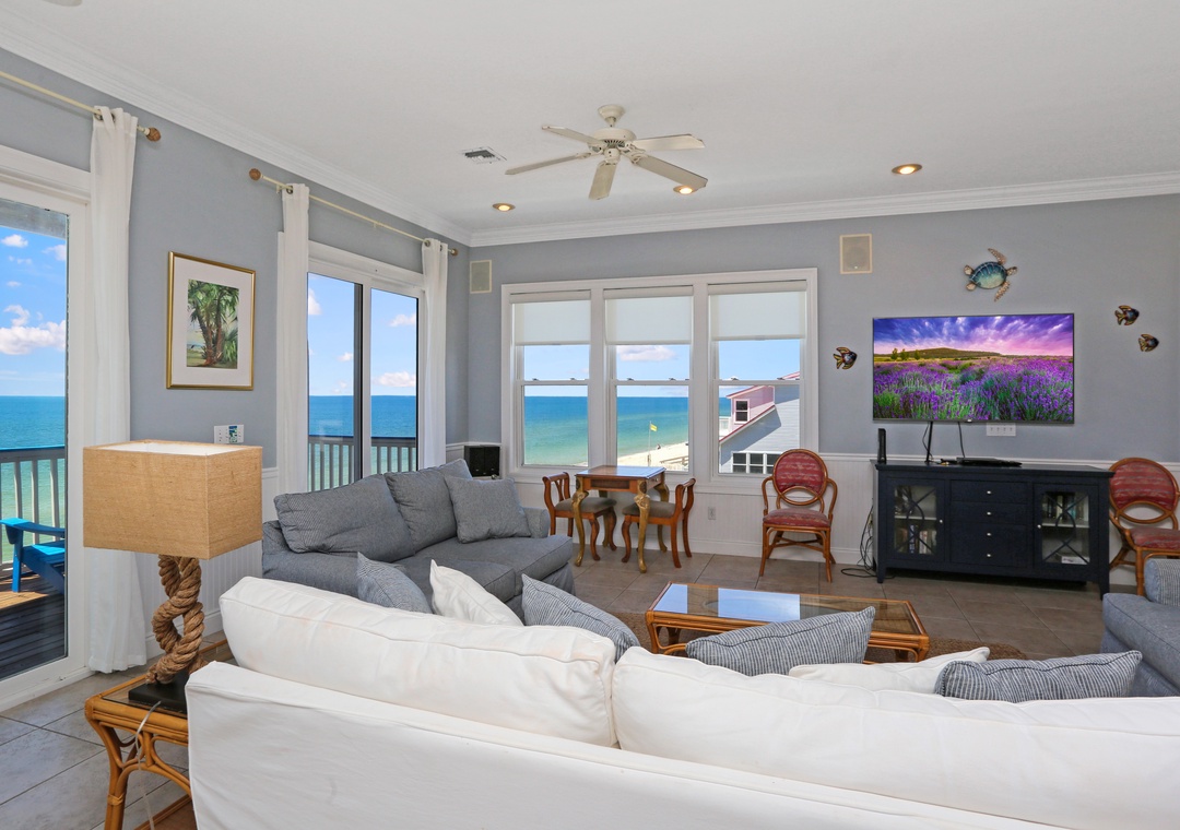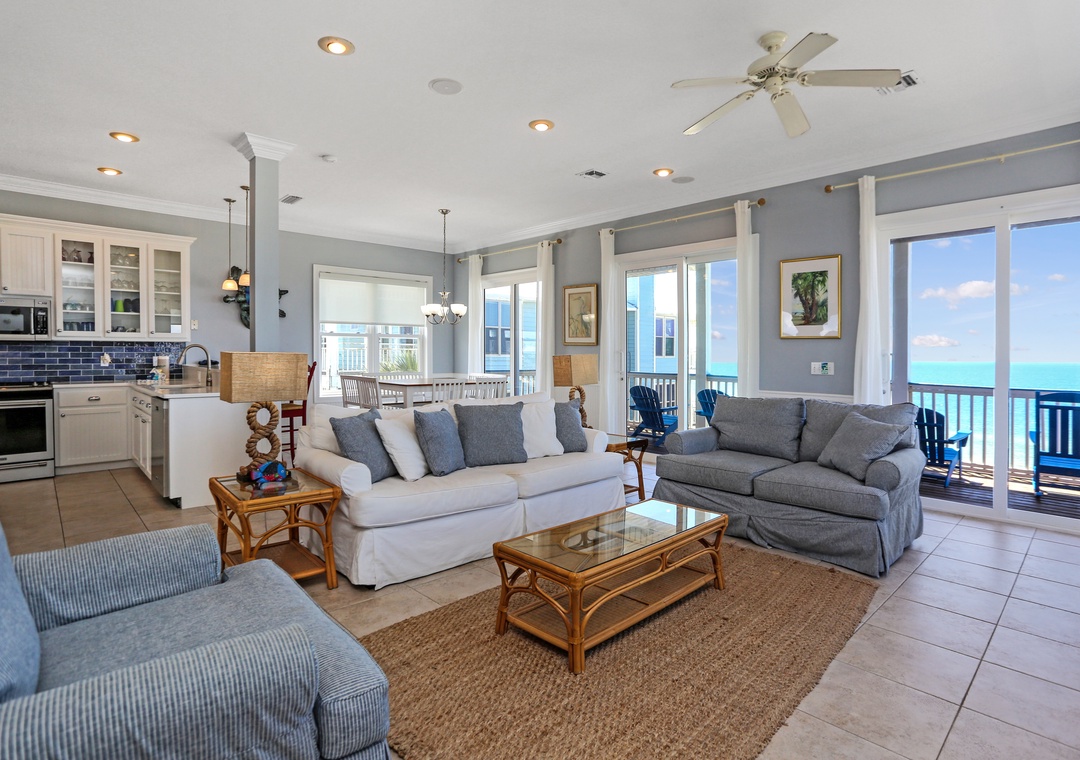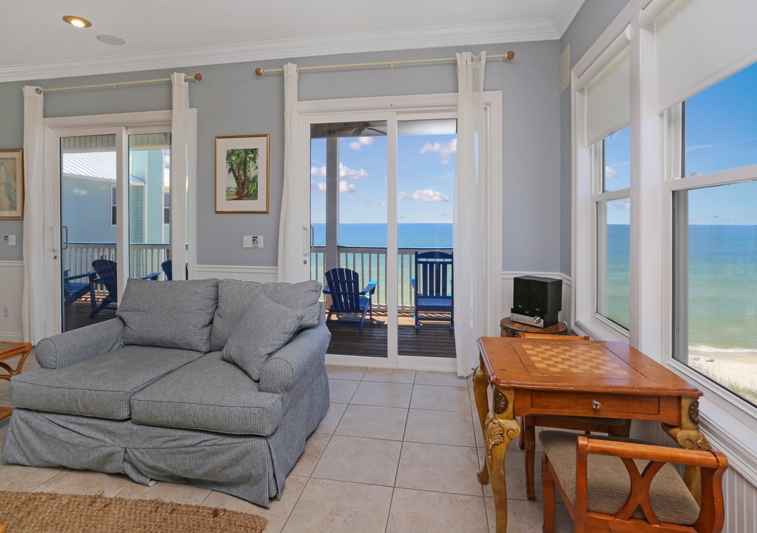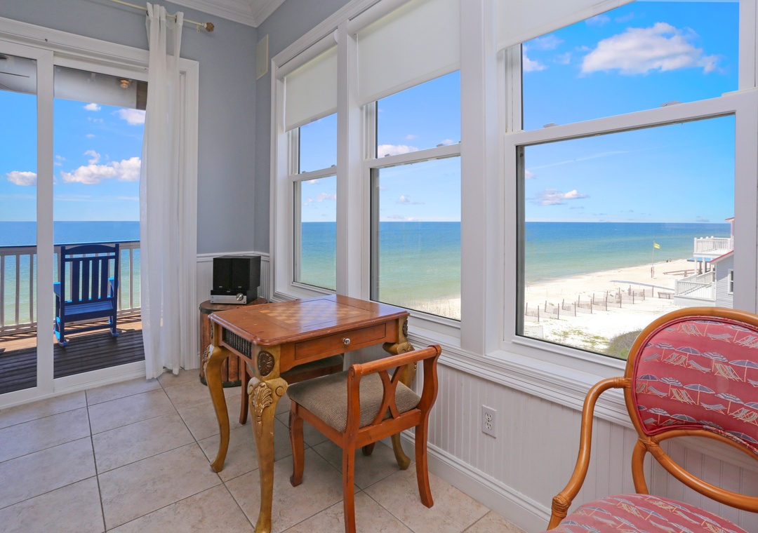 2nd Level-Kitchen, Dining, and Living Area that opens onto a gulf front balcony; Living room includes a TV, DVD/VCR, game table and sleeper sofa; Bedroom 4-1 Duo bunk bed plus a twin trundle, TV and a full bath that also connects to the living area.
