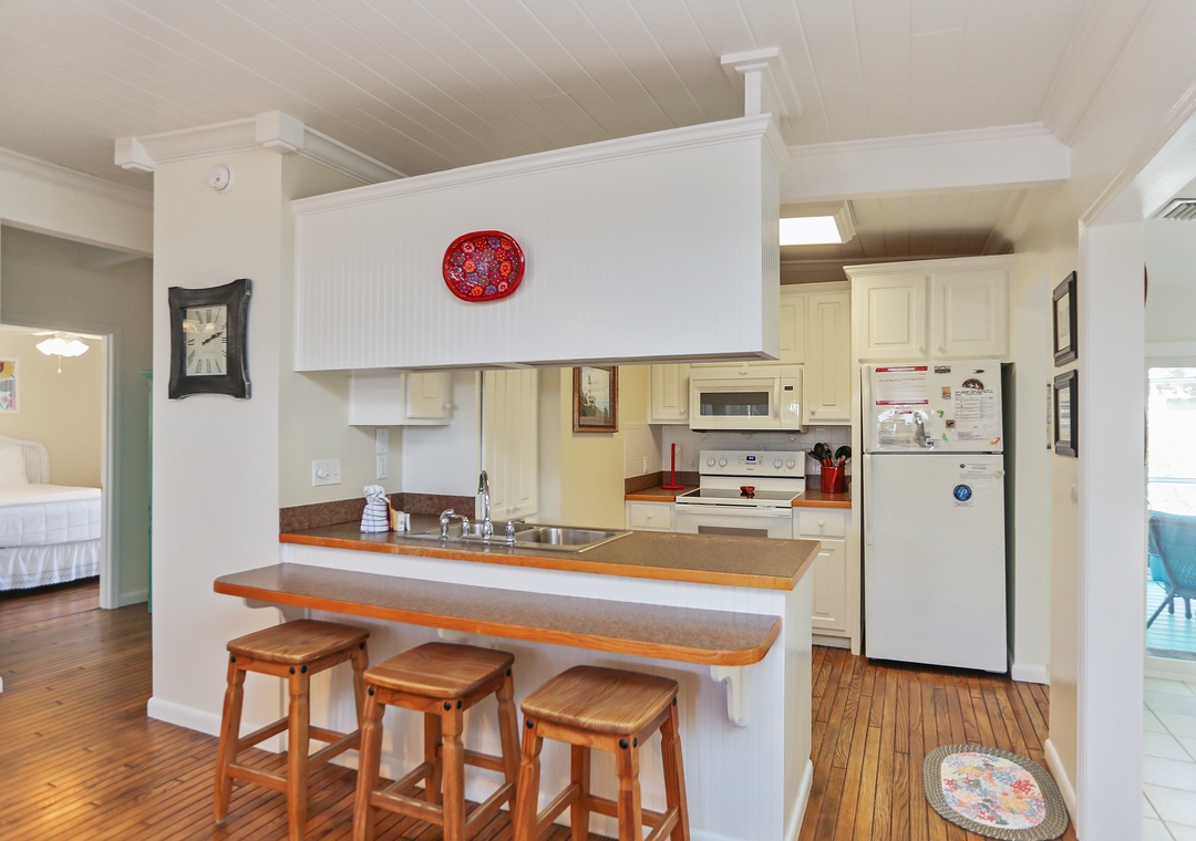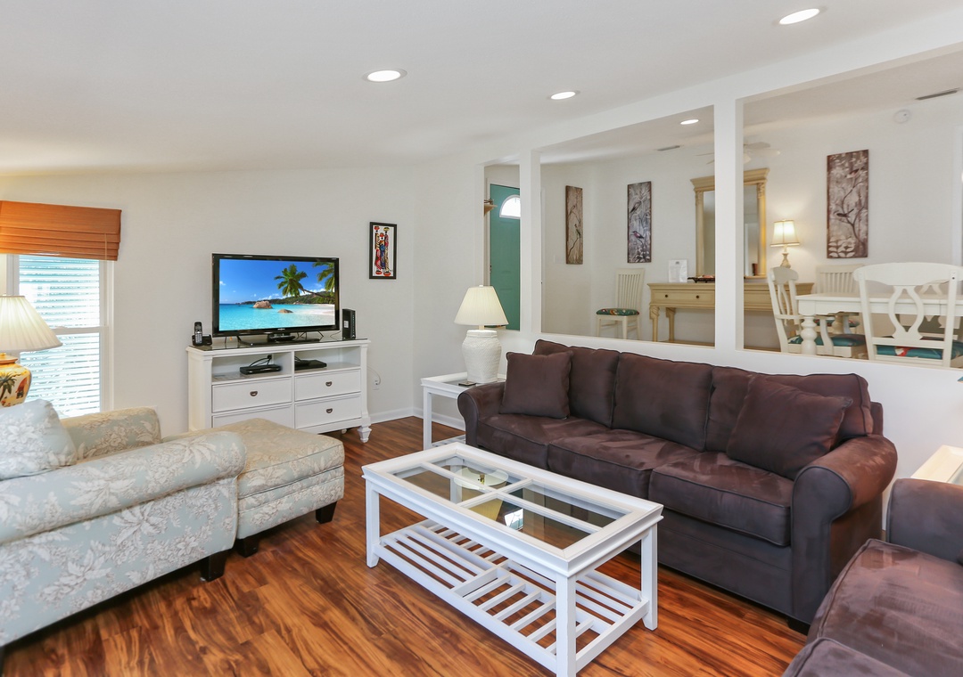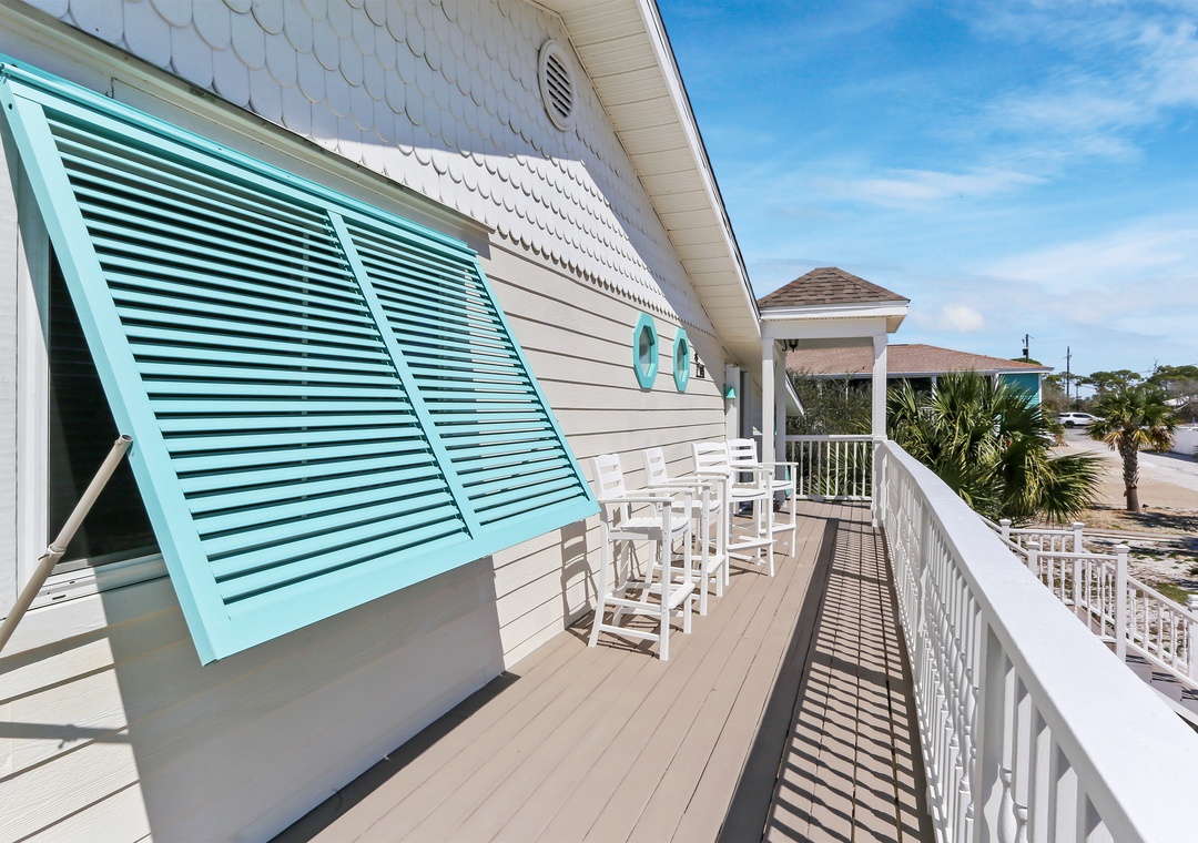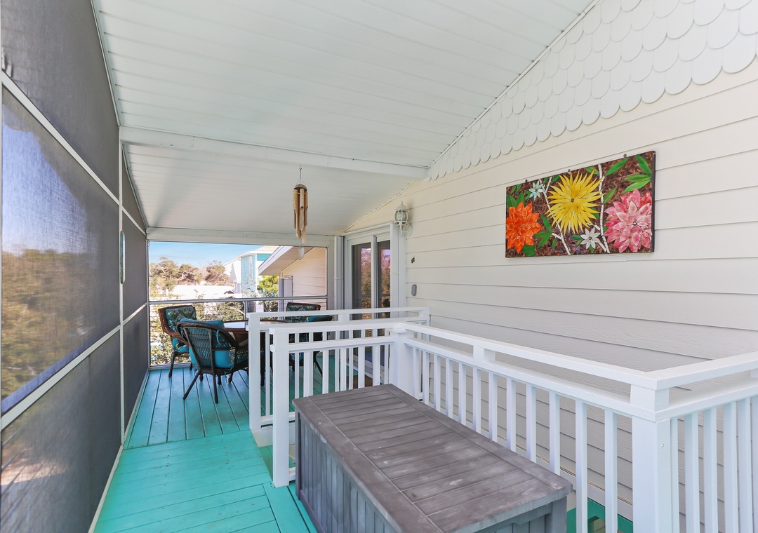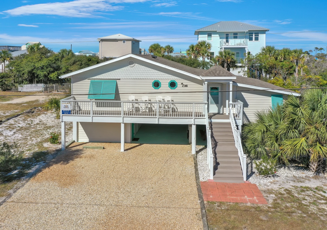 Cape Haus is a great addition to the Pristine Properties’ inventory. A very desirable feature is that it is a single level home. There is a short set of stairs to enter the home and then everything inside is all on one level. This home has a very open floor with lots of living area. With windows lining the wall in the living room it allows for a bright, naturally lit interior. The house typically rents as a 3 bedroom (see Cape Haus), one of which is semi-private and open to the living room, but Cape Haus Extra includes the addition of a 4th bedroom on the ground level with full bath. To top this home off, there is a large screened porch on the backside of the home overlooking the pool and an open deck on the front with views of the Gulf. Reasonably priced, this home has it all, gorgeous furnishings, lots of room, a short walk to the beach, a perfect combination for a great family vacation.