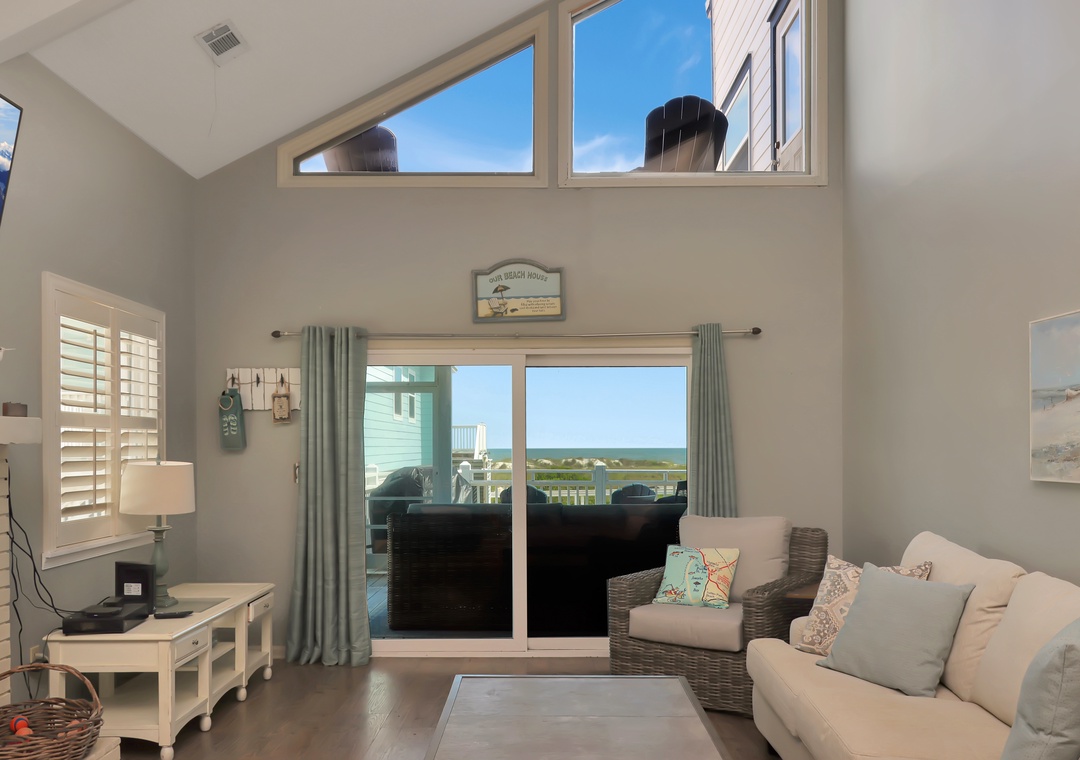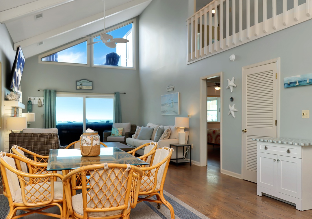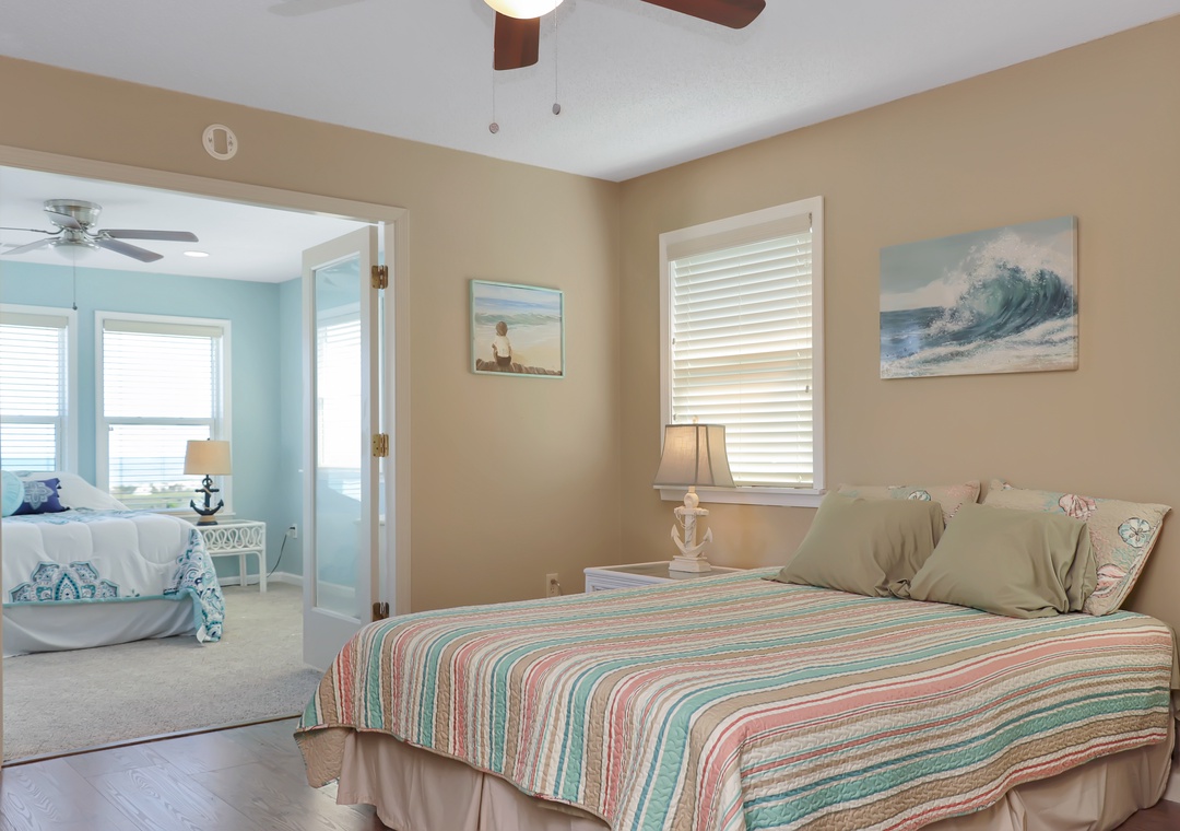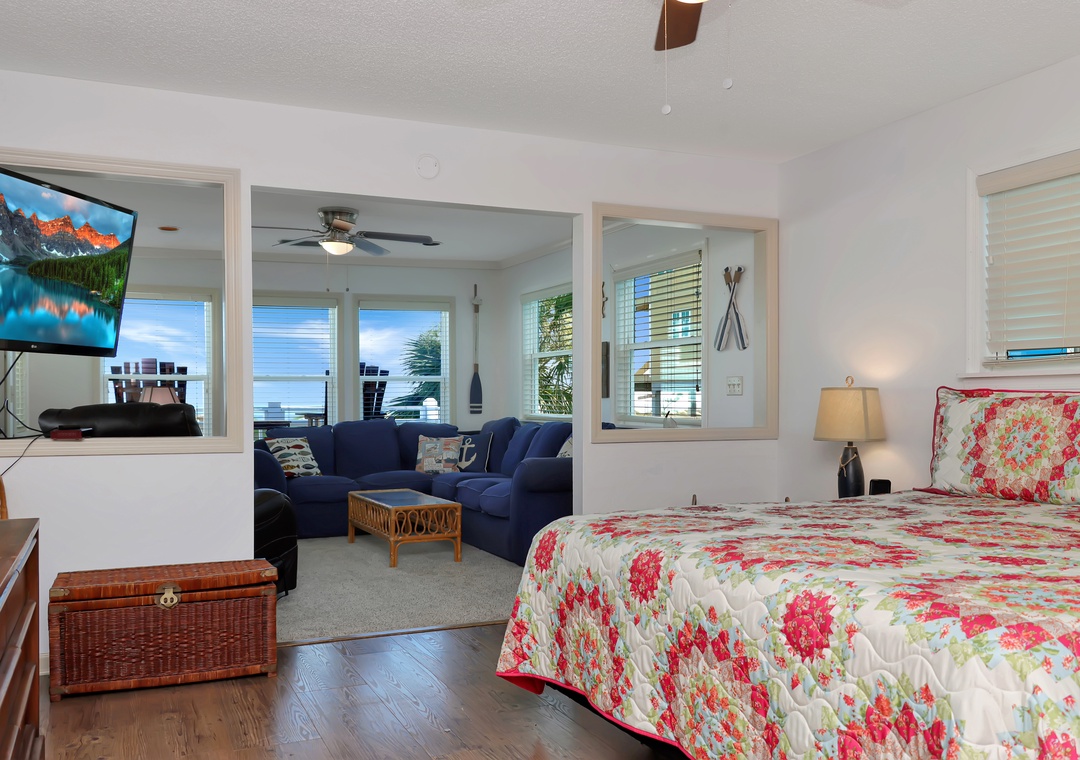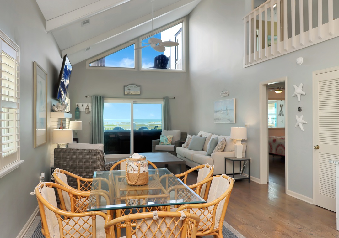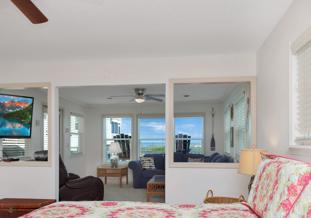 The main floor master suite is a tranquil oasis, complete with a cozy den surrounded by panoramic beach views and a sleeper sofa that opens onto the deck—a perfect nook for sipping morning coffee or evening cocktails.
