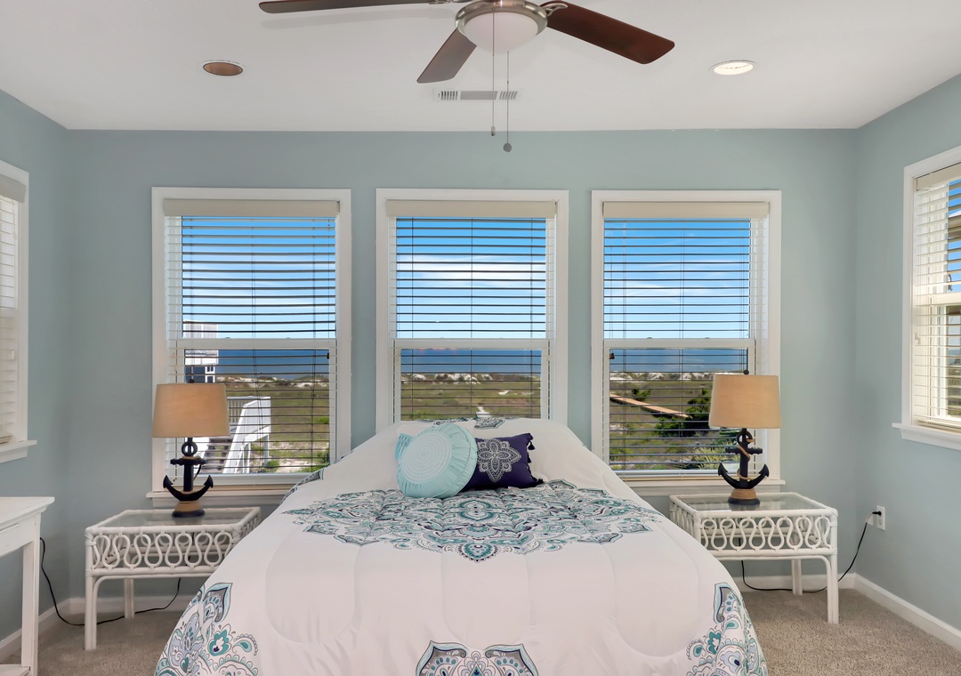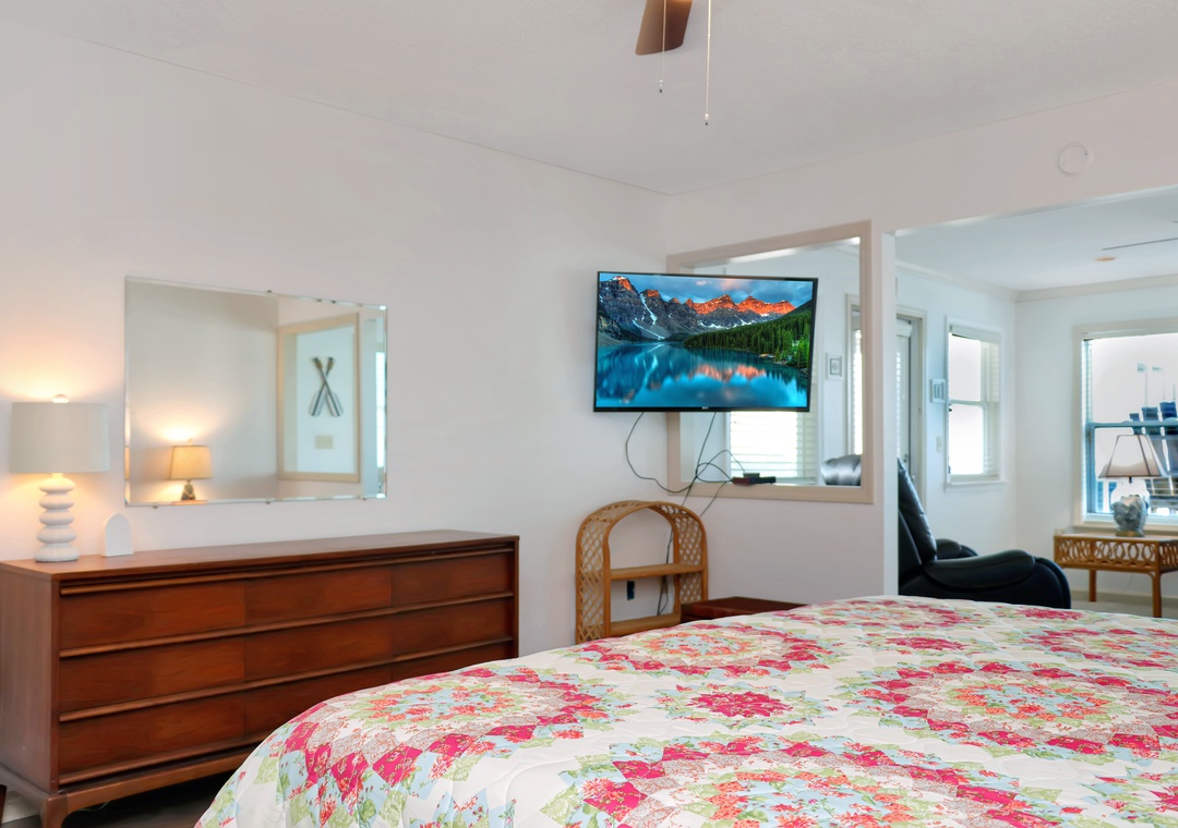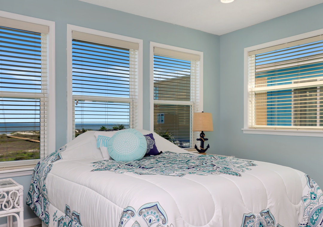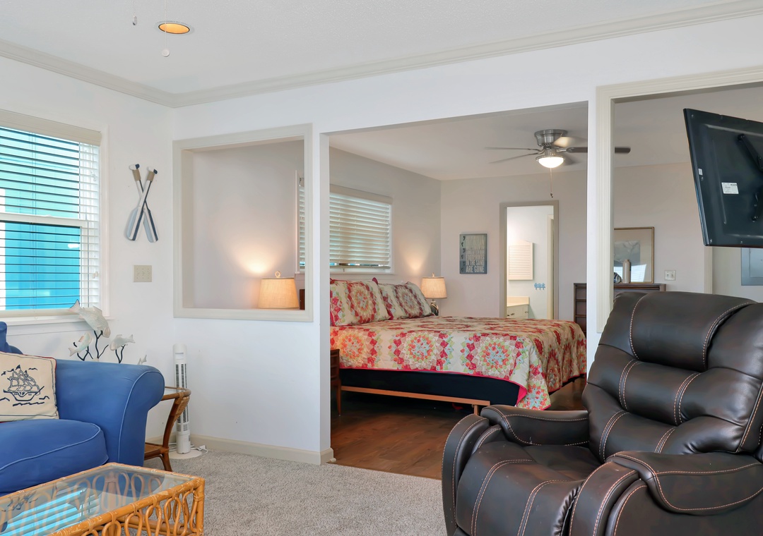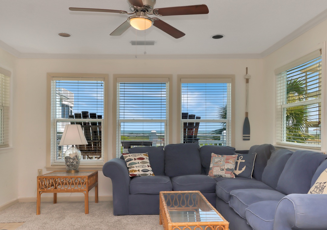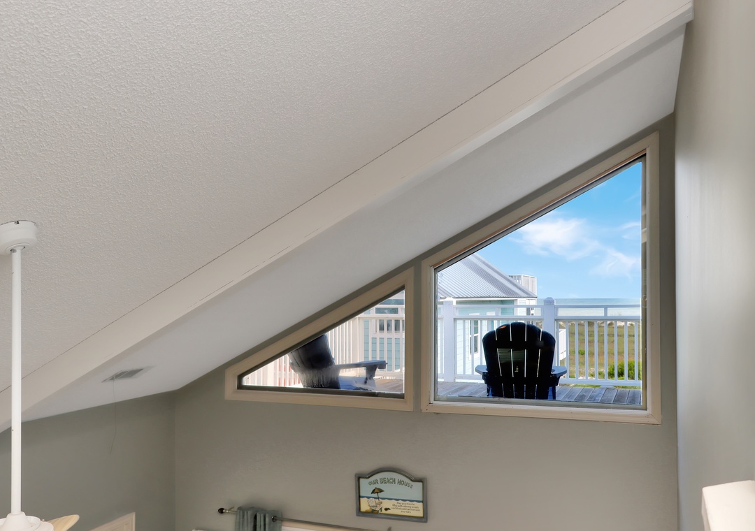 The main floor master suite is a tranquil oasis, complete with a cozy den surrounded by panoramic beach views and a sleeper sofa that opens onto the deck—a perfect nook for sipping morning coffee or evening cocktails.