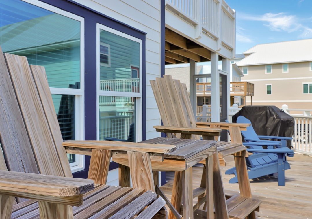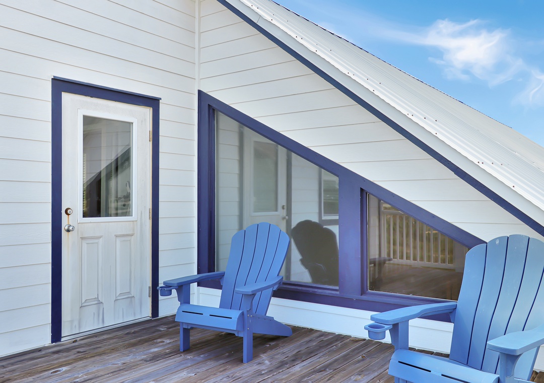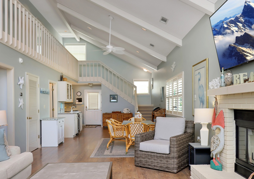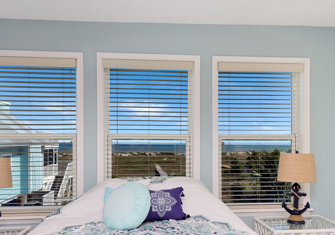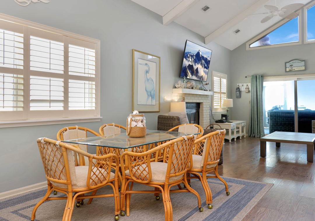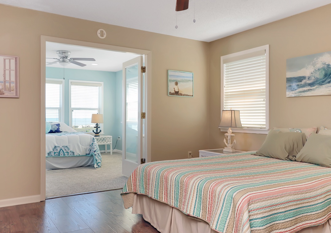 The main floor master suite is a tranquil oasis, complete with a cozy den surrounded by panoramic beach views and a sleeper sofa that opens onto the deck—a perfect nook for sipping morning coffee or evening cocktails.