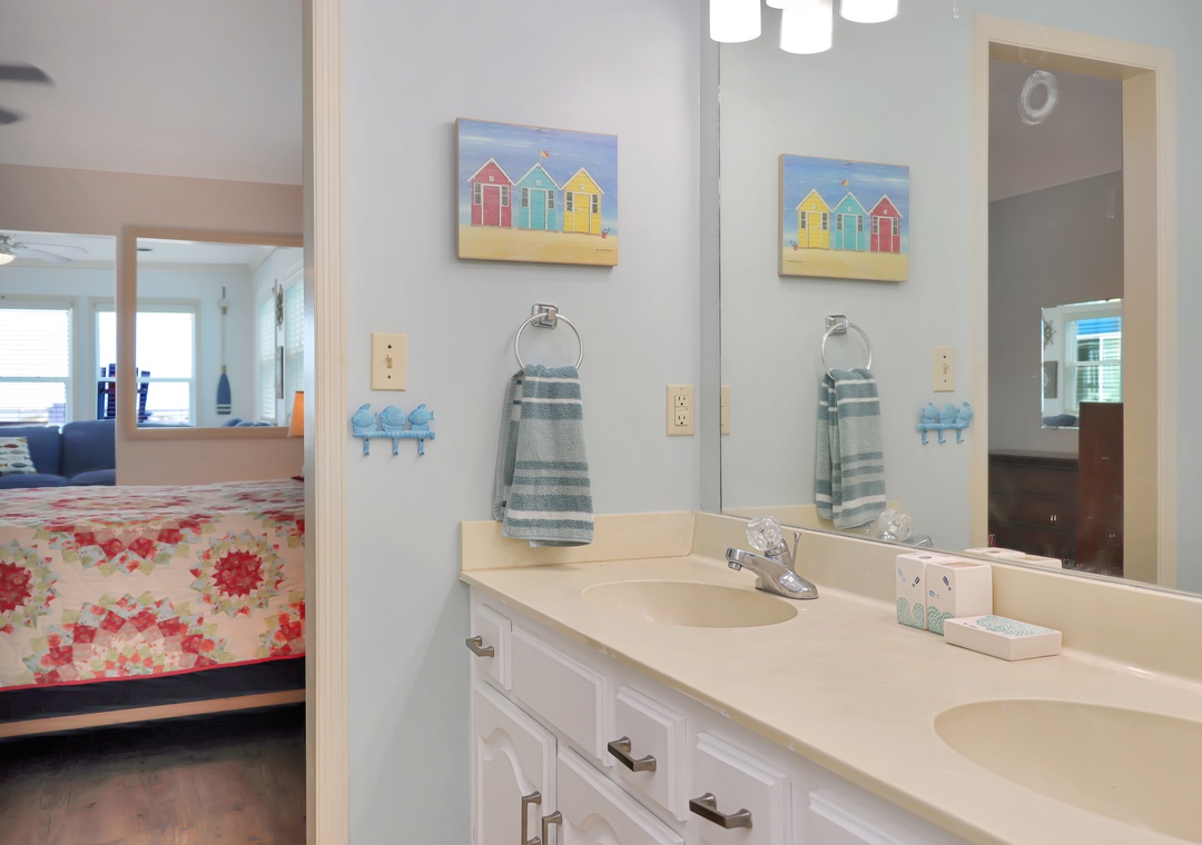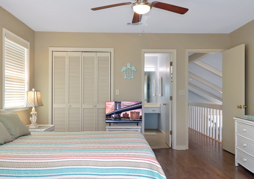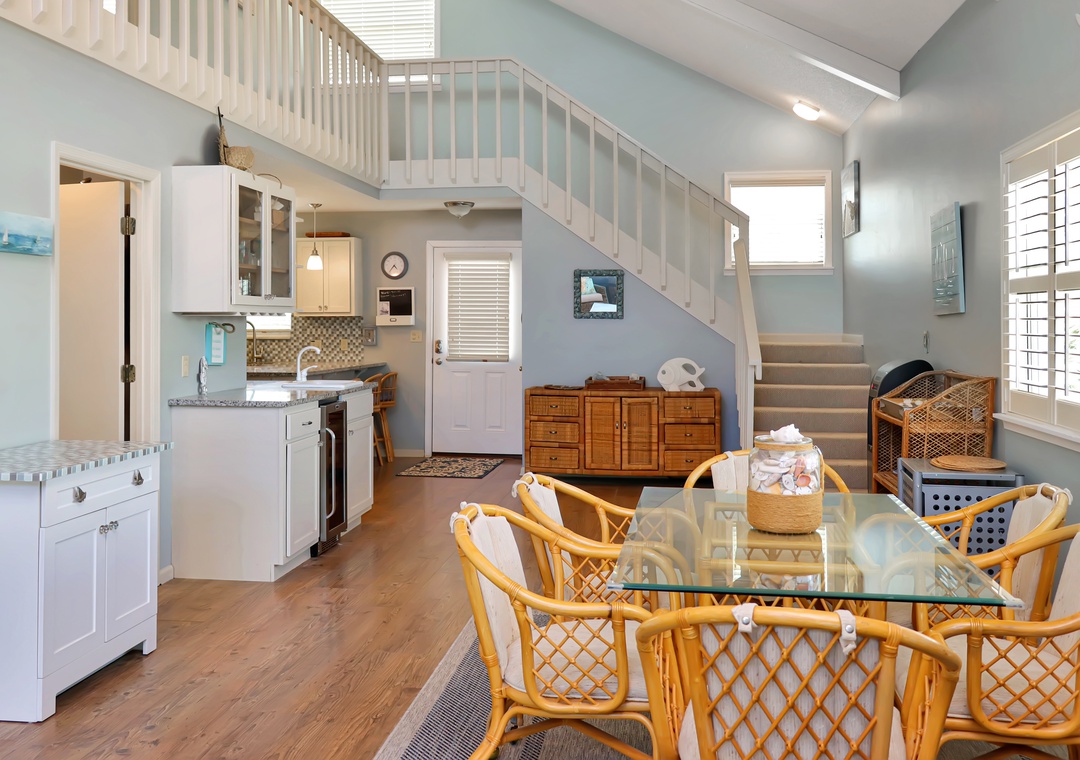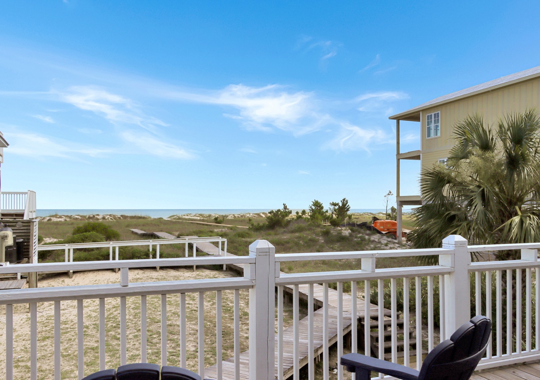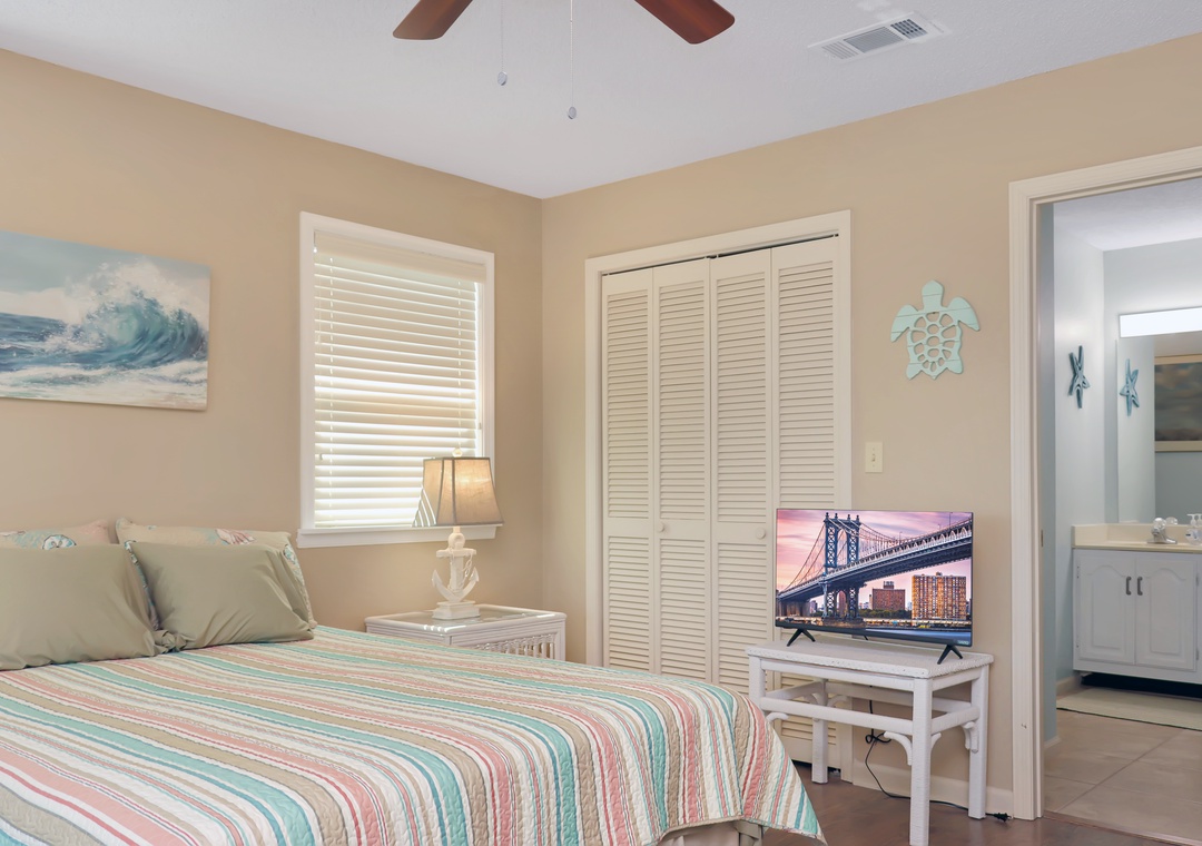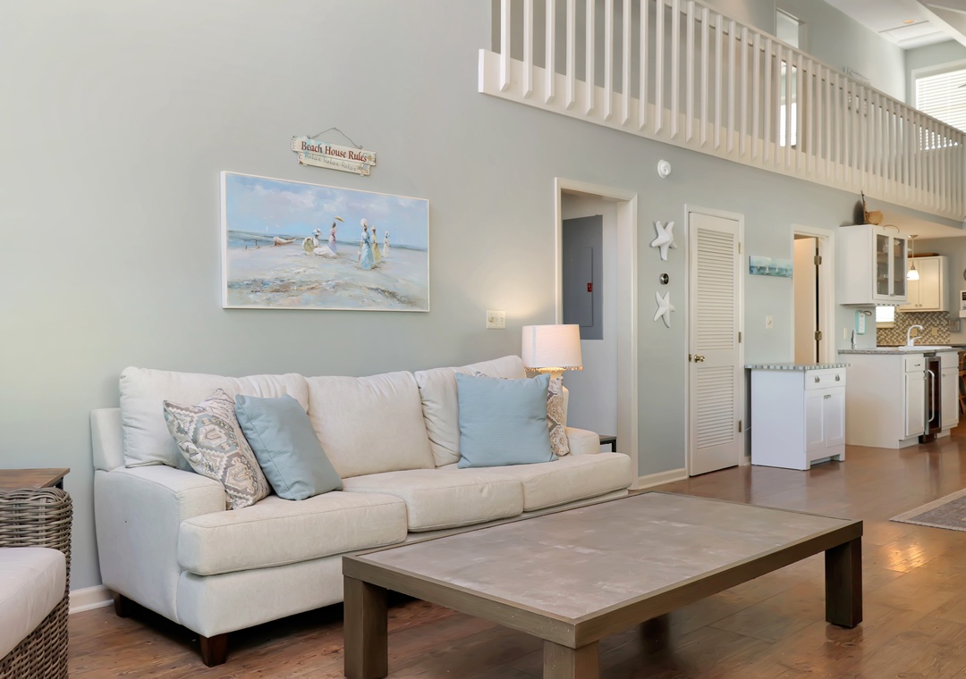The main floor master suite is a tranquil oasis, complete with a cozy den surrounded by panoramic beach views and a sleeper sofa that opens onto the deck—a perfect nook for sipping morning coffee or evening cocktails.