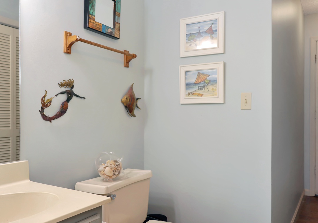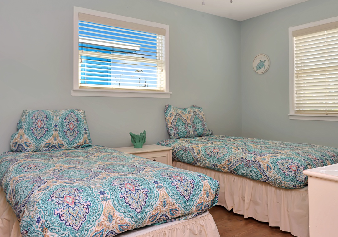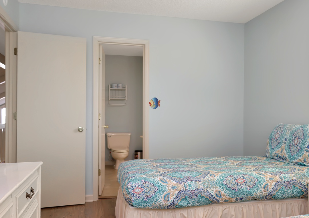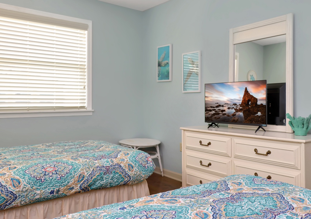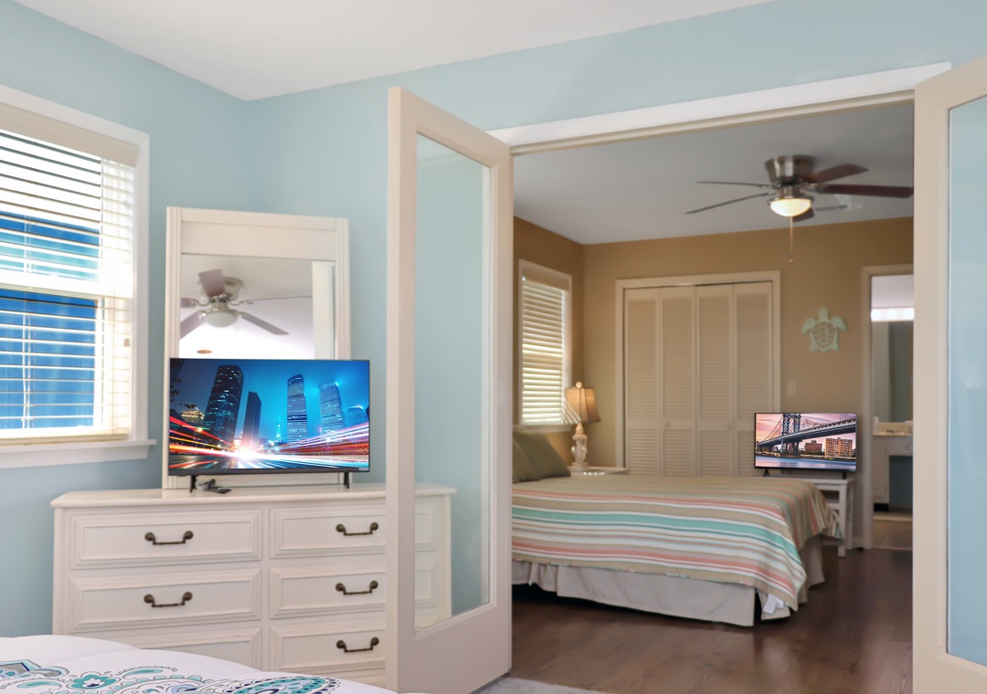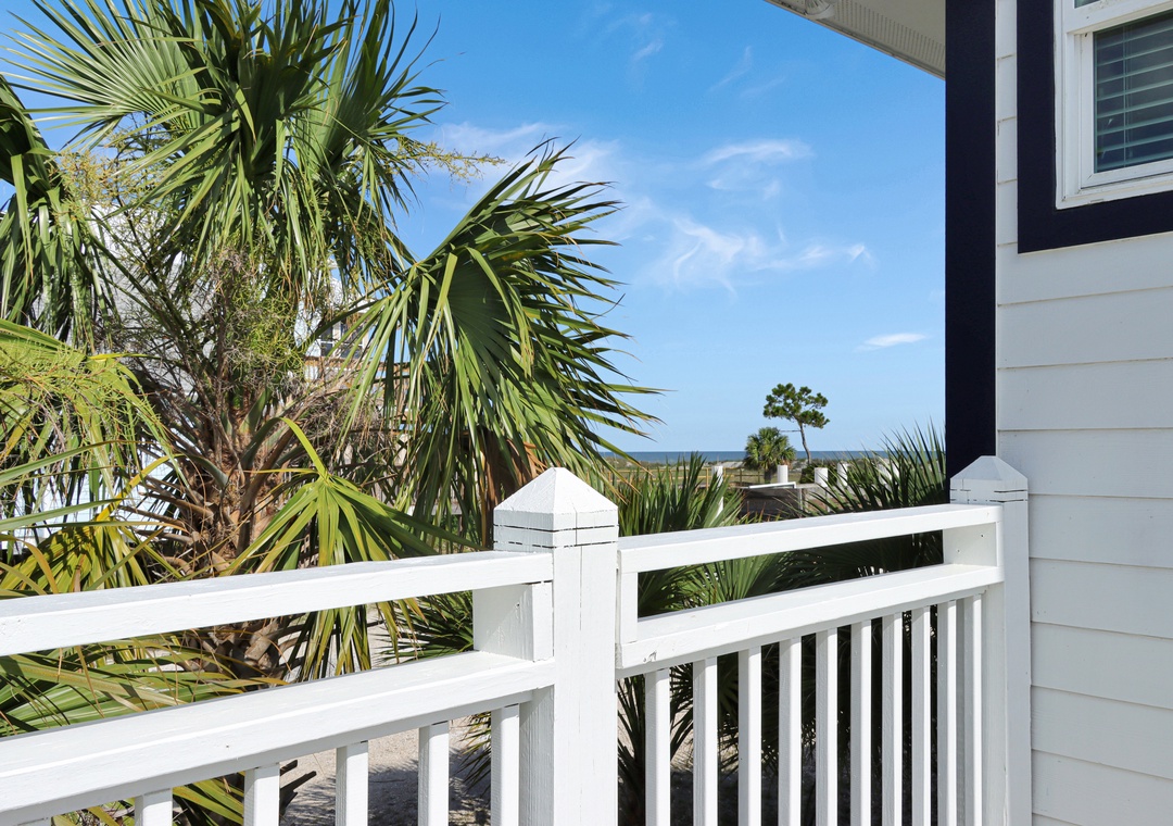 The main floor master suite is a tranquil oasis, complete with a cozy den surrounded by panoramic beach views and a sleeper sofa that opens onto the deck—a perfect nook for sipping morning coffee or evening cocktails.