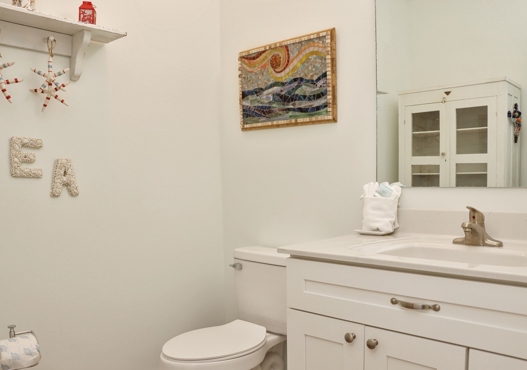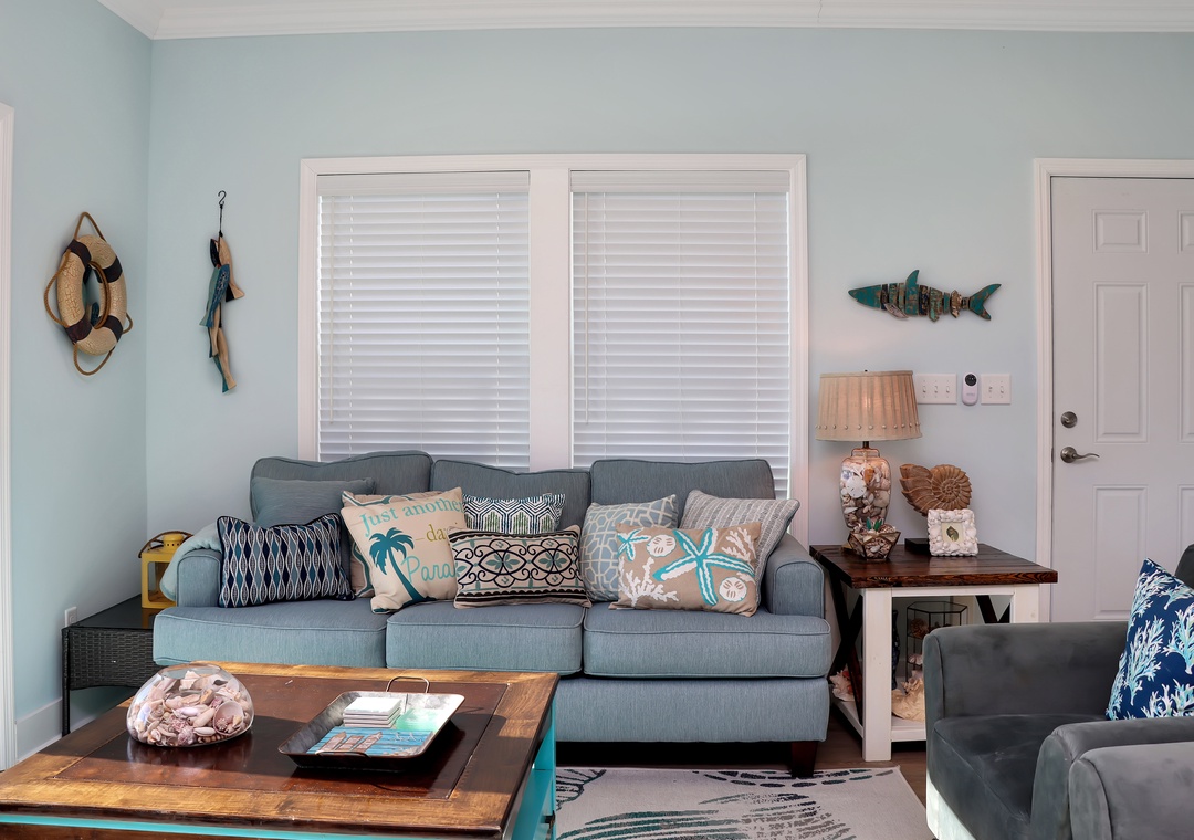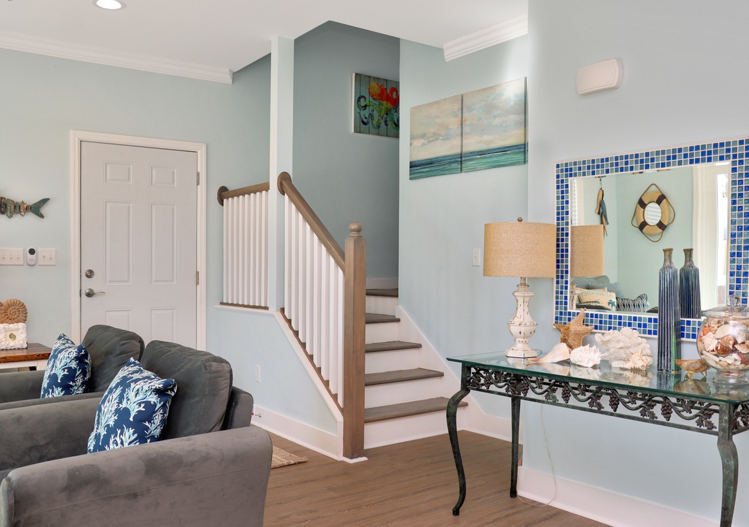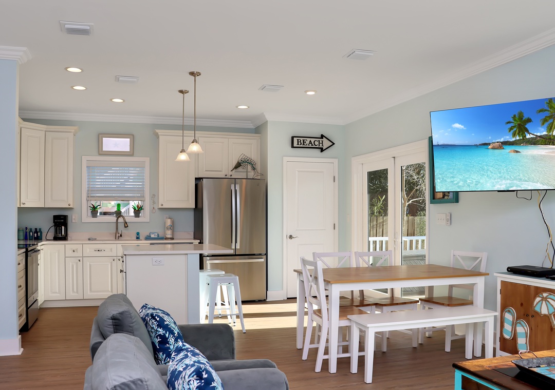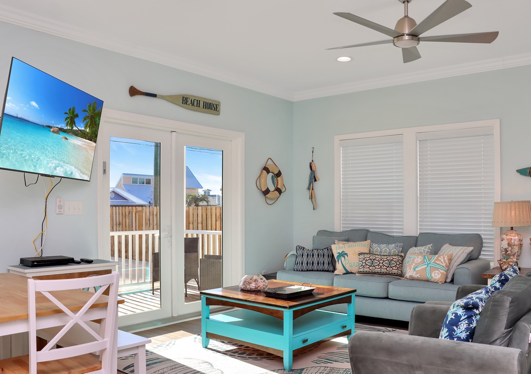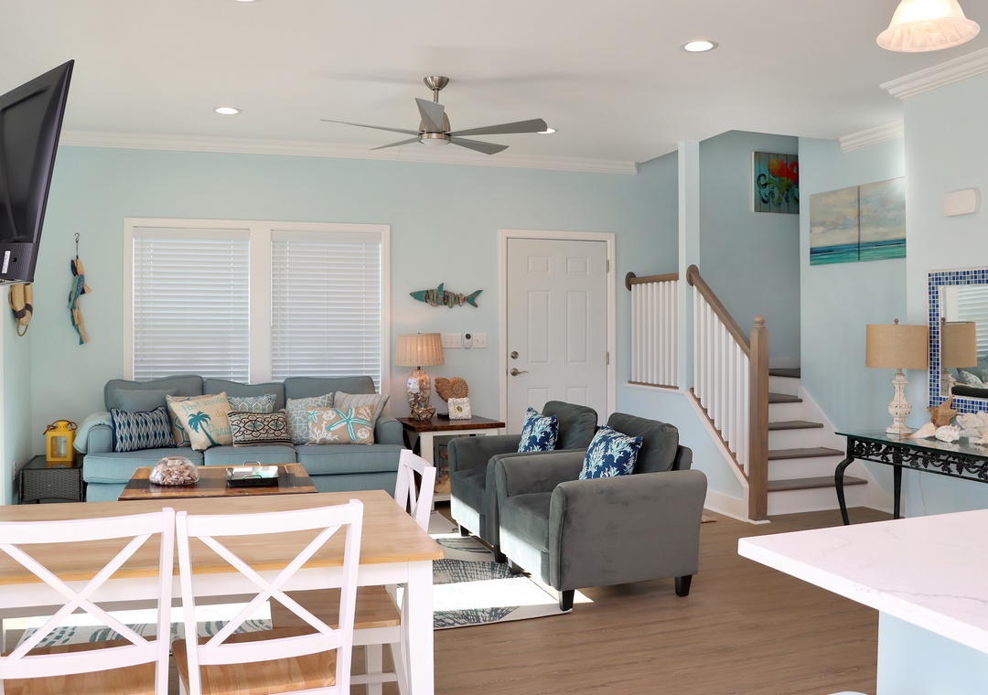 Situated in a serene neighborhood, this charming vacation rental is an ideal escape for families or groups seeking the ultimate beach getaway. As you approach, the vibrant hues of the coastal exterior welcome you to your home away from home.