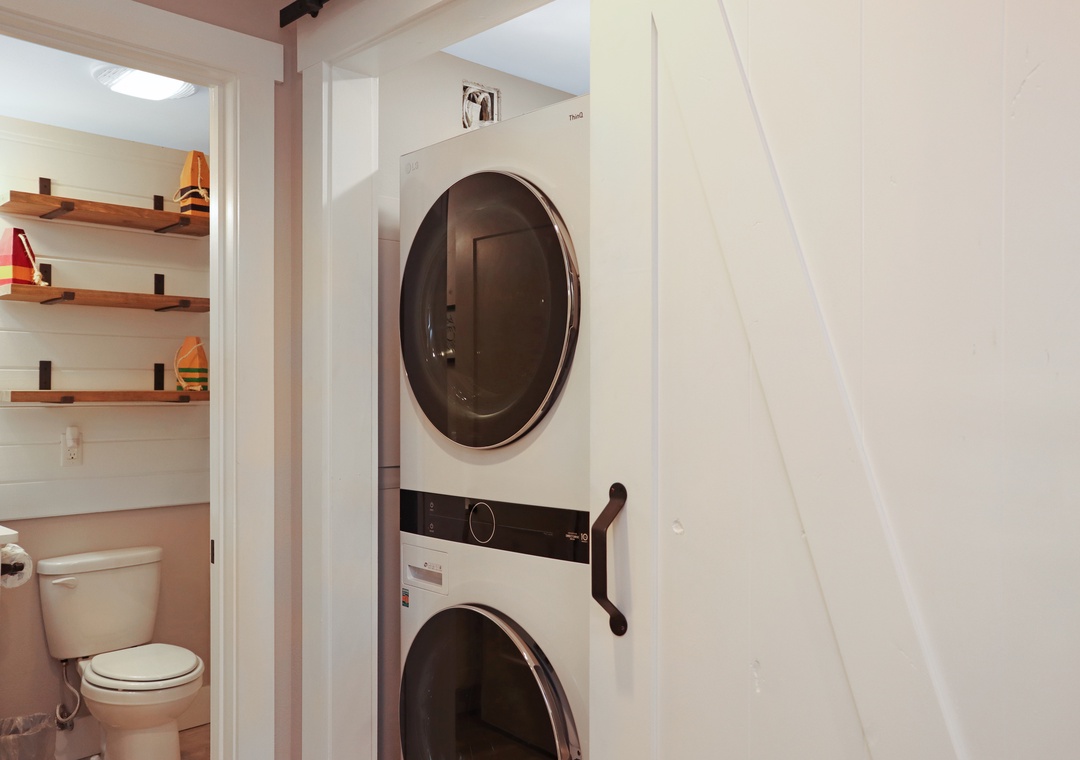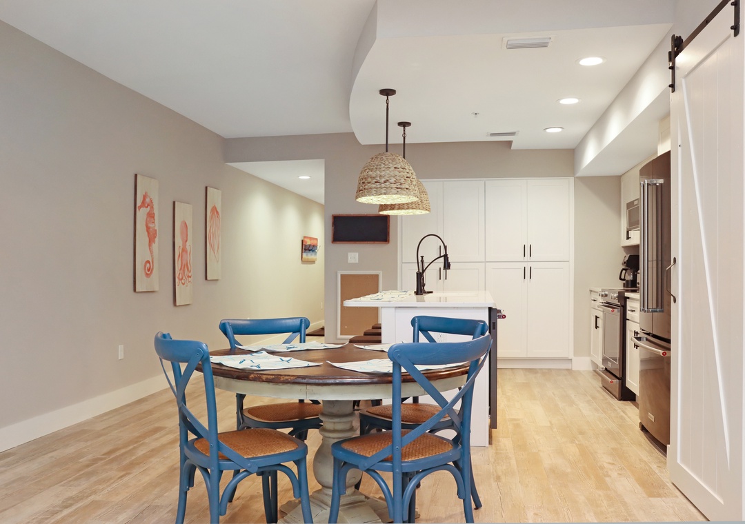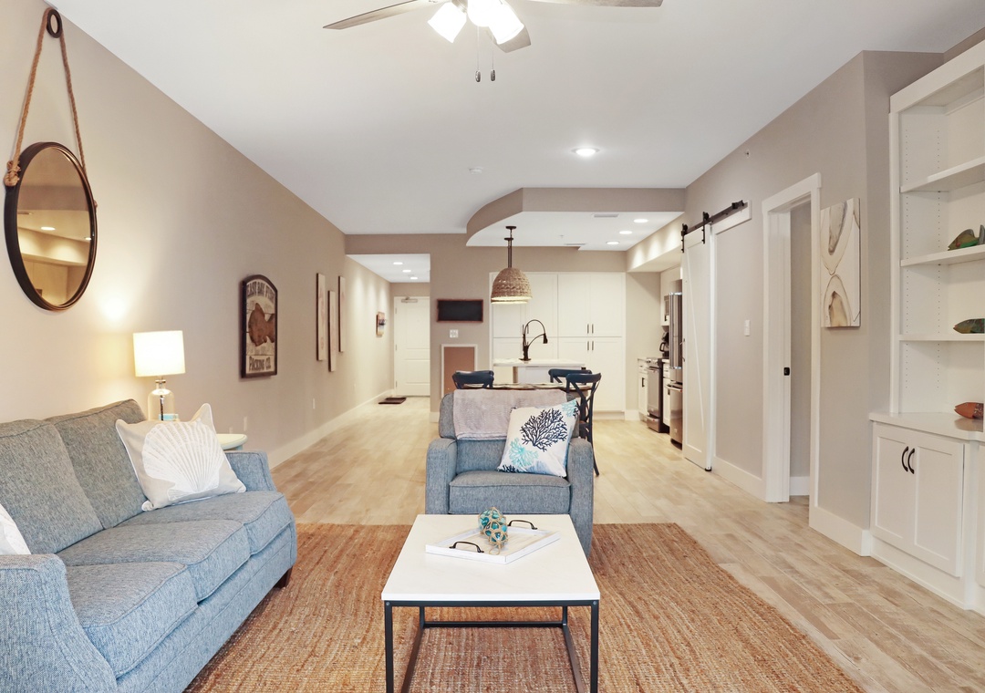 Crafted with an eye for design, the unit showcases a unique floor plan that stands out from its peers. Barn doors slide open to reveal a smart, space-maximizing layout bathed in natural light. Step into the first-floor unit—easily accessible by stairs or elevator—and discover a one-story oasis of relaxation. A welcoming front hallway introduces two cozy bedrooms, a full bath, and a convenient laundry closet. Journey further to find a grand open living area, where an airy kitchen featuring a bar island with seating for four blends seamlessly into a dining space and a generous living room. Here, sliding glass doors fold accordion-style, merging the indoors with the outdoors on a spacious, covered deck.