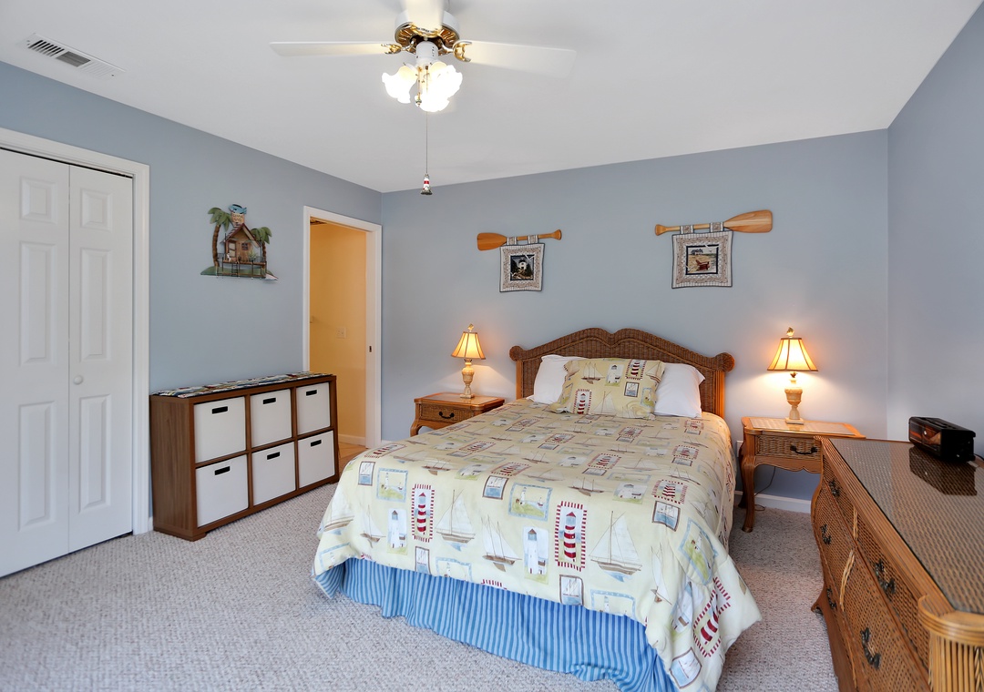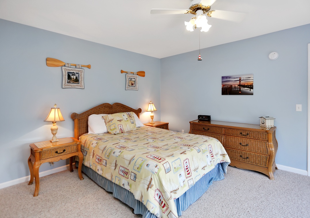 VERY CLOSE TO ONE OF THE MOST PRIVATE BEACHES IN THE AREA. This is a very large 2 bedroom 2 bath home with an extra loft for sleeping and 2 separate living areas. The living room, dining room, kitchen and both bedrooms are on the first level with a large loft living and sleeping area upstairs. There is a screened in porch and 2 sun decks. Beautiful water views from every room of the house. The home is decorated in a coastal light house theme and is quite charming.