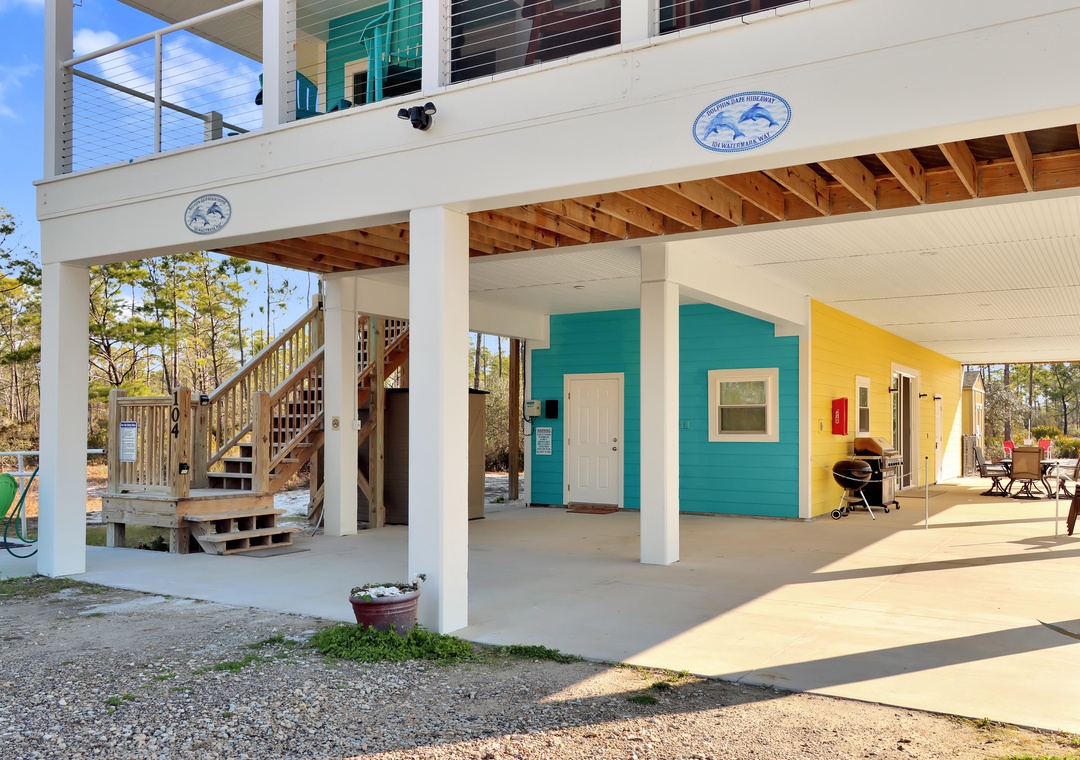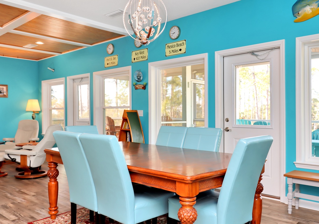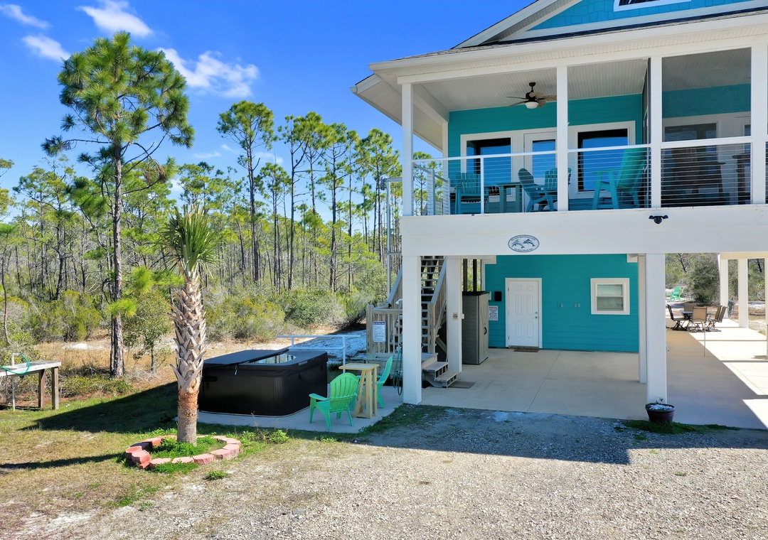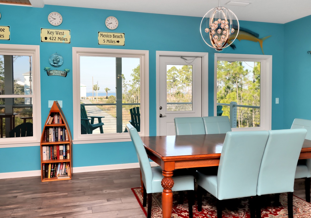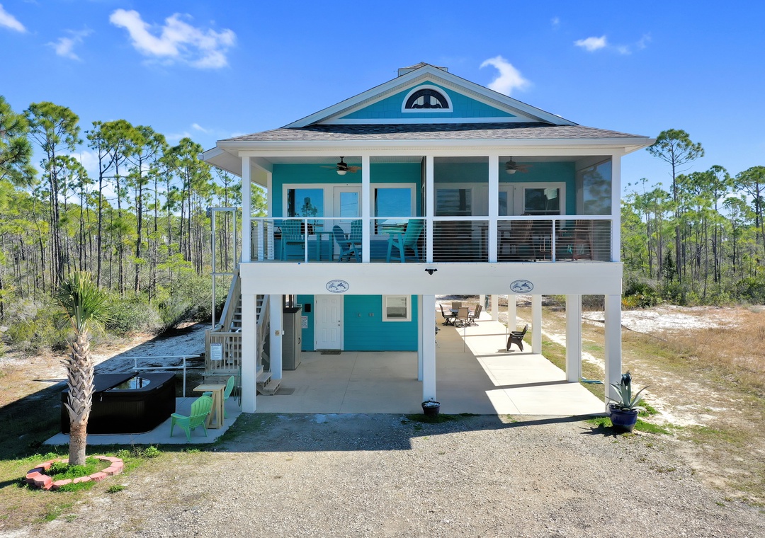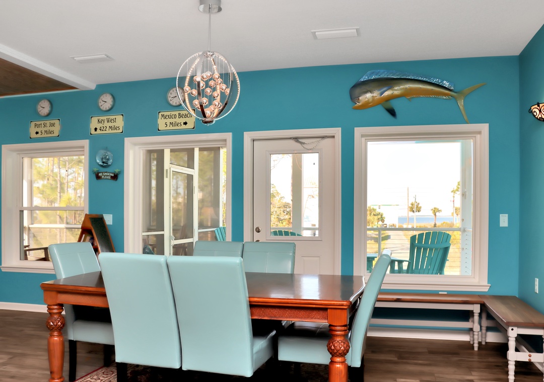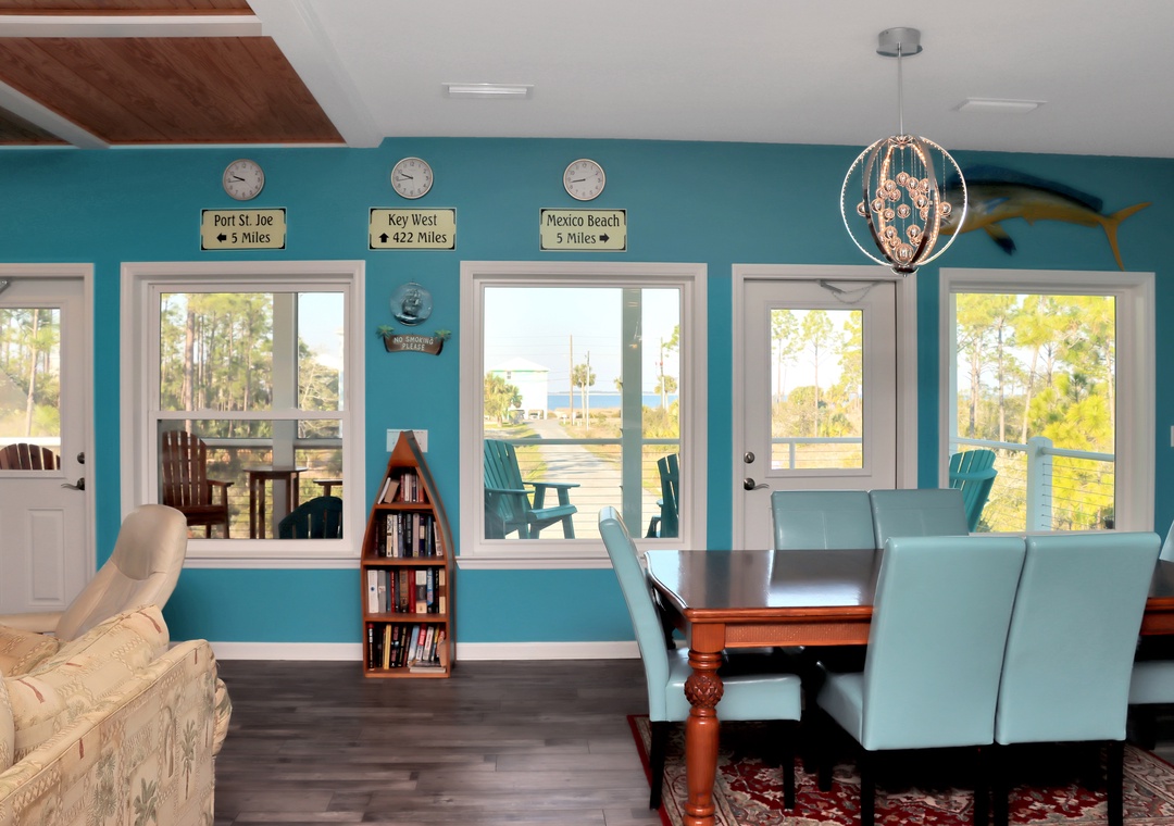 Dolphin Daze Beach House is a 6-bedroom, 4.5-bath vacation rental home located midway between Mexico Beach and Port St. Joe on the Forgotten Coast. It comfortably accommodates a party of up to 16. Because this beach house sits a half mile off Highway 98, there is little traffic to fuss with being on a short, dead-end street. It is located directly on the Bay Beach Bicycle Trail, with over 2 miles of conservation beach to serve as your private buffer from the noise and crowds.