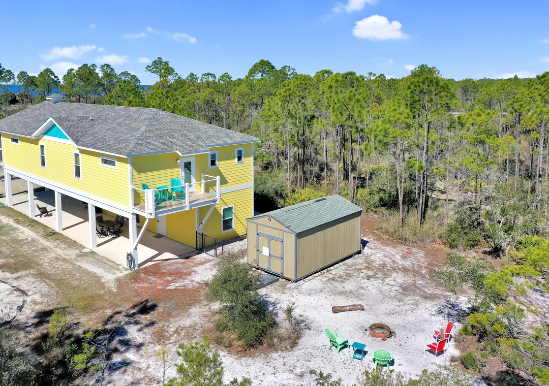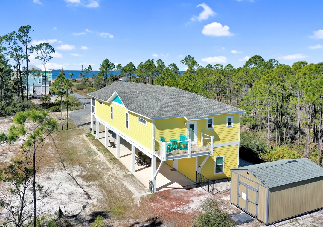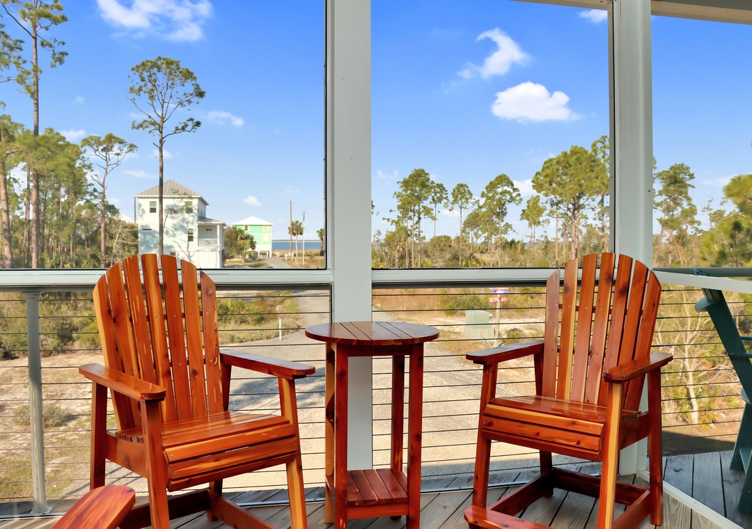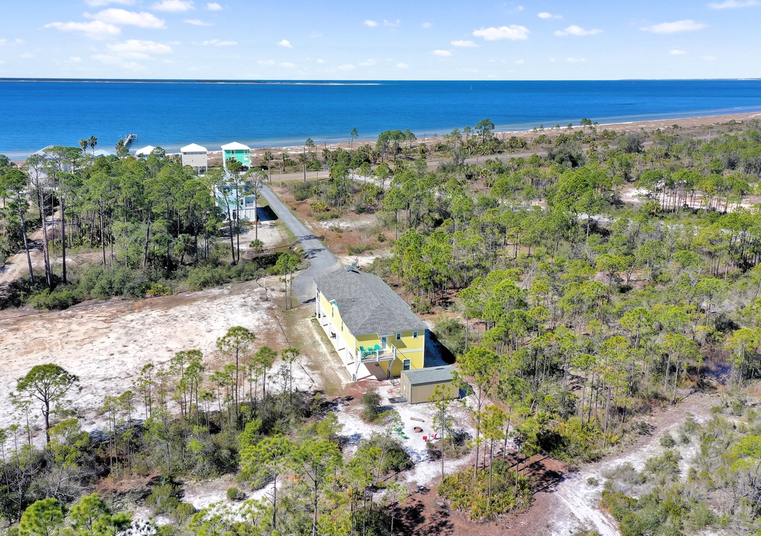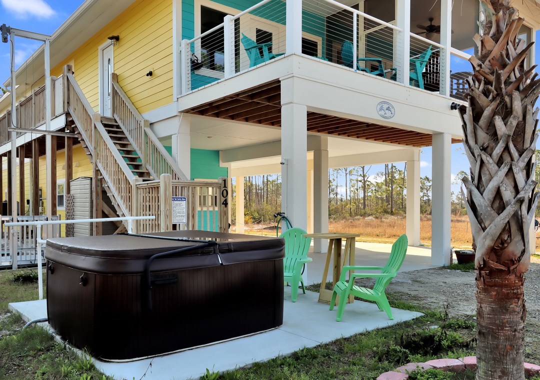 Beautiful views of the bay, the sun setting over the gulf, and Cape San Blas from the screened porch are complimented by stained glass and antique nautical decor, with screen and open porches. You have 2 bedrooms on the ground floor, a kitchen, and 2 full baths completely separate from the upstairs. Once upstairs, you'll find the other 4 bedrooms and 2.5 baths, a kitchen, various decks, and a screened porch. The upstairs can be accessed by a lift instead of the need to climb stairs that are available for use during your stay. As a convenience to pet owners, this pet friendly home has a small fenced area in the backyard. There is also a hot tub, fire pit, grilling area, and fish cleaning station for outdoor entertainment.