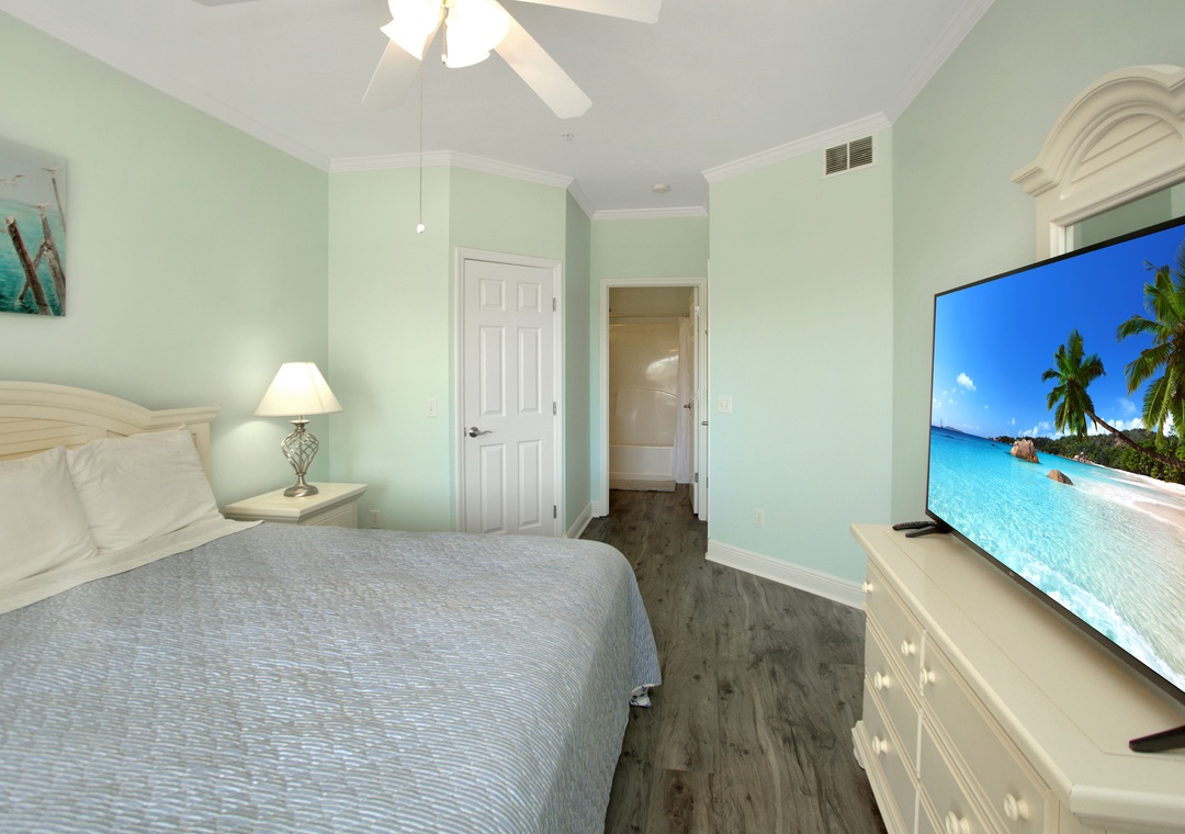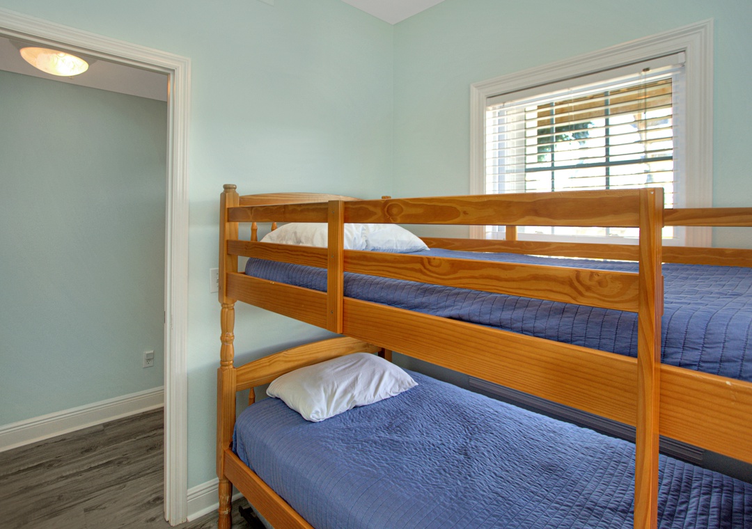 Floor Plan: 1st level- Bedroom 1 – bunk set with twin trundle, Bedroom 2 – queen bed, TV, and full bath that connects to the hallway; a full size laundry room, large kitchen, dining area, Bedroom 3 – gulf front master bedroom with balcony entrance, king bed, TV and full bath with double vanities and tub/shower combo; and a gulf front living room with a flat screen TV and gulf front balcony with outdoor dining furniture and private stairs that lead down to the pool area.