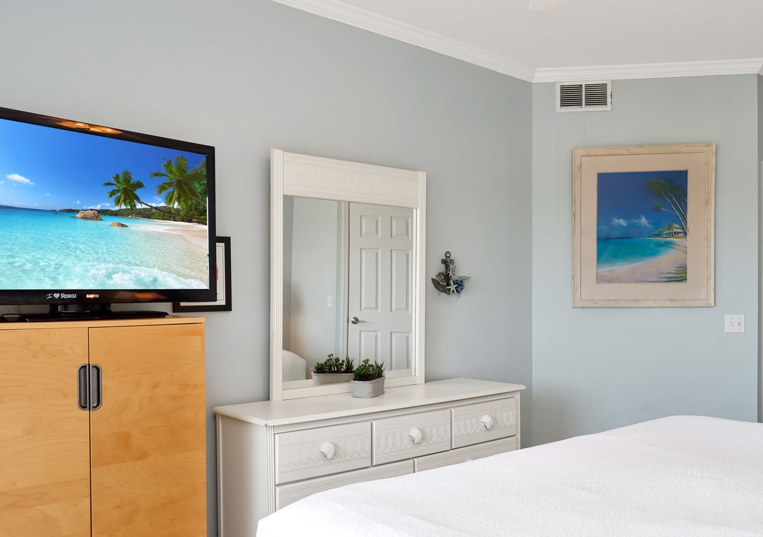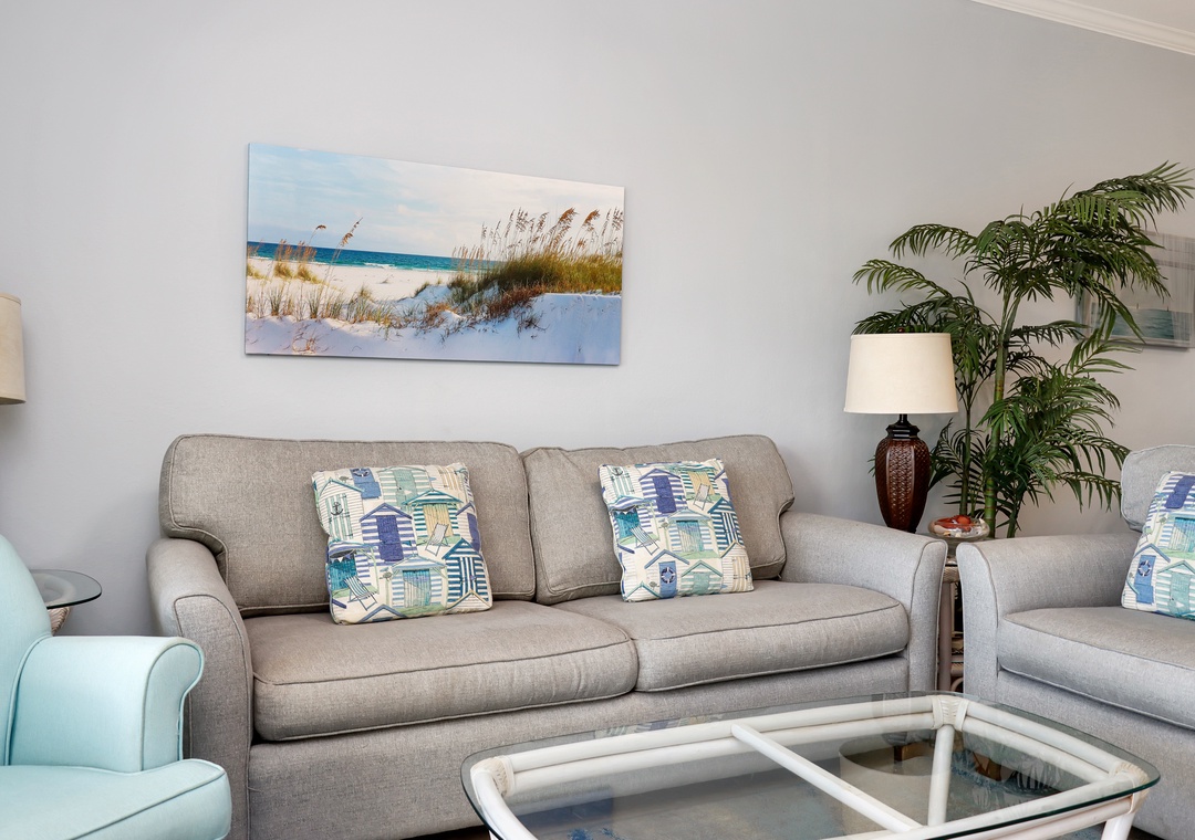 Click Here To Learn More!Floor Plan: Kitchen, dining area and gulf front living room with sleeper sofa, TV and DVD/VCR; Bedroom 1-gulf front, master bedroom with king bed, TV, walk-in closet and full bath; Bedroom 2-queen bed, TV and semi-private full bath; Bedroom 3-twin bed and TV; and full size laundry room.