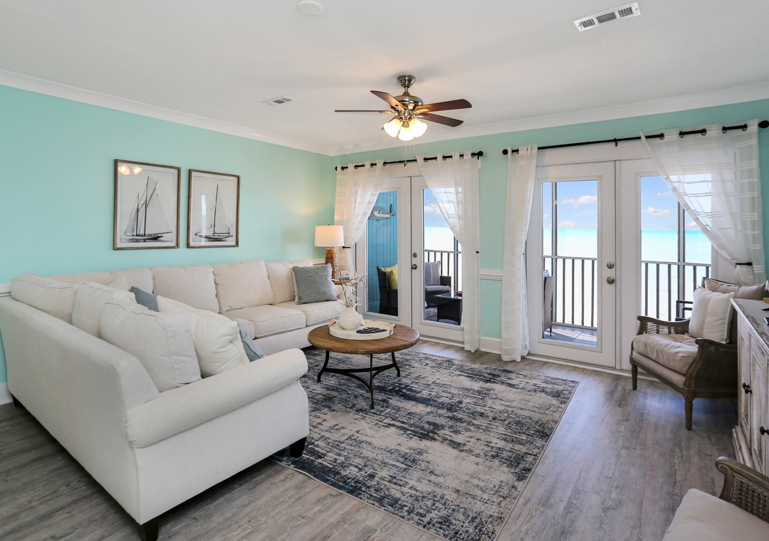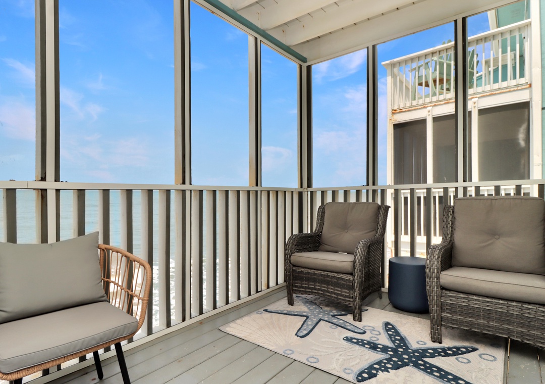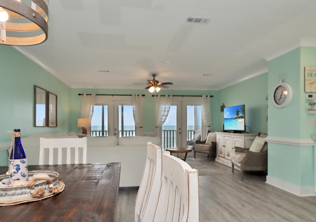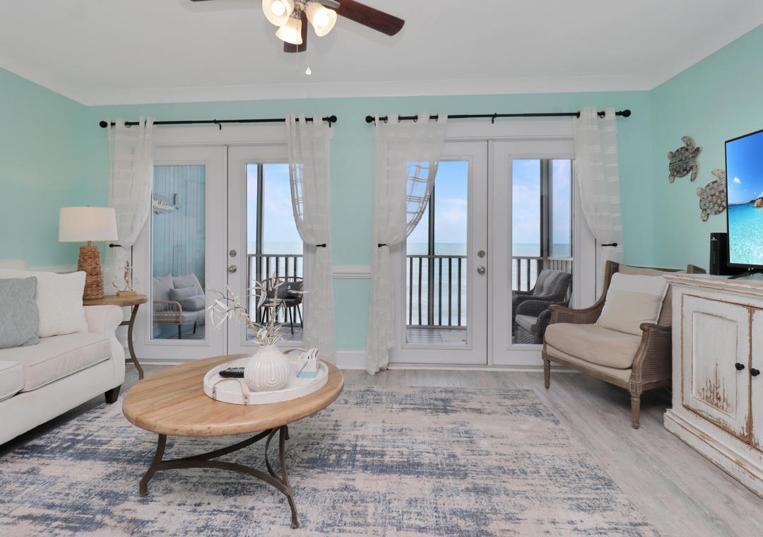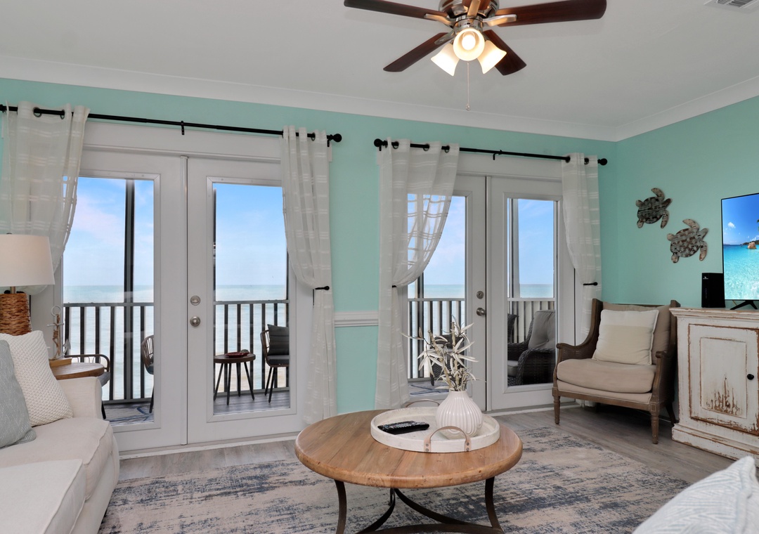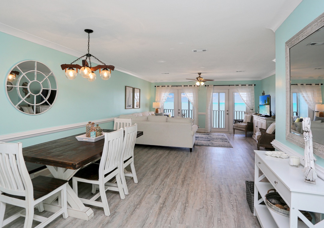 Inside this beautiful unit, the decor is bright and airy, helping maintain those beach vacation vibes. The first floor consists of the main living area—an open space including the kitchen, dining area, and living room, all with incredible beach views. From the gulf front living room, you can access the screened deck furnished comfortably to enjoy the sound of the gulf waves.