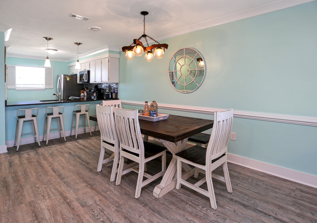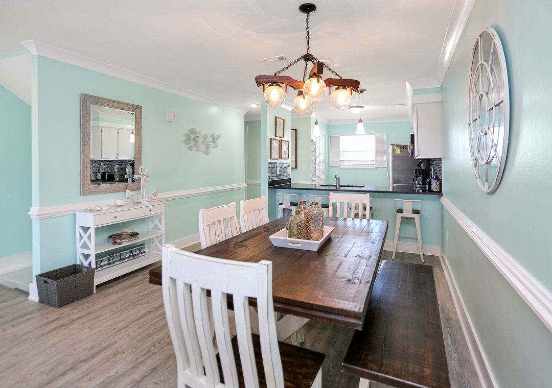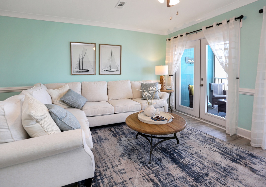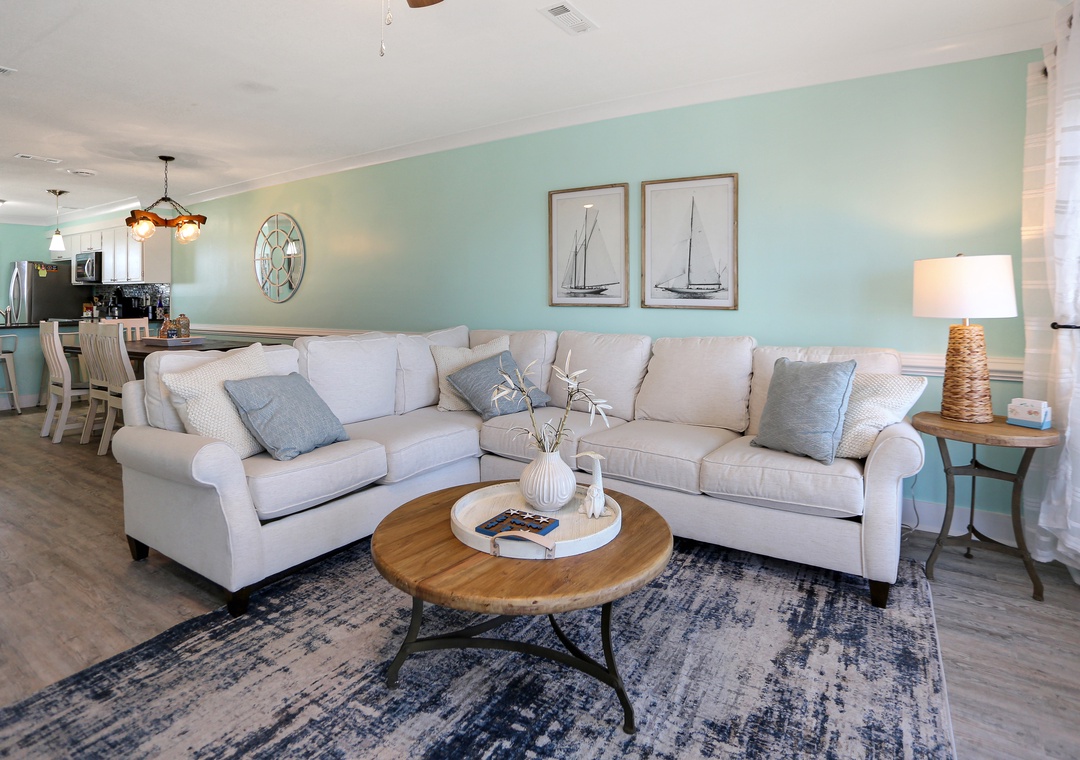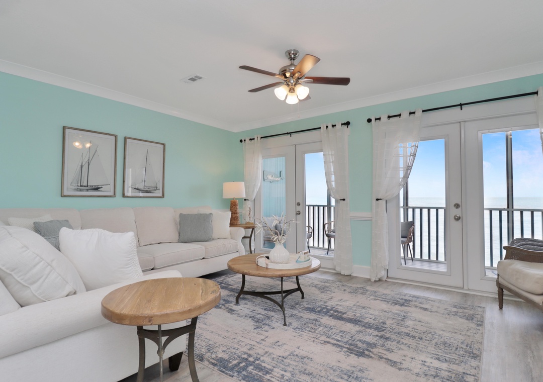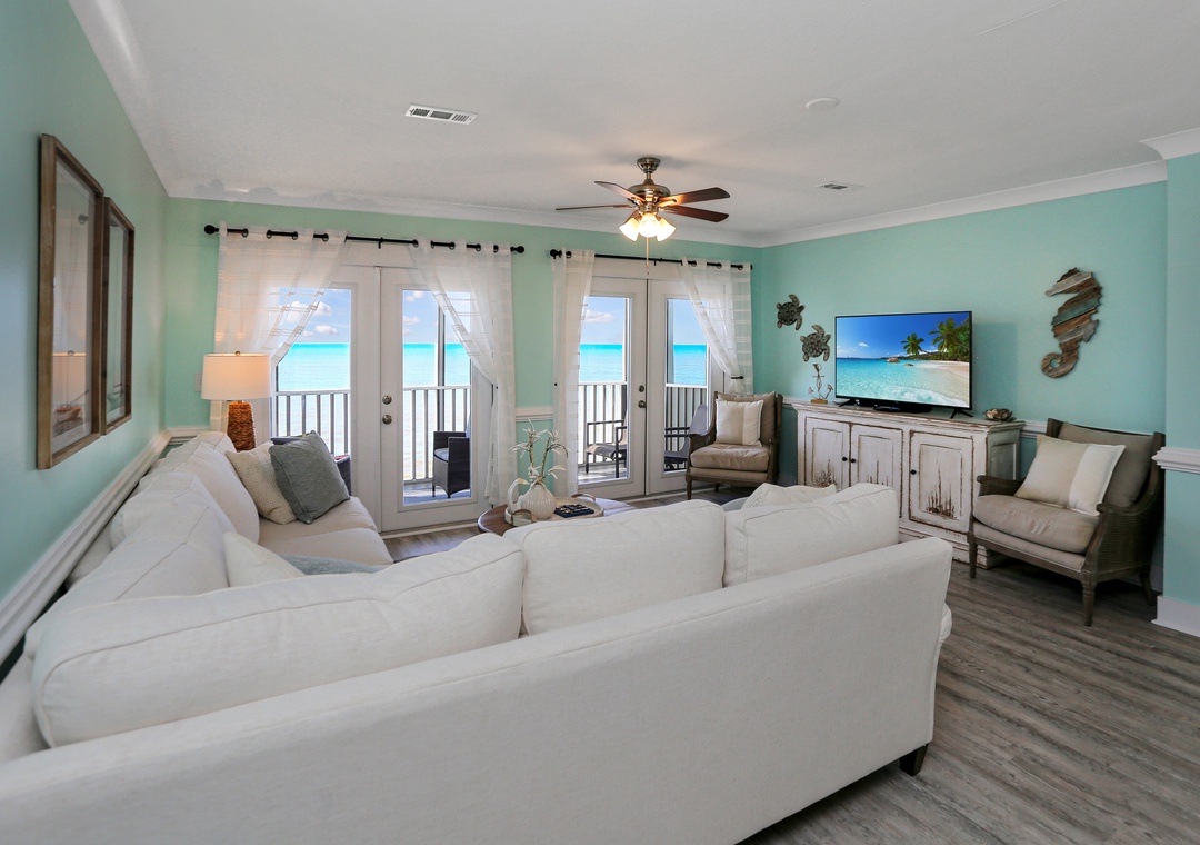 Inside this beautiful unit, the decor is bright and airy, helping maintain those beach vacation vibes. The first floor consists of the main living area—an open space including the kitchen, dining area, and living room, all with incredible beach views. From the gulf front living room, you can access the screened deck furnished comfortably to enjoy the sound of the gulf waves.