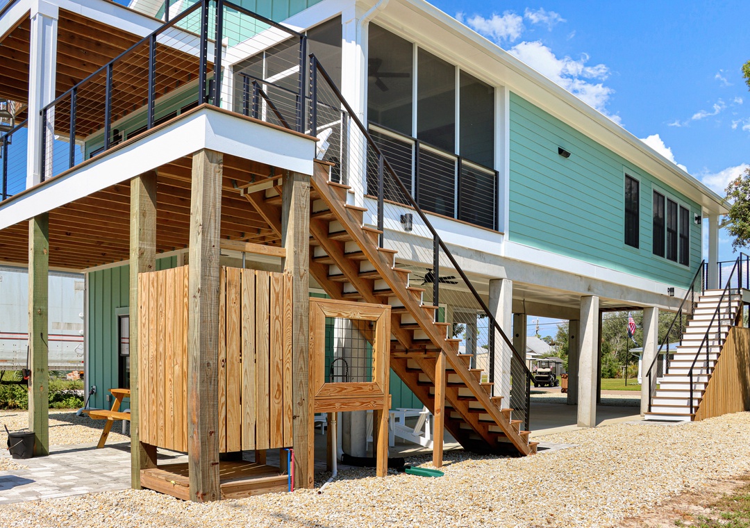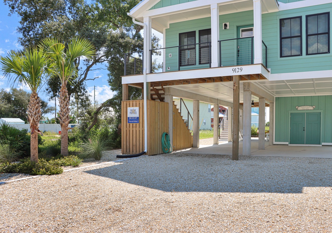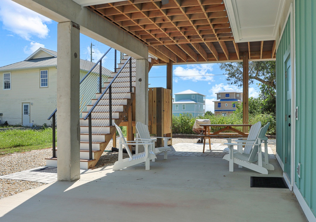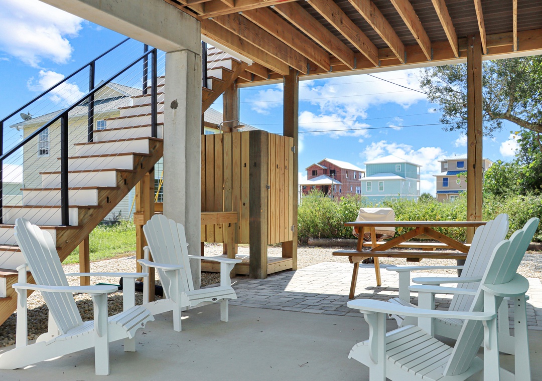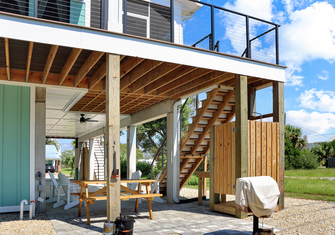 Under the main house on the ground floor is a separate Mother-in-Law Suite fully equipped to sleep two with a private kitchenette and full bathroom. On the ground floor, you will also find the enclosed outdoor shower and an additional sitting area with gulf views.