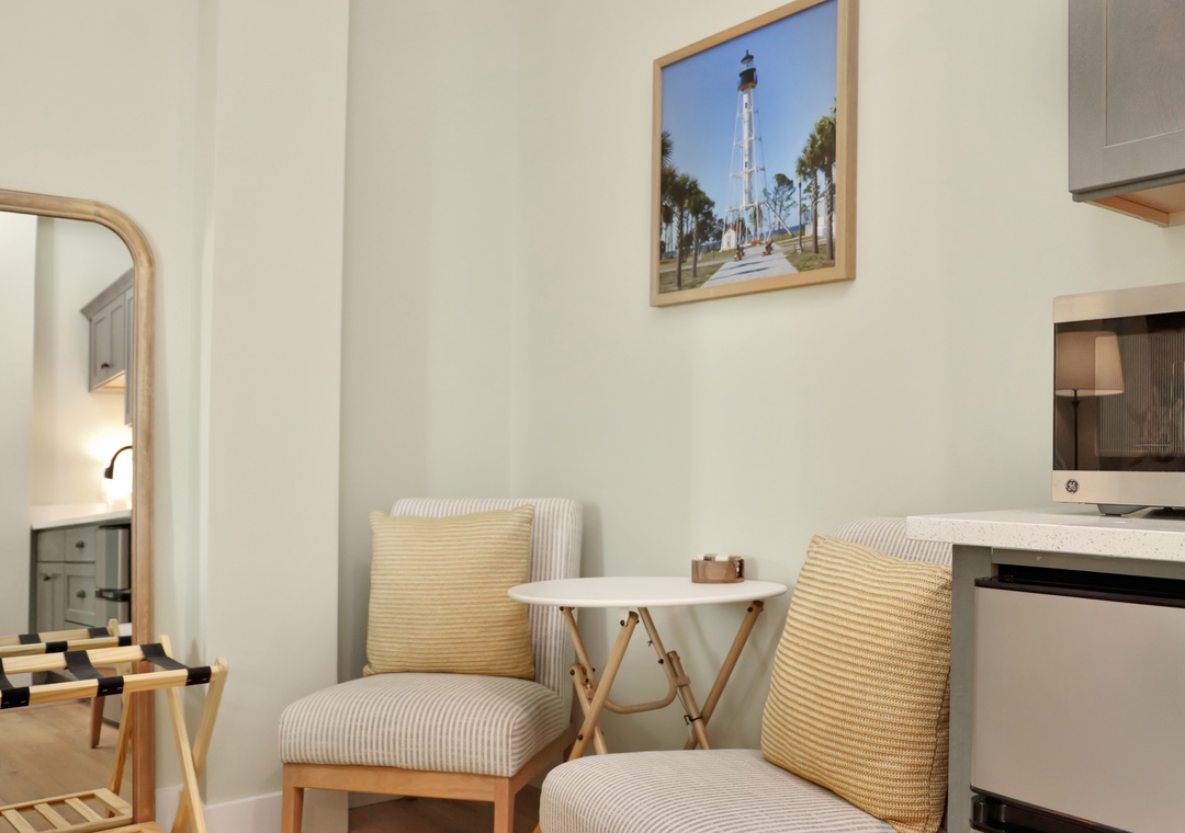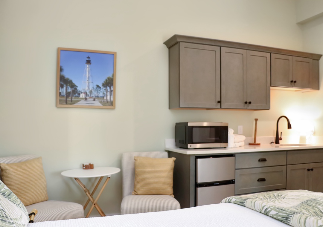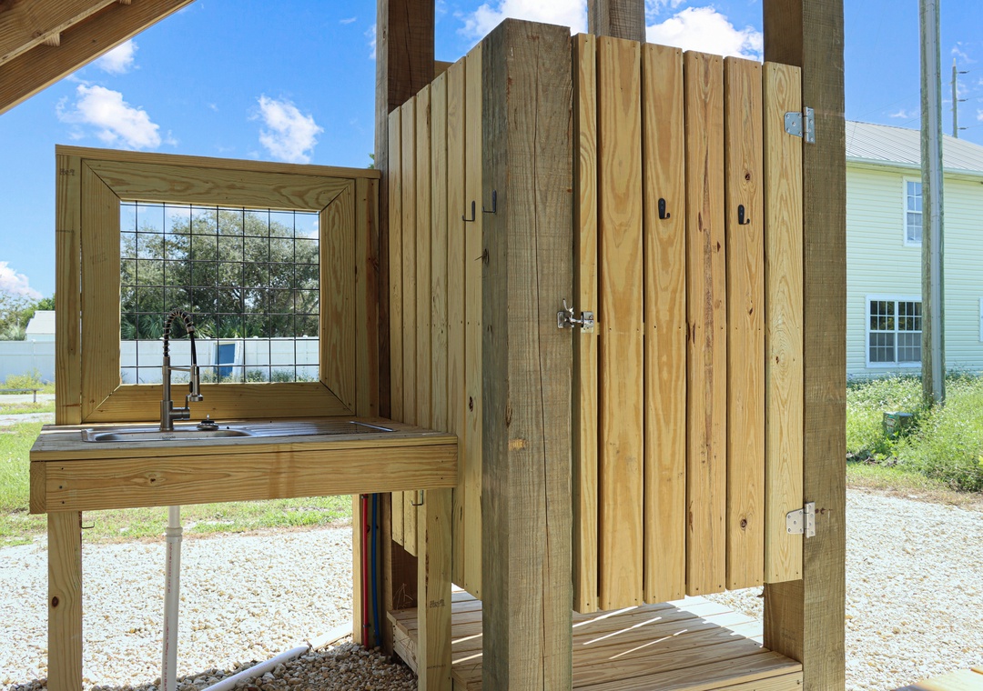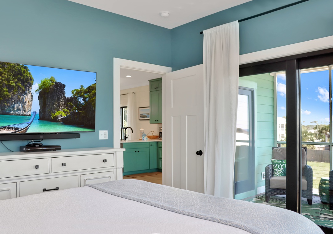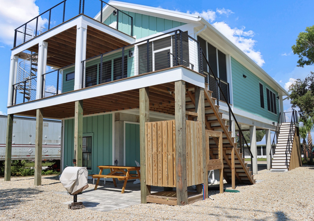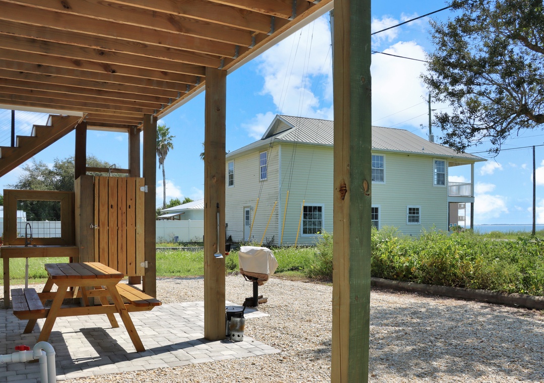 Under the main house on the ground floor is a separate Mother-in-Law Suite fully equipped to sleep two with a private kitchenette and full bathroom. On the ground floor, you will also find the enclosed outdoor shower and an additional sitting area with gulf views.