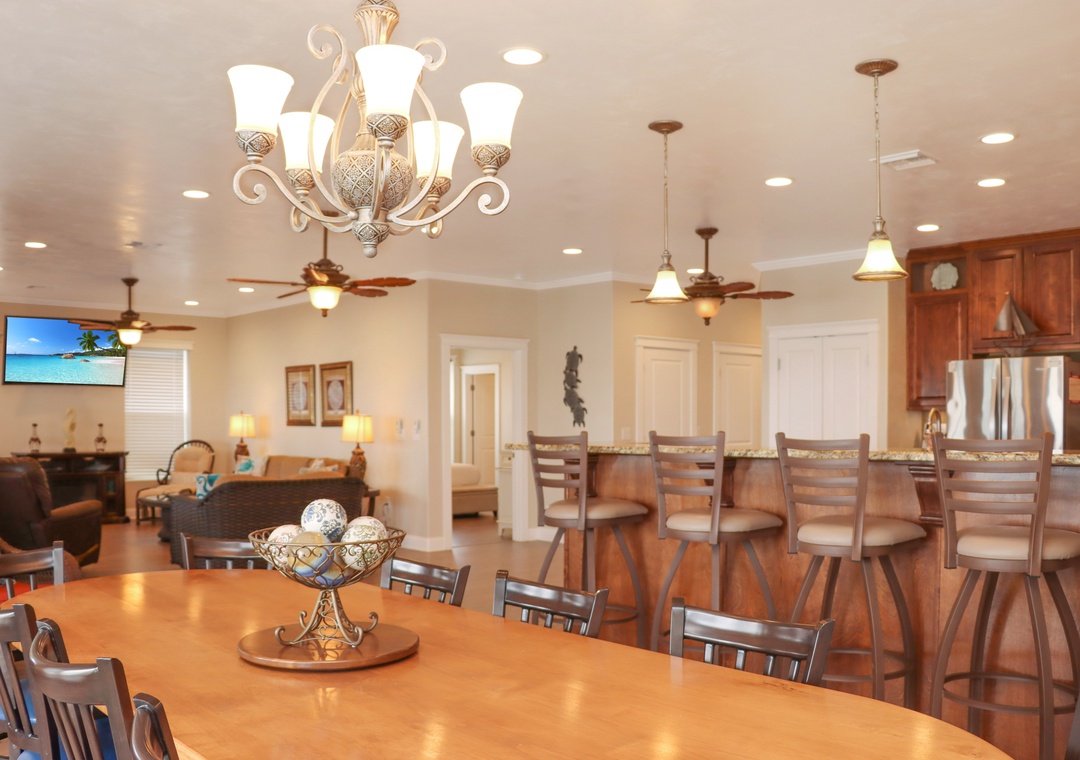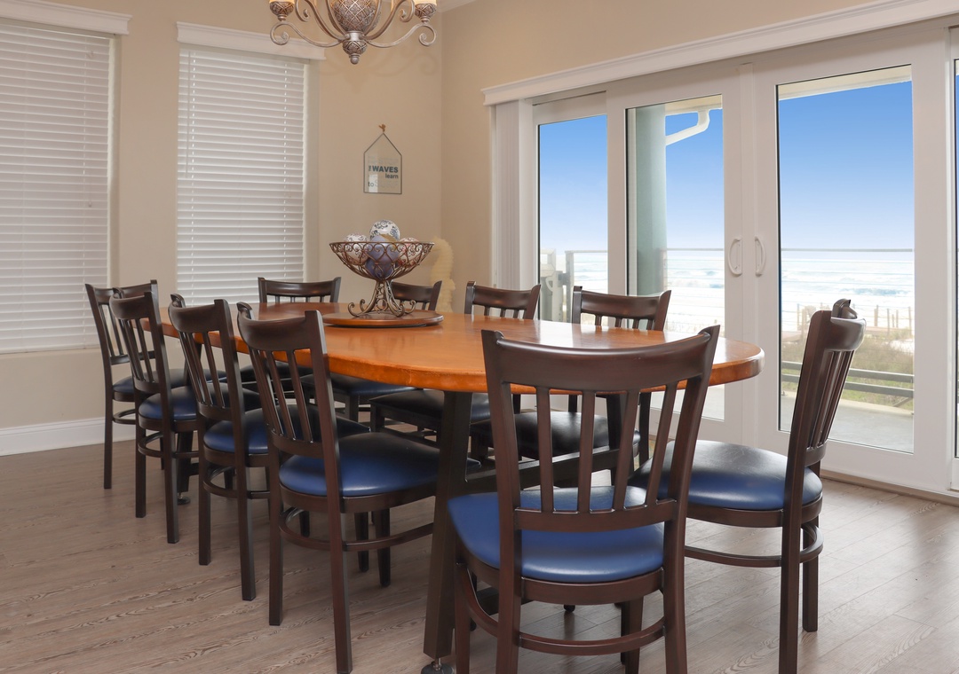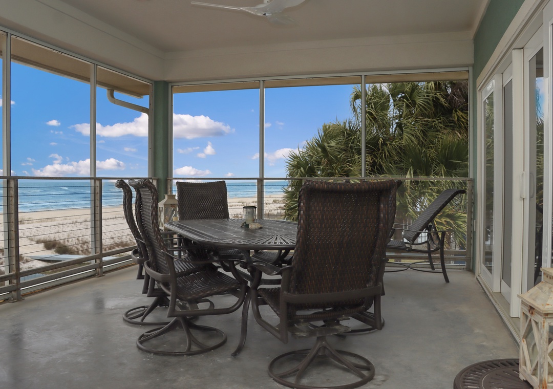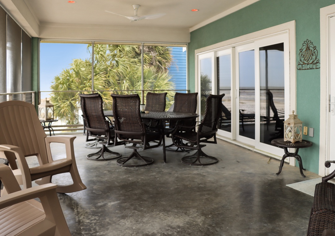 The home's design thoughtfully integrates indoor and outdoor living spaces. On the beach side, a screened deck presents the perfect venue for alfresco dining or simply relishing the coastal ambiance. This outdoor area is furnished with a dining table, allowing guests to enjoy meals with a view. The heart of the home is found on the main level, where a spacious and open living area unfolds. It features a large kitchen equipped with modern amenities, a bar for casual dining or evening cocktails, and a generous dining area, creating an inviting space for socializing and entertainment.