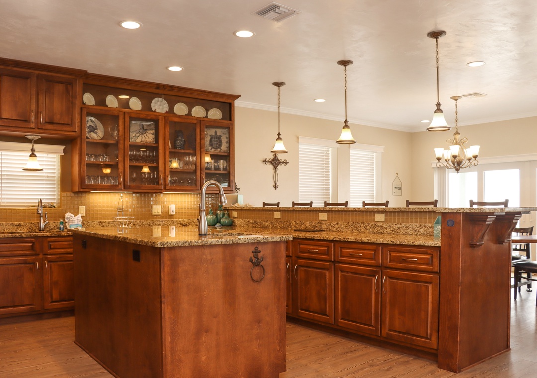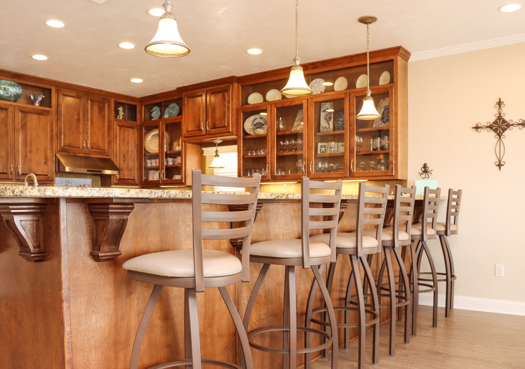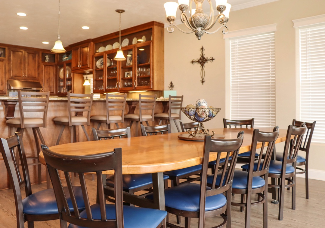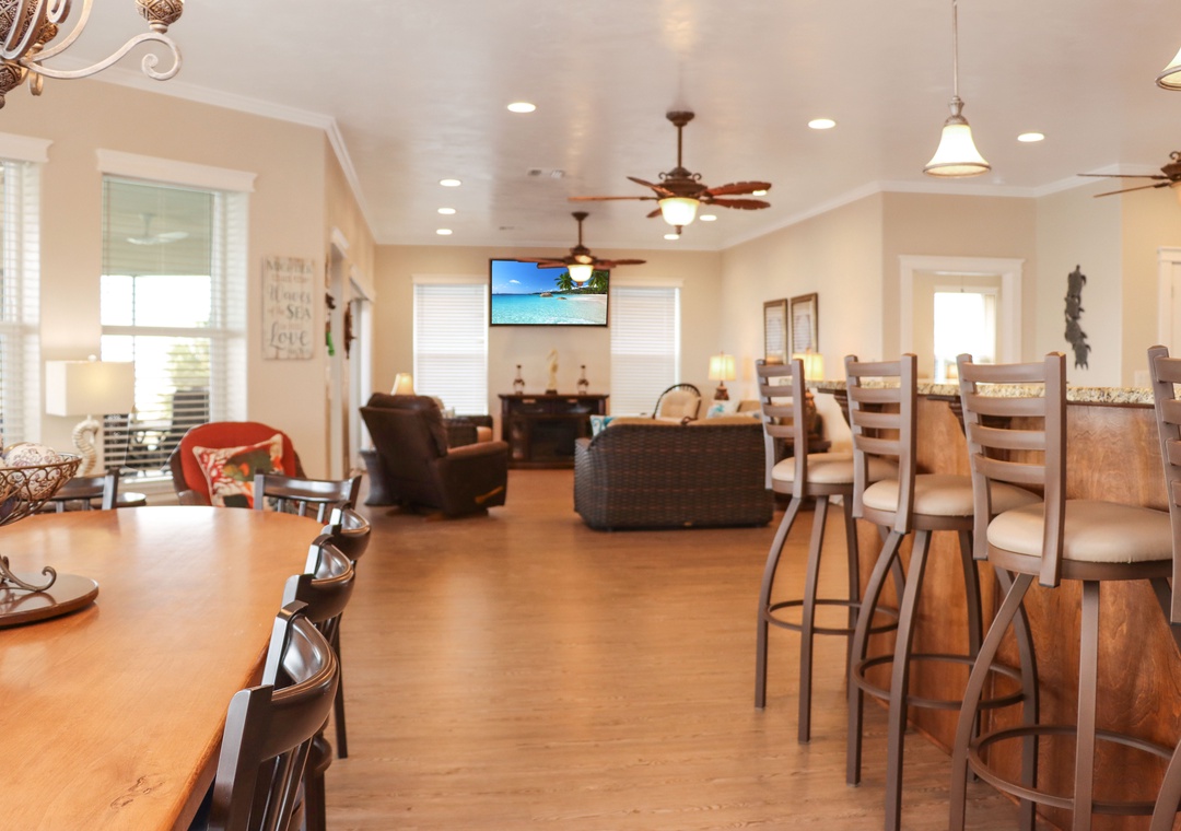 The home's design thoughtfully integrates indoor and outdoor living spaces. On the beach side, a screened deck presents the perfect venue for alfresco dining or simply relishing the coastal ambiance. This outdoor area is furnished with a dining table, allowing guests to enjoy meals with a view. The heart of the home is found on the main level, where a spacious and open living area unfolds. It features a large kitchen equipped with modern amenities, a bar for casual dining or evening cocktails, and a generous dining area, creating an inviting space for socializing and entertainment.