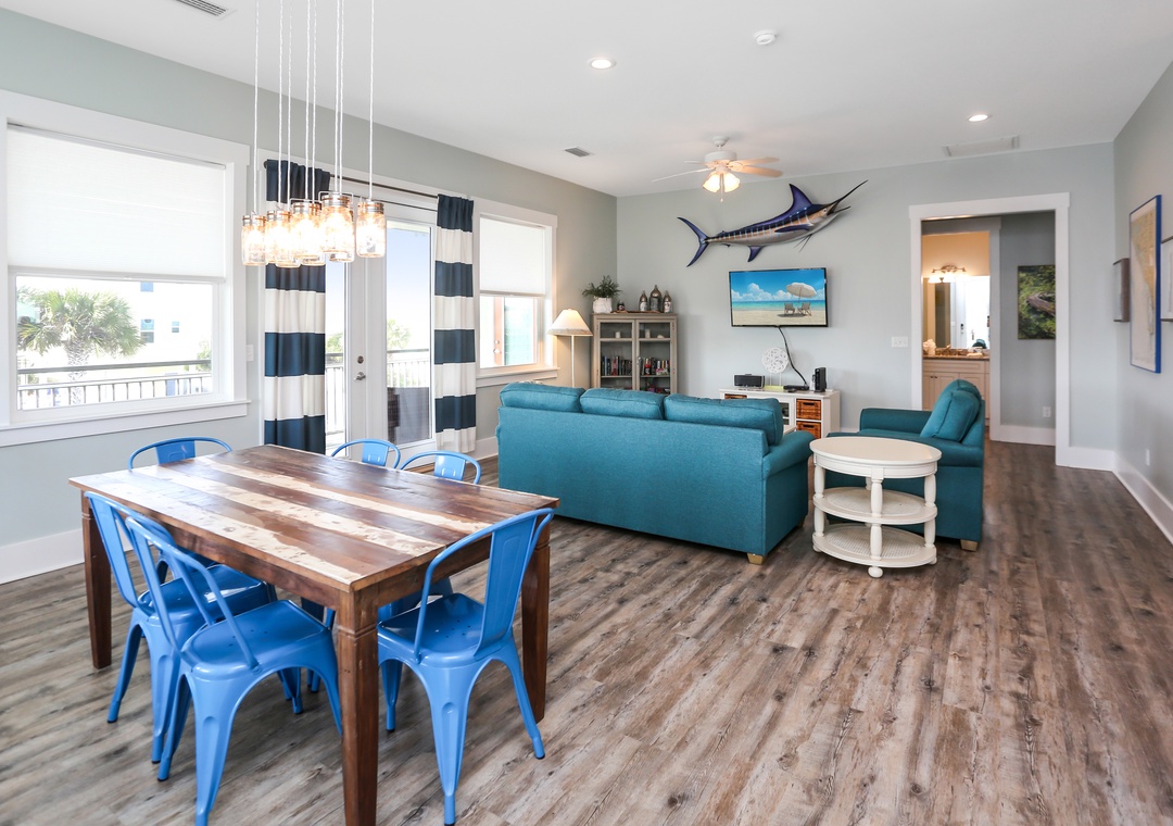 The natural beauty and adventure of the Cape are best experienced from the comfort of Fried Green Tomatoes. This beach home's base has a covered and open parking area and an enclosed outdoor shower steps away from the pool. With only one flight of stairs, access inside is more manageable than many of our area’s other vacation homes. Gulf View decks stretch the length of the home on the roadside as well as beachside. The beachside deck is screened-in with a relaxed dining and sitting area. You’ll enter the home into an open living area spacious enough for your group of 8 to spread out and enjoy. The coastal feel continues indoors with the nautical decor and beach style.