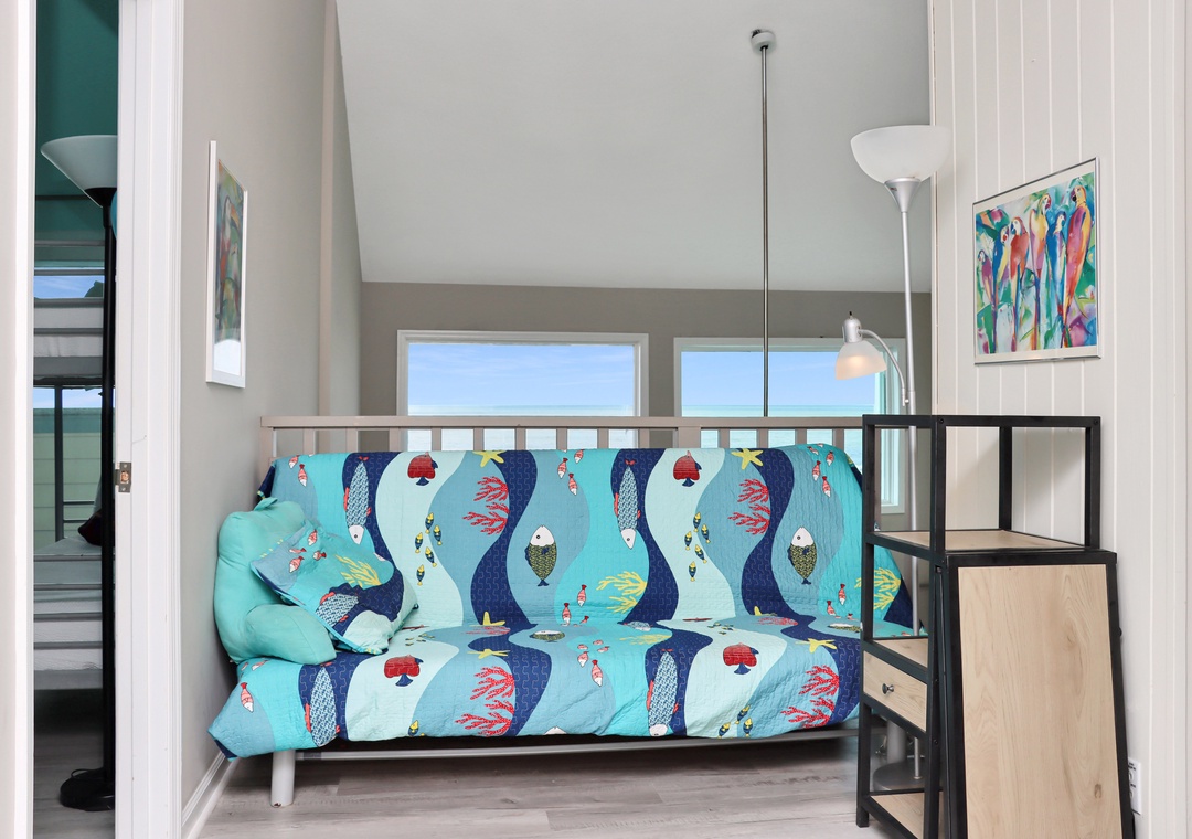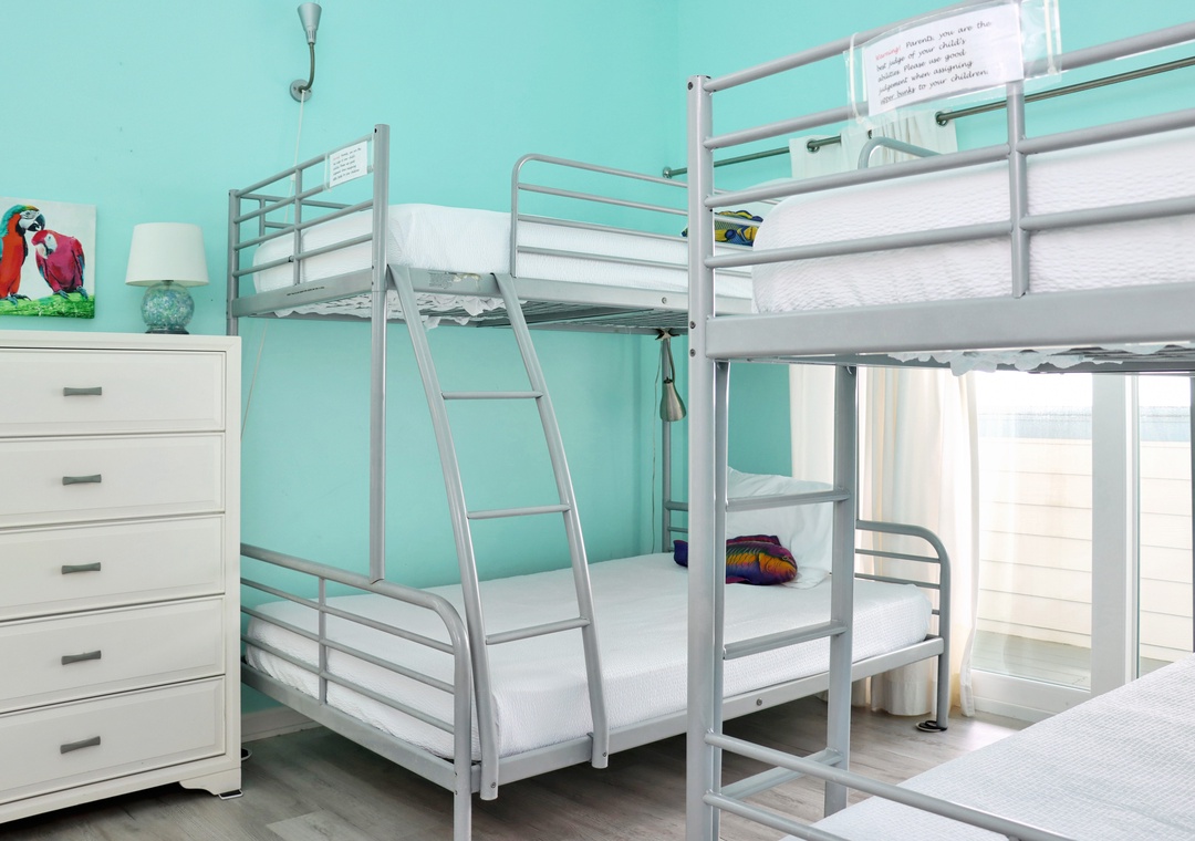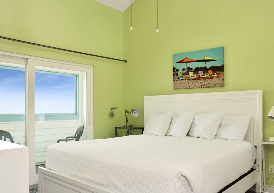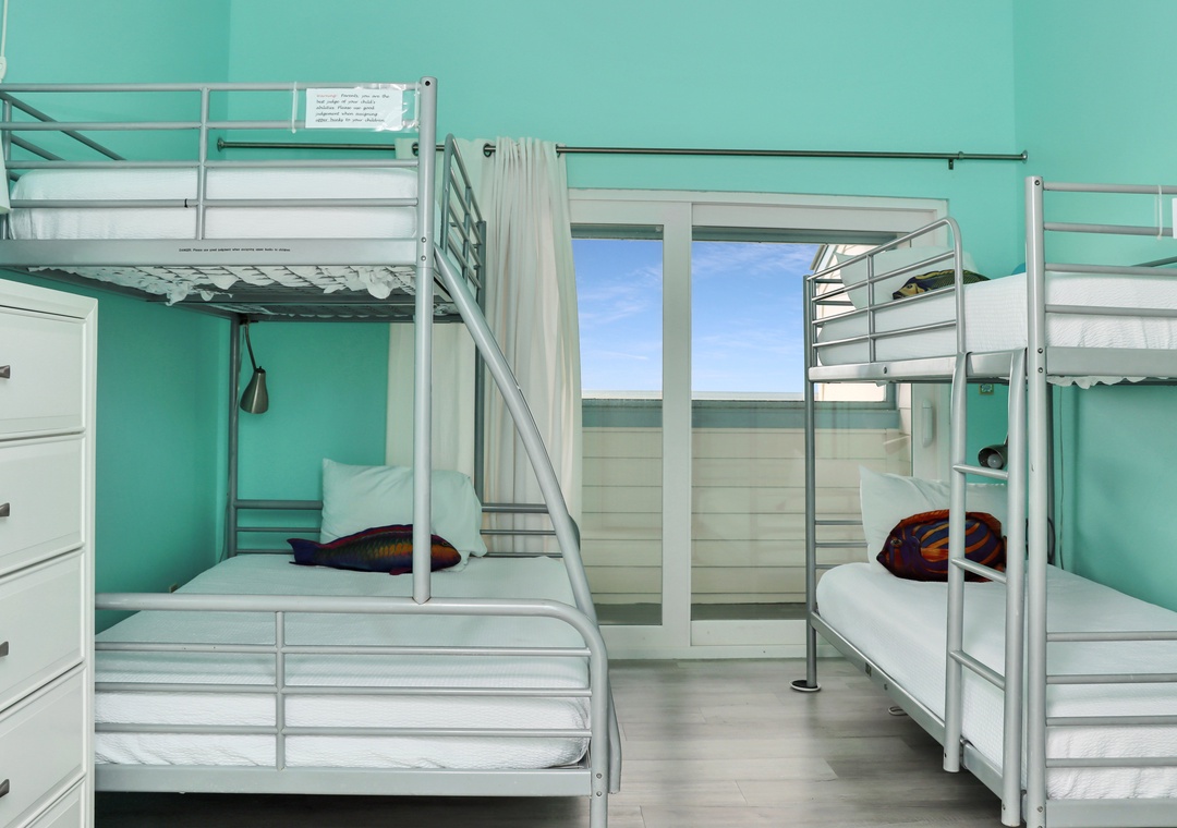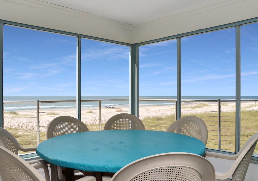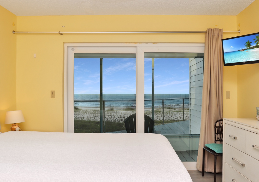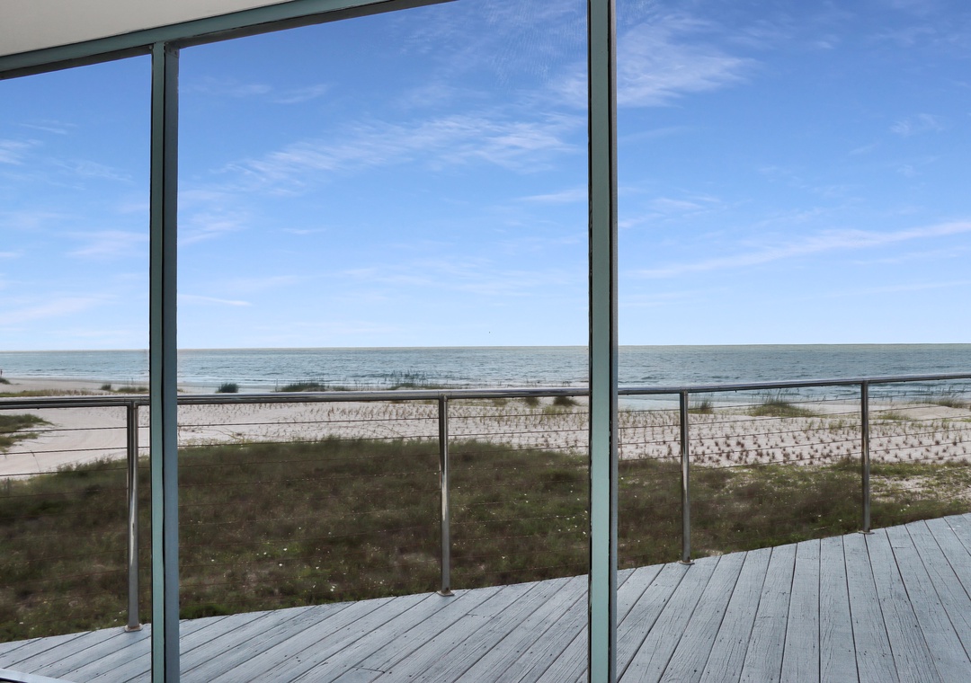 Click Here To Learn More!Floor Plan: Ground level-foyer and laundry room with washer/dryer. 1st level-kitchen, dining, living room with TV, and excellent gulf view; Bedroom 1-gulf front bedroom with queen bed, full shower bath and screened porch. 2nd level-Bedroom 2-gulf front bedroom with king bed, TV, full shower bath and screened porch; sitting area with desk; and Bedroom 3-gulf front bedroom with 1 Bunk set and 1 Duo, full tub/shower bath and screened porch.