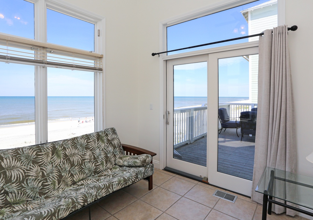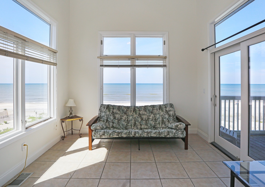 Click Here To Learn More!Floor Plan: Ground level-foyer. 1st level-laundry closet, living room with access to gulf front deck, TV, DVD, 1/2 bath and fireplace; den with double futon, access to gulf front deck and stereo; and Bedroom 1-gulf front master bedroom with king bed, TV, full bath and access to gulf front deck. 2nd level-Bedroom 2-2 twin beds and full bath and Bedroom 3-queen bed, TV and full bath. Both have gulf views.