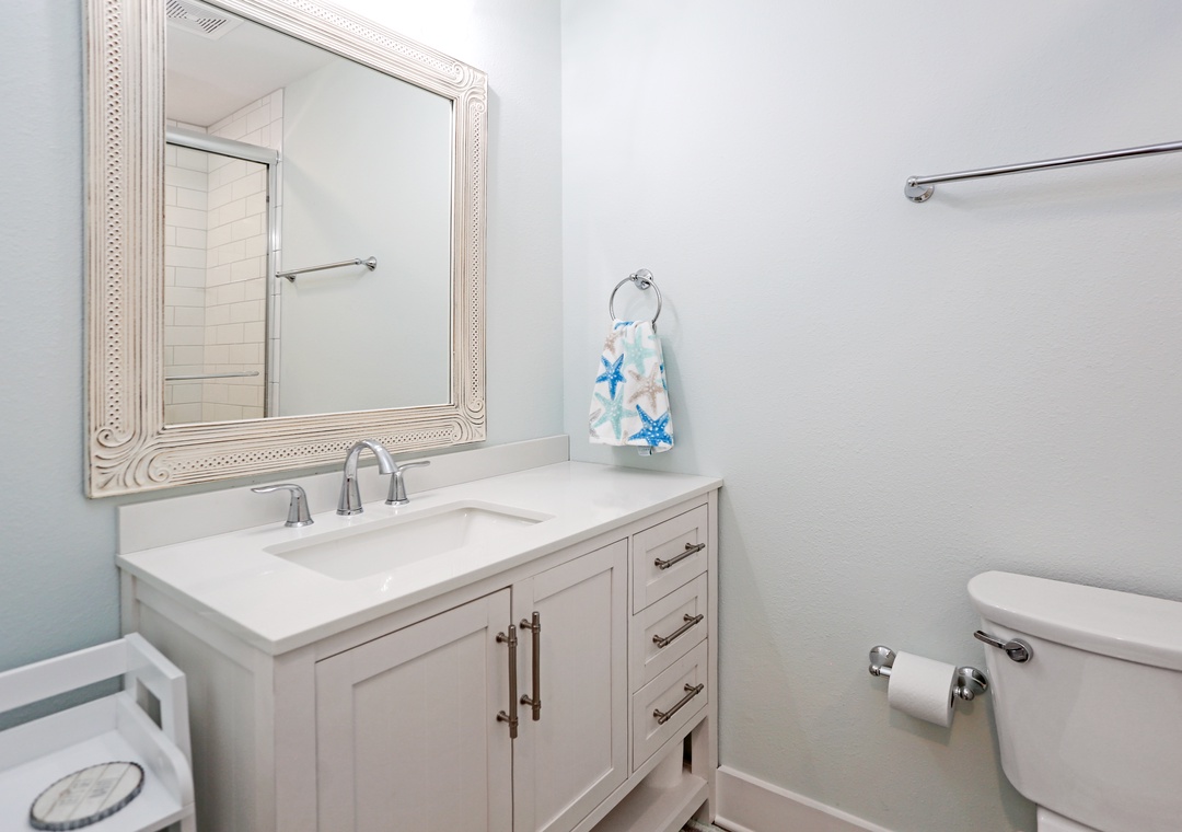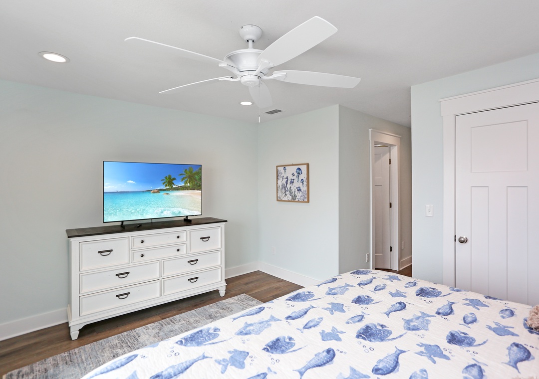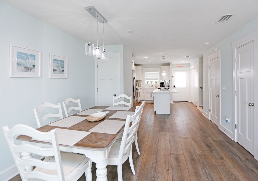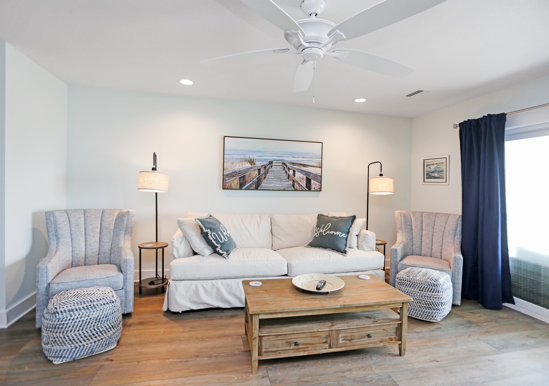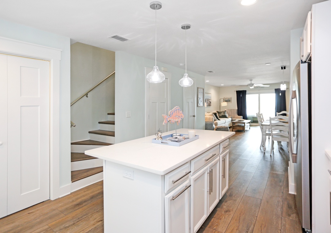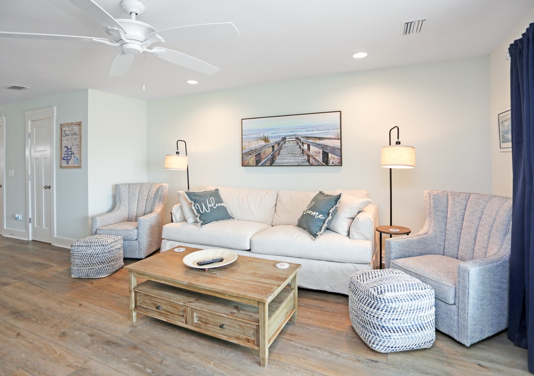 Mimi’s Place was designed with beach lovers in mind and is perfect for up to 6 guests who want to relax in casual luxury. The first thing you notice when you walk in is the light airiness of the décor and colors. Once you are inside the ground floor living level, your line of sight will draw you through the patio doors, past the covered patio, across to the beautiful horizon. The color palette of the sunlit sky, sparkling blue water, and white sandy beaches have inspired the stylish scheme of the interior.