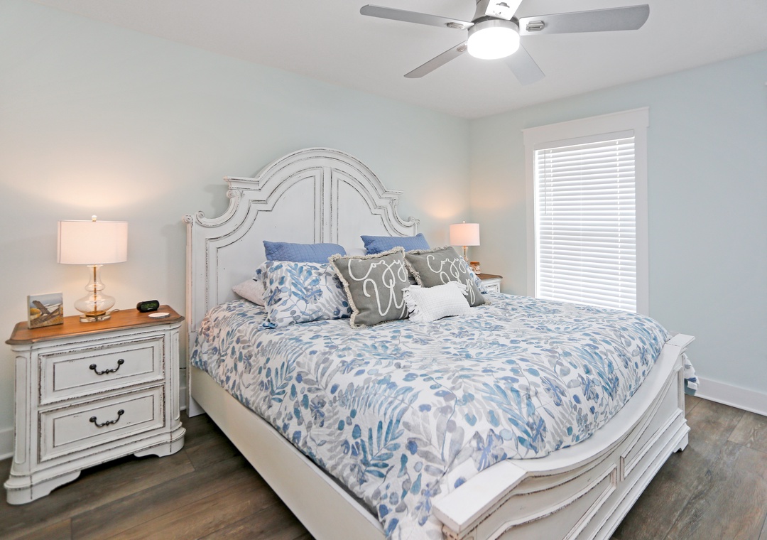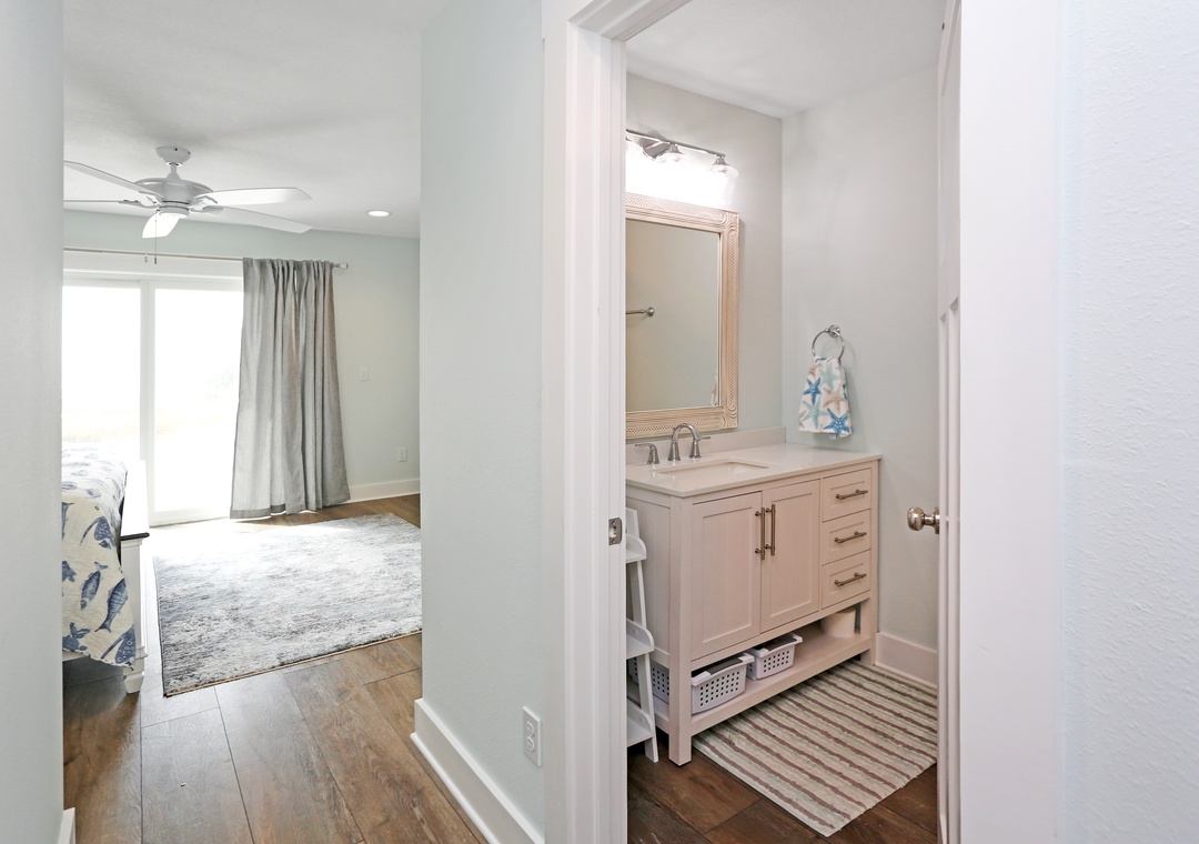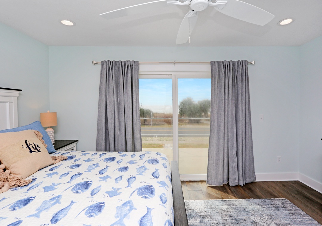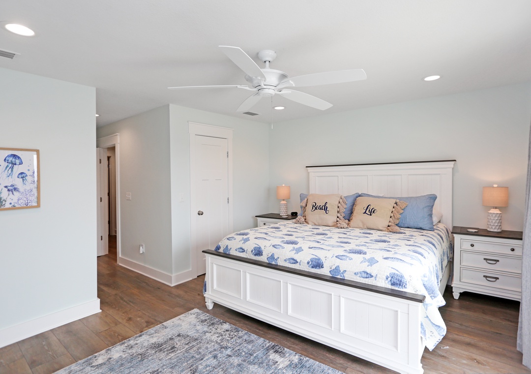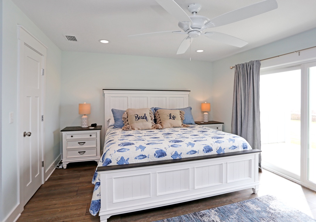 The second level of Mimi’s Place is divided into two bedrooms. The first is comfortably arranged with a king bed with a full bath just outside the room’s entrance. The second bedroom is the large master with another king bed, a master bath, and the best part-a gulf view deck. An open deck just off the master bedroom, it’s the best place to catch a tan and to enjoy the unobstructed gulf views.