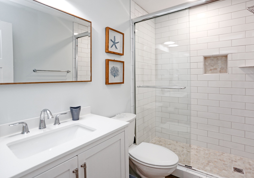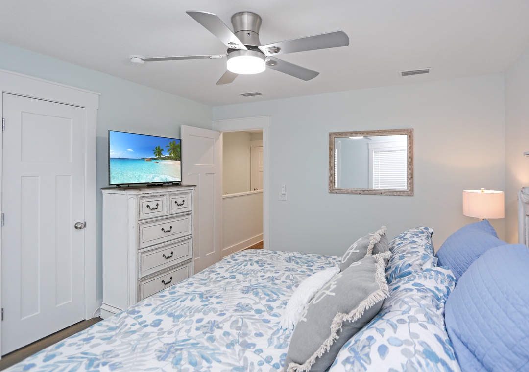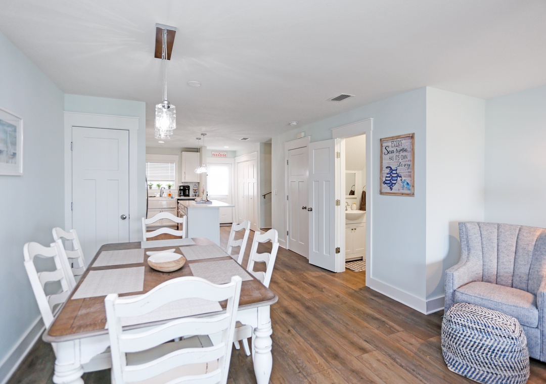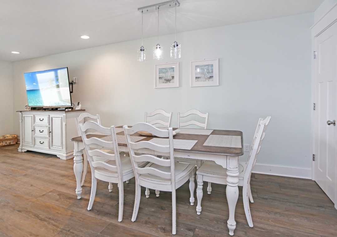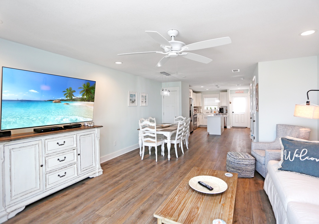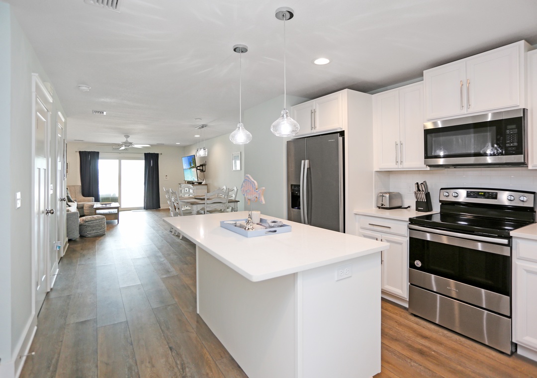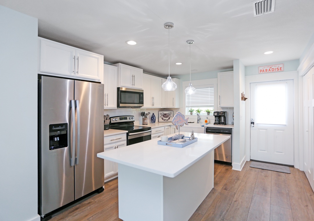 Morning coffee is best enjoyed on the comfortable outdoor seating. Your favorite show is always better when you’re cozied up in the living room on the big screen TV. And when you’re hungry, cook up some deliciousness in the kitchen, with its top-quality stainless steel appliances, ample countertop space, bright and open environment, and lots of light. Serve at the table in the dining room right off the kitchen, and when it’s time to hit the hay the two bedrooms are just a short flight of stairs away.