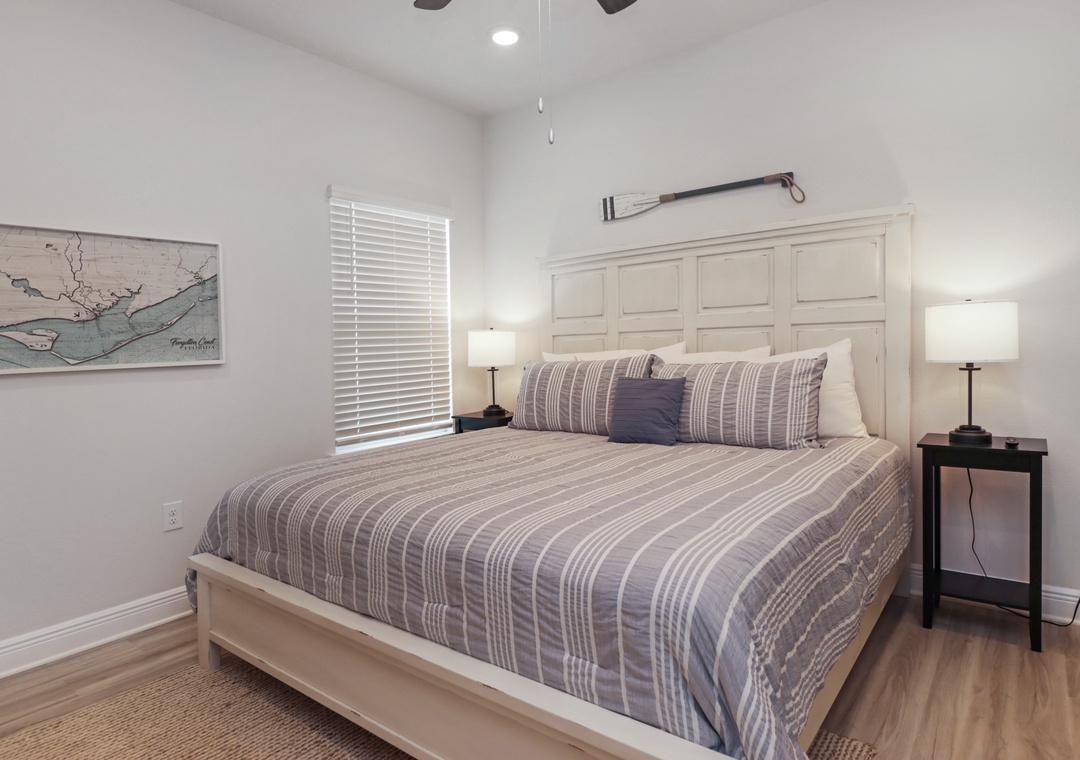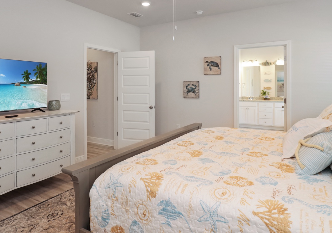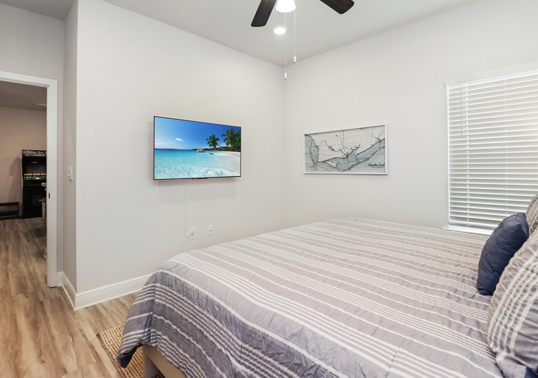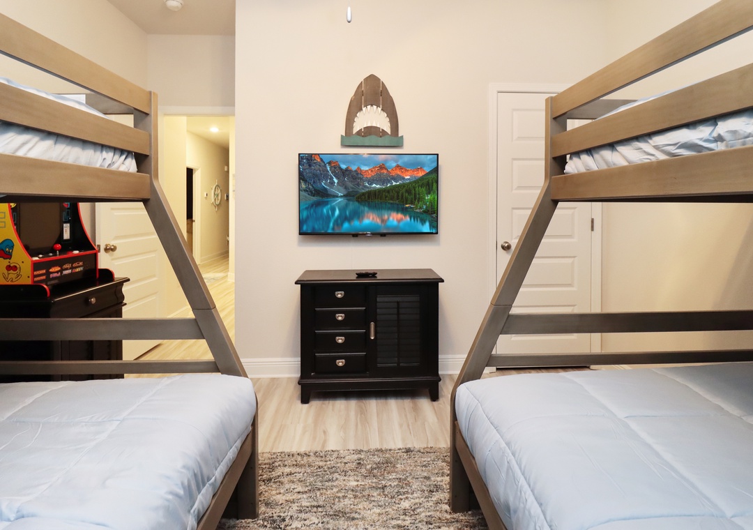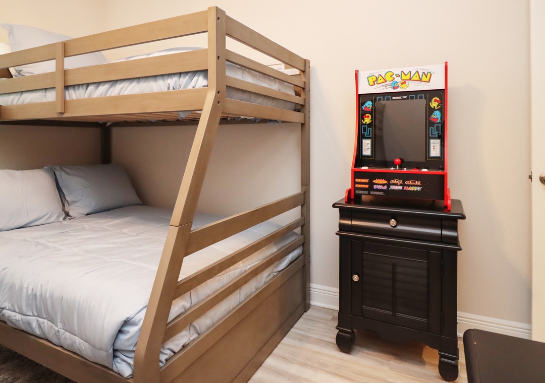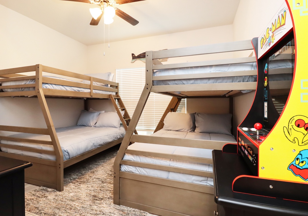 Families will adore the kids' bedroom, which offers two sets of twin/double bunk beds and yet another arcade game. The single-level layout of Paradise Found, including an enclosed garage, ensures ease and accessibility for all guests.