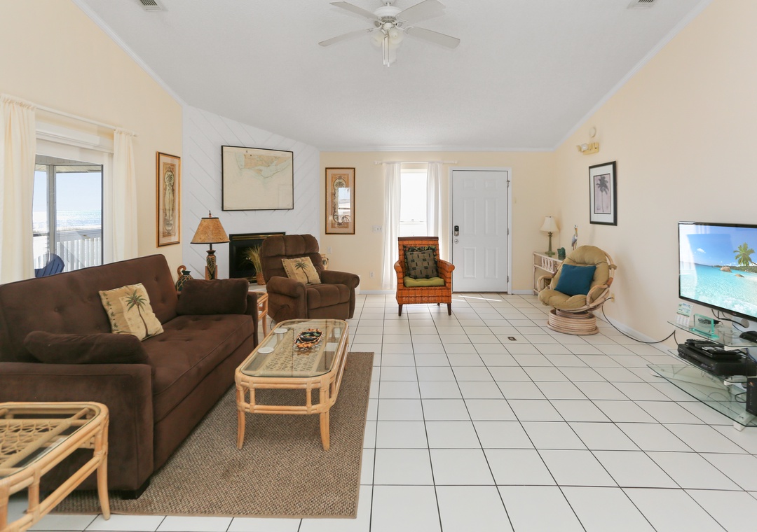 Click Here To Learn More!Floor plan: First level-Living Room with fireplace, sleeper sofa, TV, VCR, DVD, stereo and sliding glass doors that open onto screened porch; kitchen, dining, full bath, Bedroom 1-2 twins; Bedroom 2-Queen bed, TV, VCR and full bath.