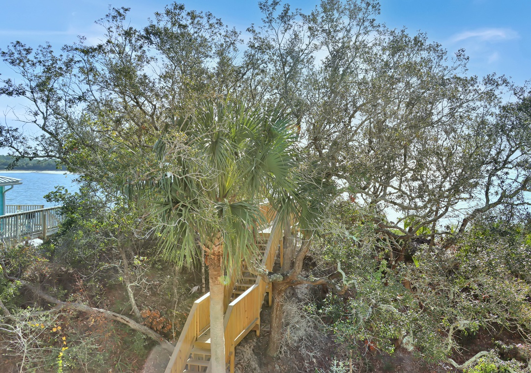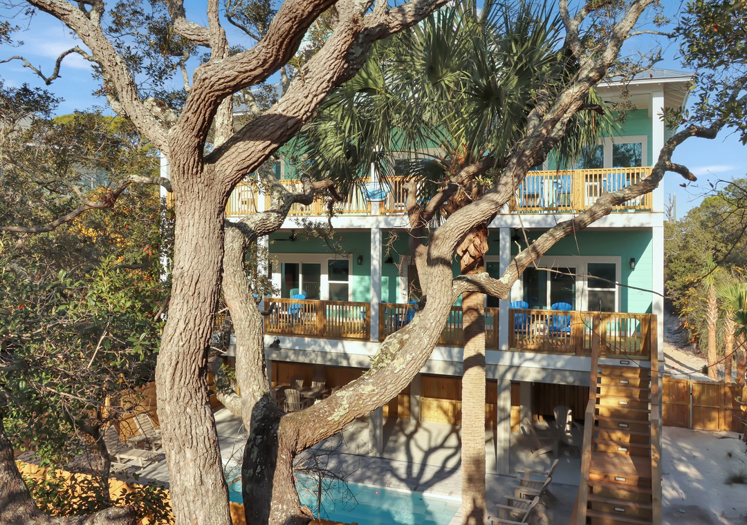 Experience the splendor of unspoiled beaches from two expansive decks, where the horizon stretches endlessly, providing panoramic views of the private pool and the shimmering gulf, with St. Vincent Island's natural beauty as your backdrop. Private stairways invite you through a landscape of native palms and undisturbed vegetation, directly onto the sands of a secluded beach paradise.