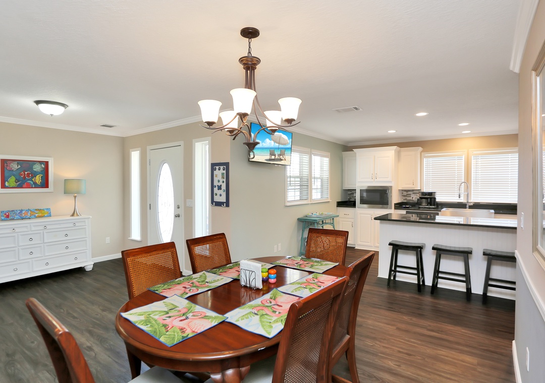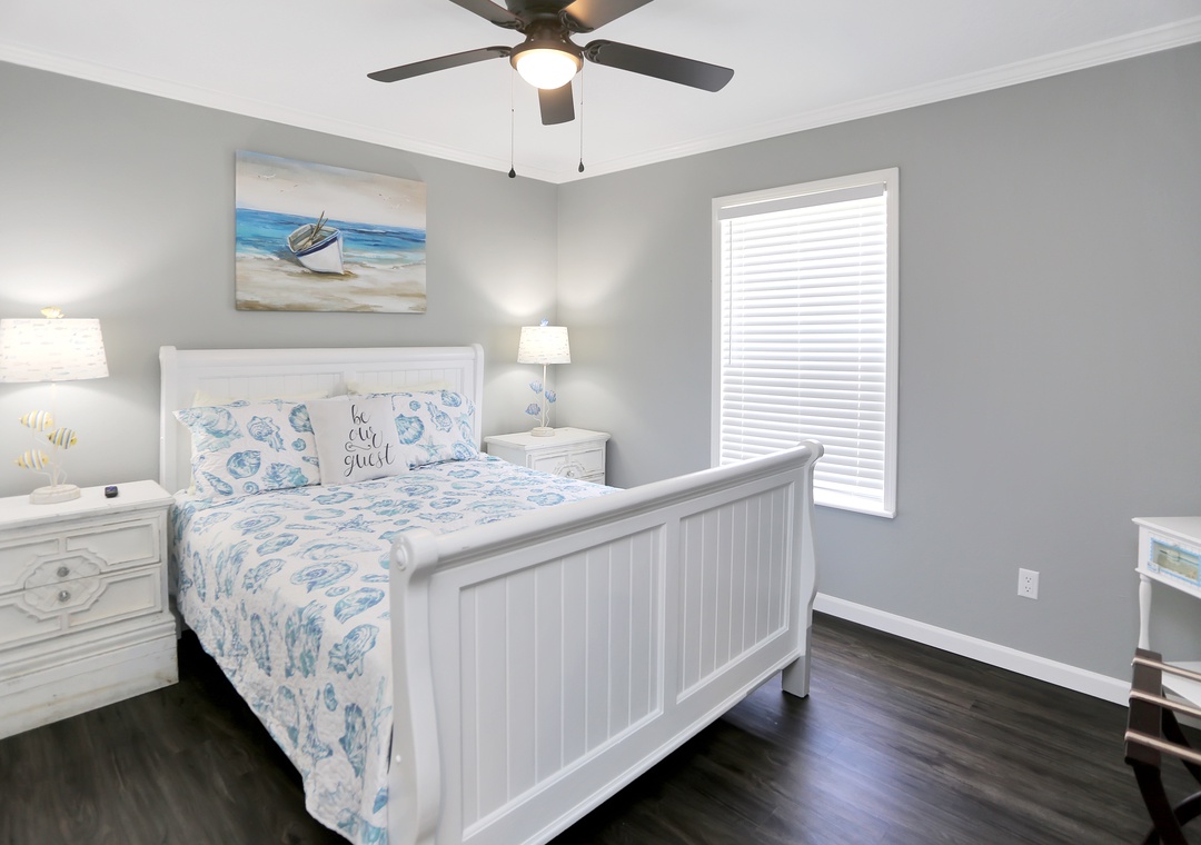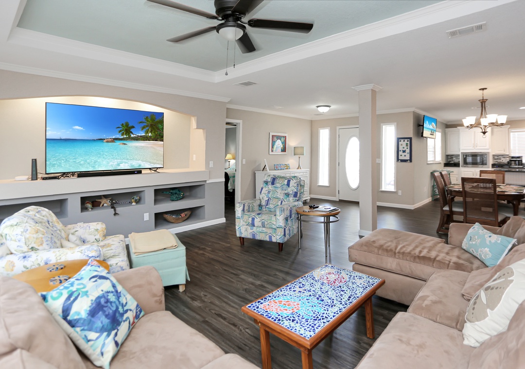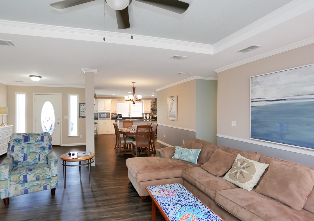 Located two blocks from convenient beach access, Salty Breeze is a single-level 5-bedroom house. On the roadside, there is plenty of parking for multiple cars or a boat. With a covered deck on the front and an open sundeck on the back of the house, the hardest decision will be dinner in the shade or out in the open. The layout of this beach home is such that space is abundant and perfect for a larger group of up to 12. The living area includes a large kitchen ideal for hanging out in, a dining area, and a living room that flow into one another.