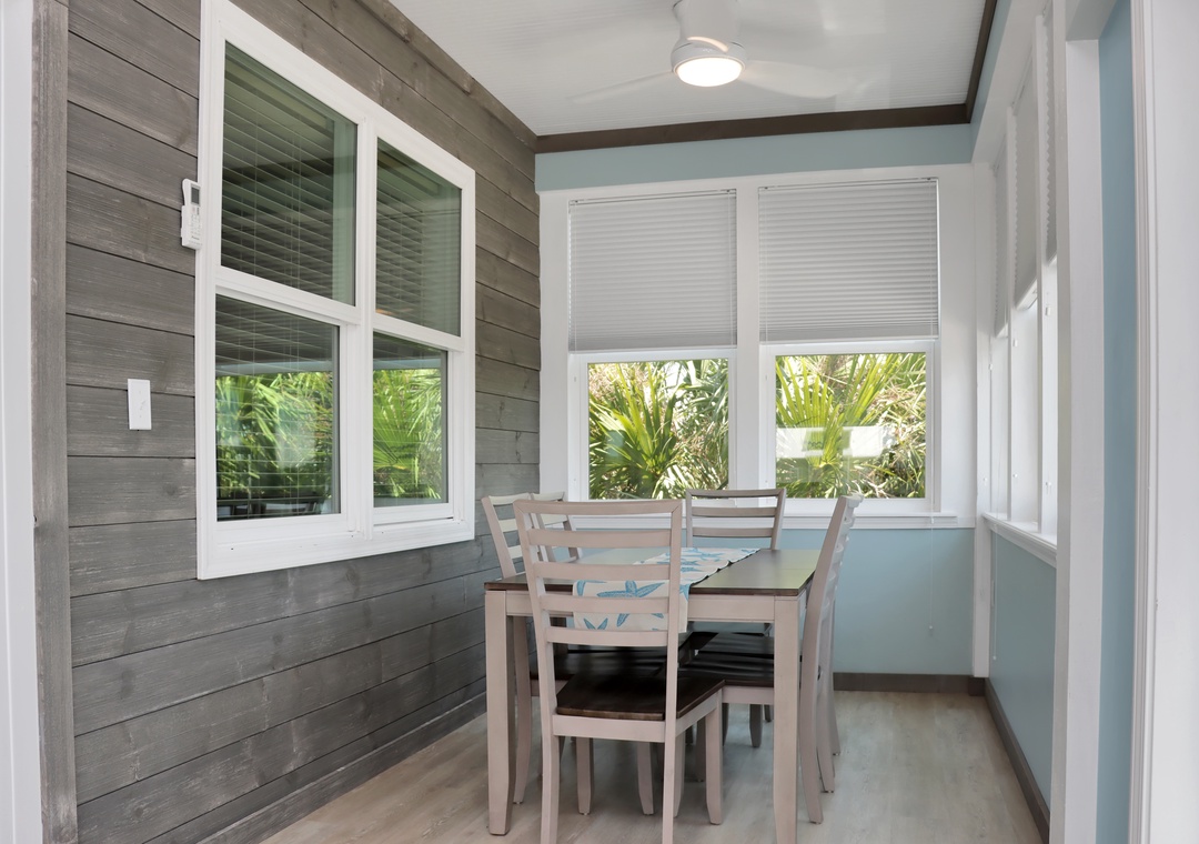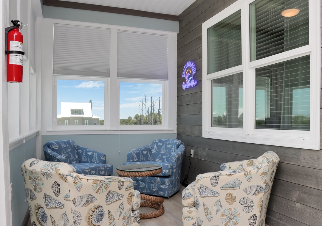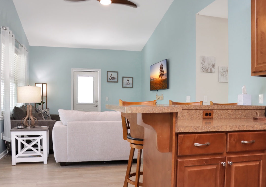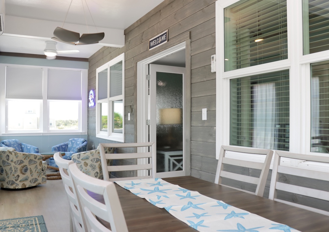 Salty Dolphin comfortably sleeps up to nine guests, making it an ideal getaway for families or groups of friends. The home boasts a sunroom with wall-to-wall windows, allowing an abundance of natural light to illuminate both the dining area and a cozy sitting area perfect for conversation. The open design living area seamlessly connects the kitchen, complete with a breakfast bar, to the spacious living room, creating a welcoming space for relaxation and entertainment.