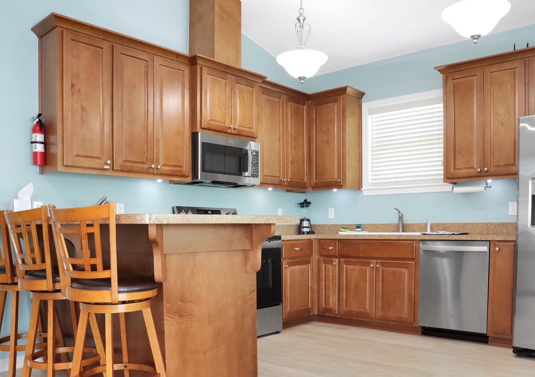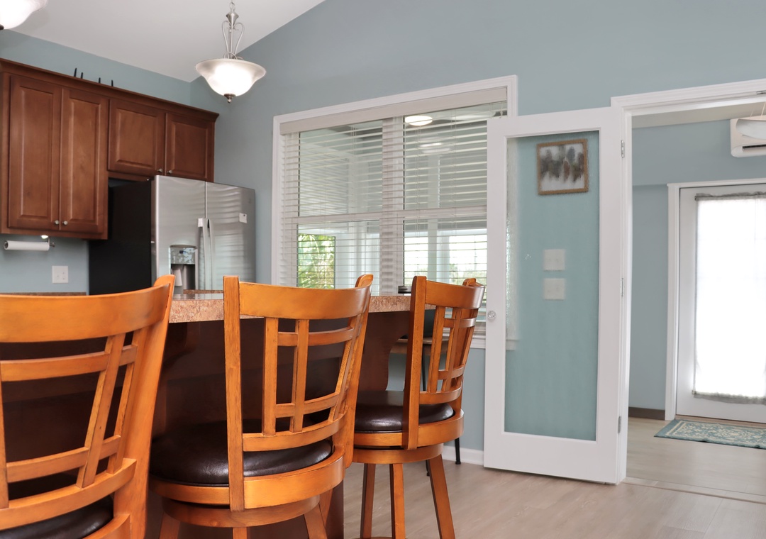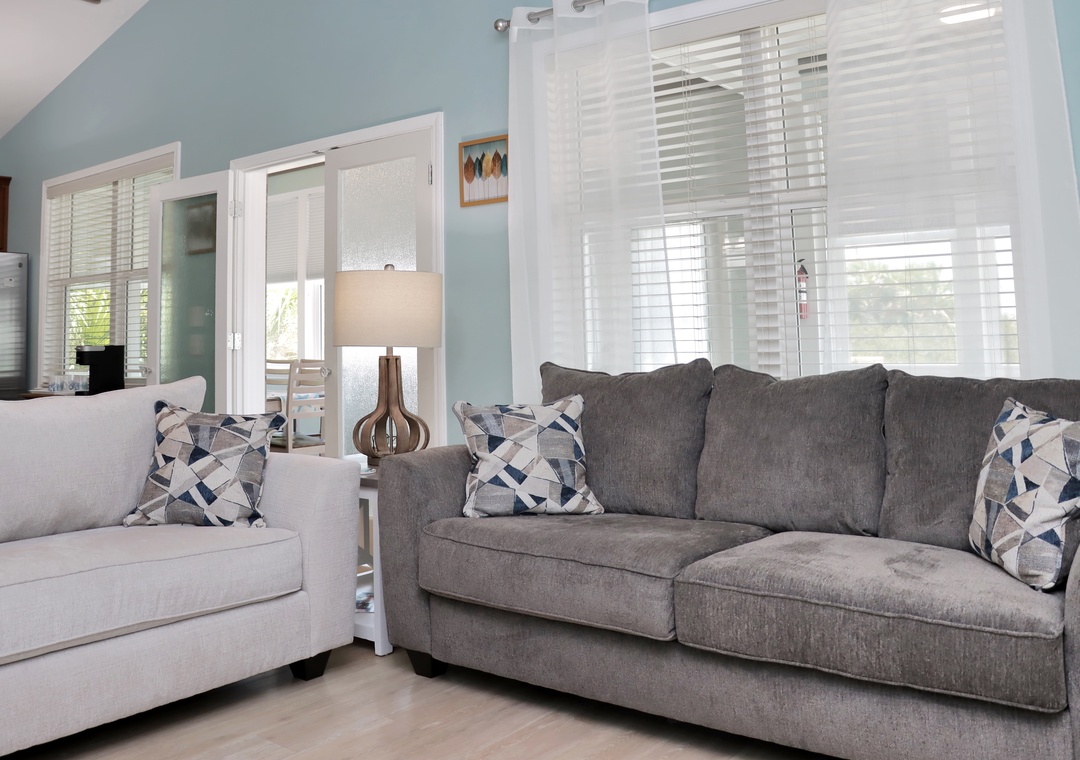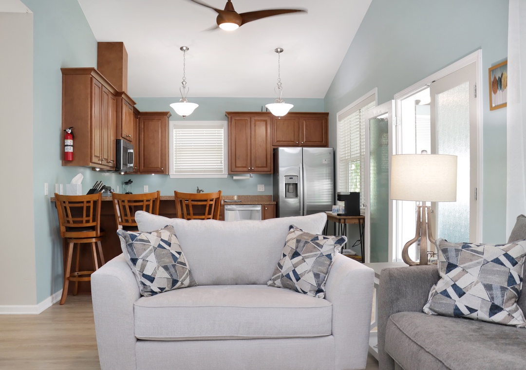 Salty Dolphin comfortably sleeps up to nine guests, making it an ideal getaway for families or groups of friends. The home boasts a sunroom with wall-to-wall windows, allowing an abundance of natural light to illuminate both the dining area and a cozy sitting area perfect for conversation. The open design living area seamlessly connects the kitchen, complete with a breakfast bar, to the spacious living room, creating a welcoming space for relaxation and entertainment.