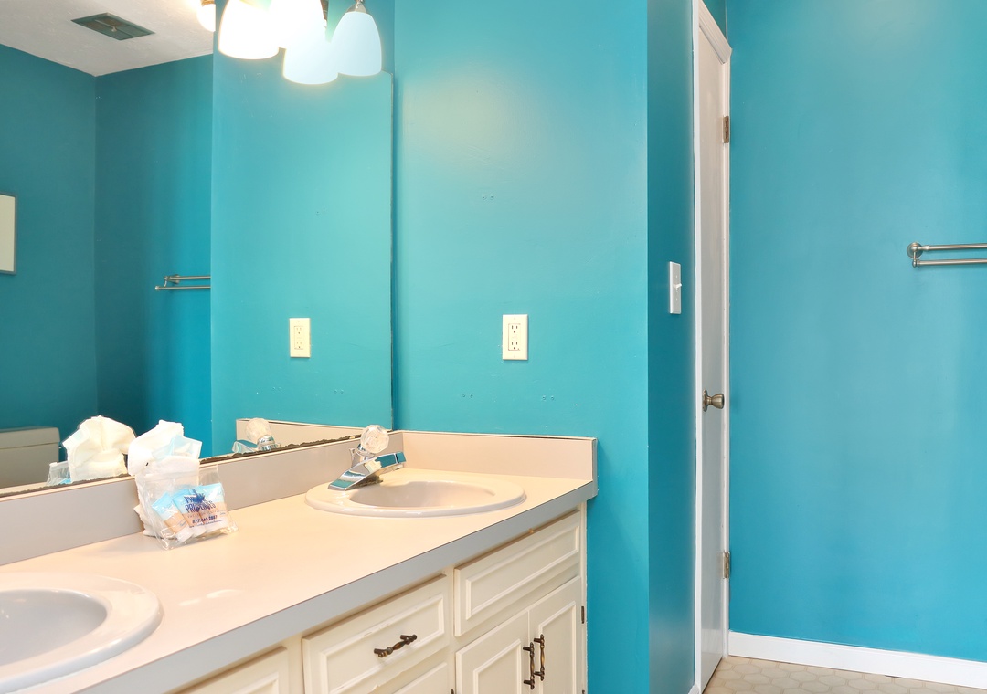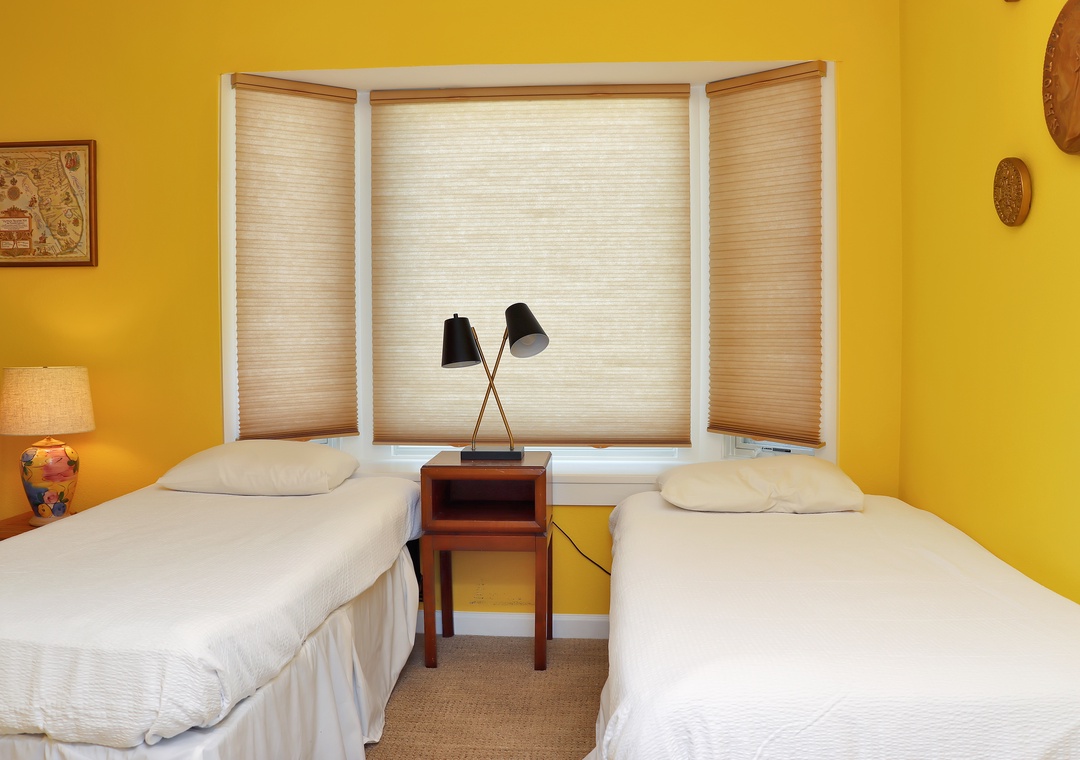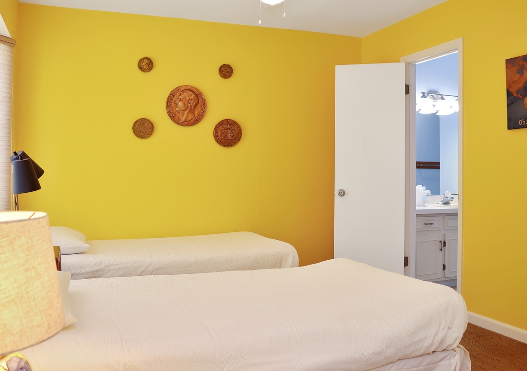 Bedroom with two twin beds on second floor with attached full bathroom between two bedrooms.