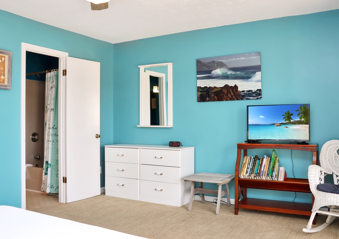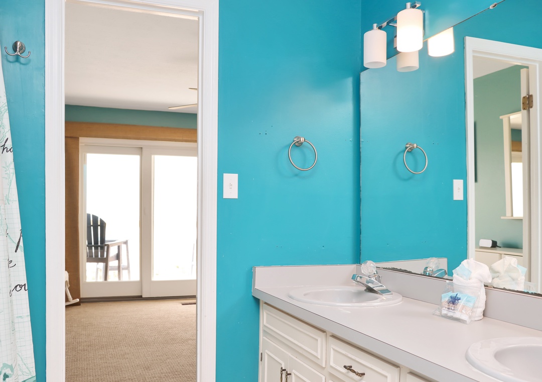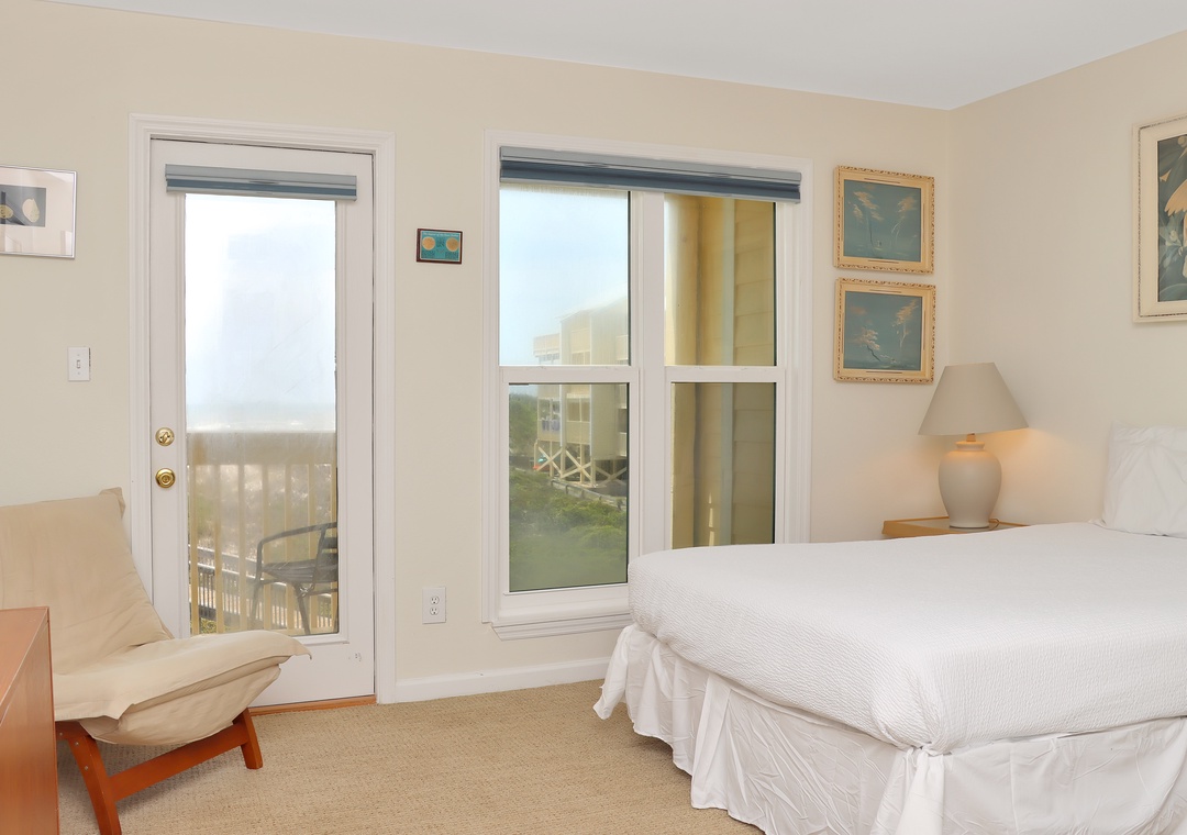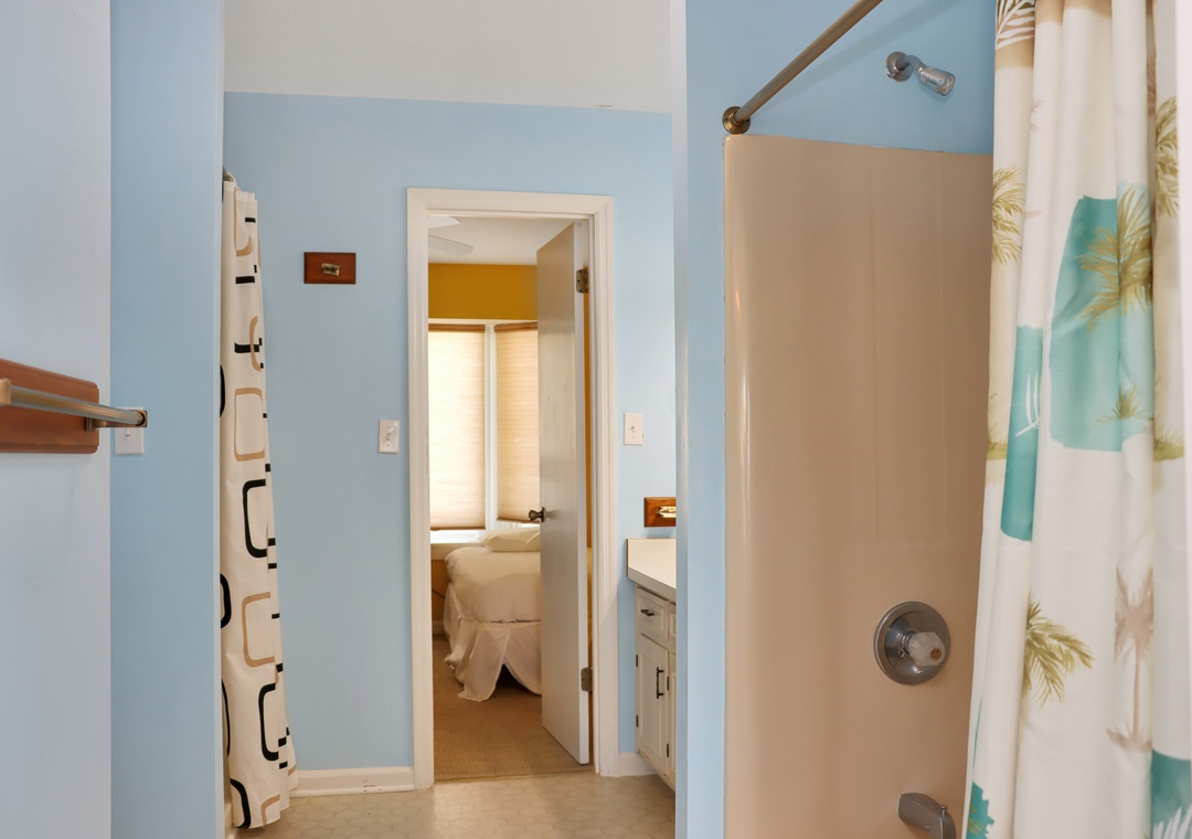 Bedroom on second floor with queen bed with attached full bathroom between bedrooms.