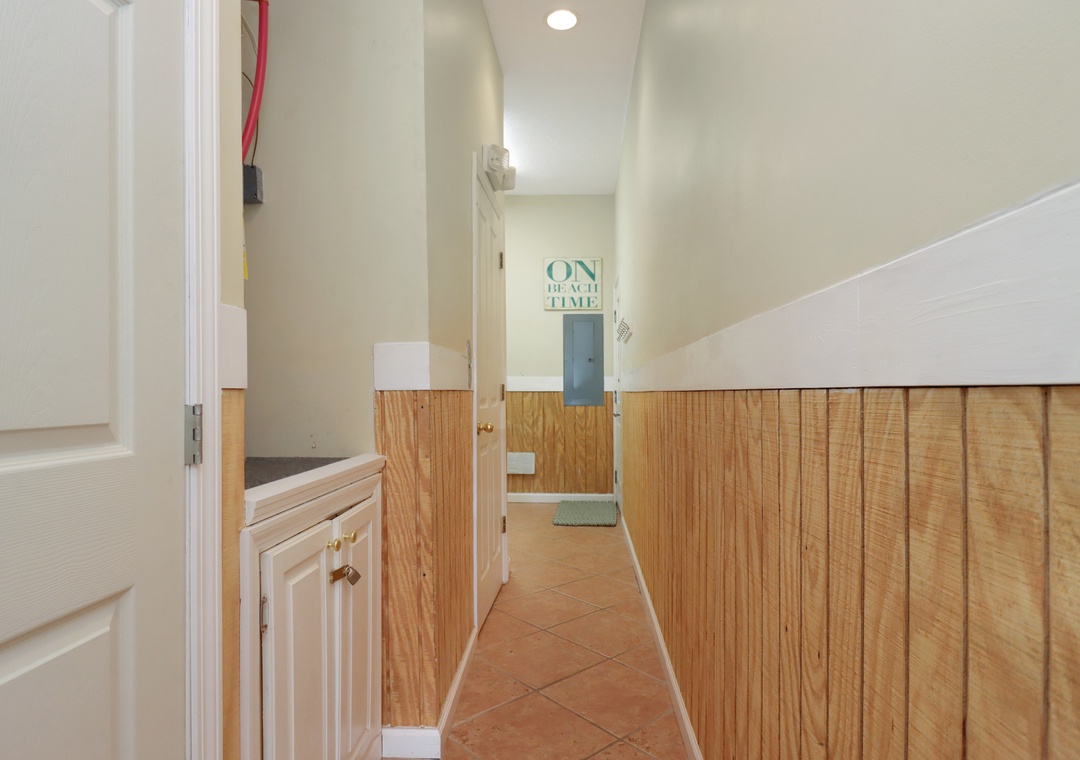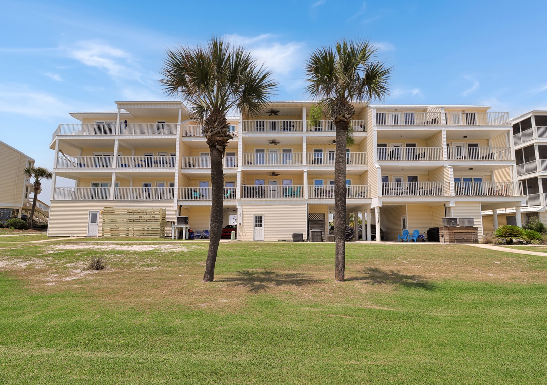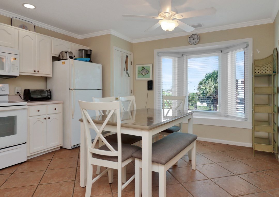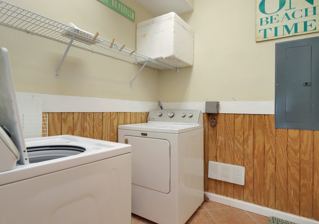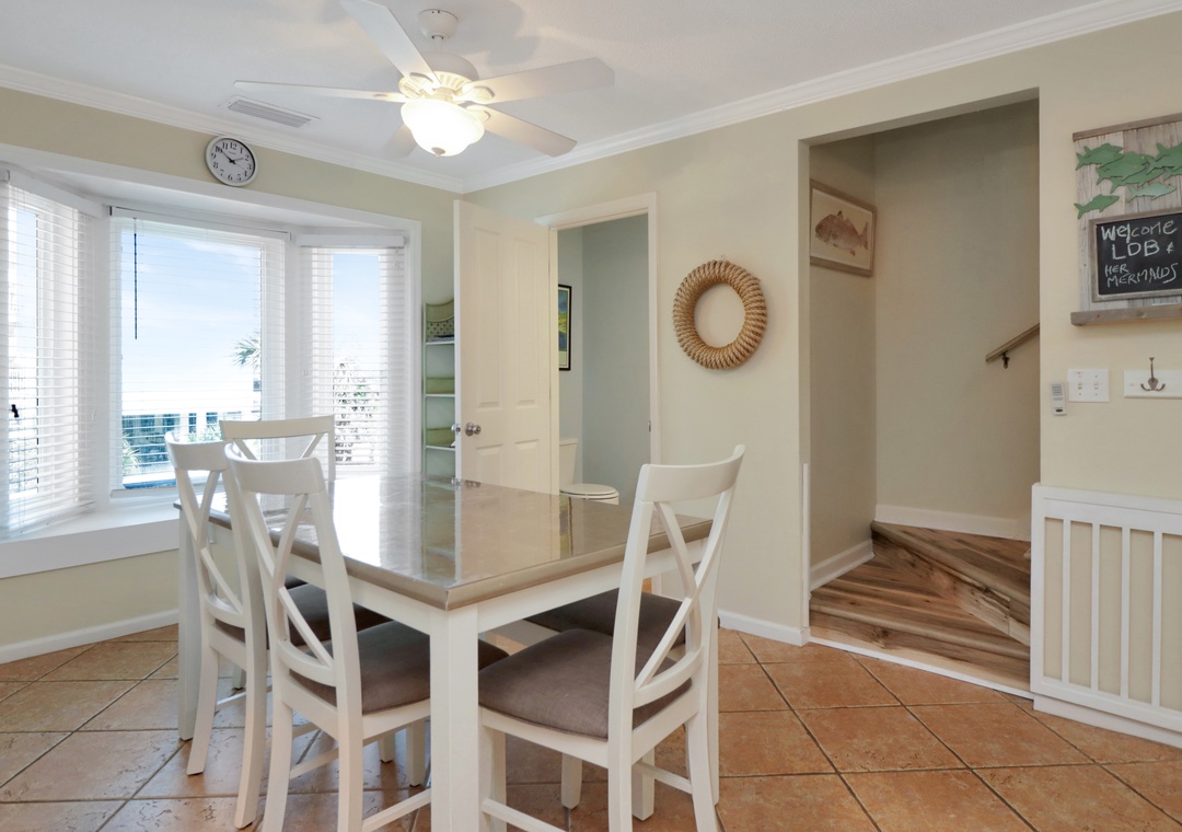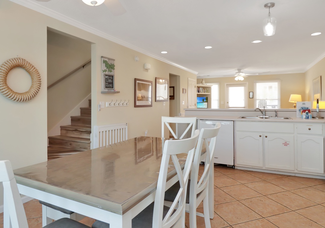 Floor Plan: Ground level-covered, paved parking, single garage and laundry room just inside the foyer. 1st level – living room with TV, DVD and gulf view deck furnished for outdoor dining; eat-in kitchen with dining for 6 and 3 barstools; and half bath. There are safety gates on all stairway entrances if you’re bringing little ones. 2nd level – Bedroom 1 – king bed, TV, full bath with shower/tub combo and gulf view deck; and Bedroom 2 – queen bed, TV, DVD and full bath with shower/tub combo. 3rd level – top floor master suite with king bed, TV, walk-in closet, gulf view deck and full bath with double vanities and shower/tub combo.