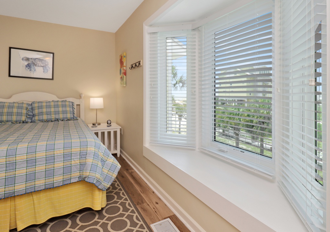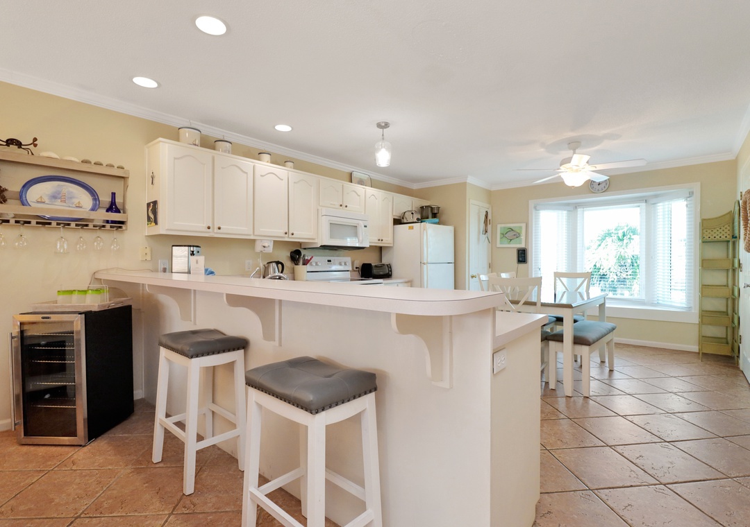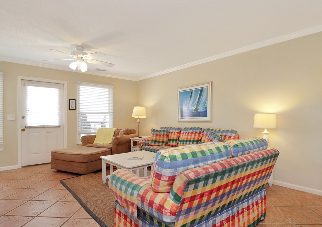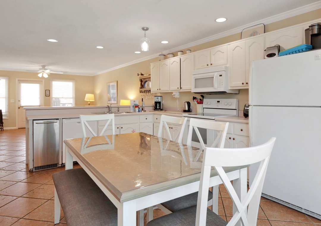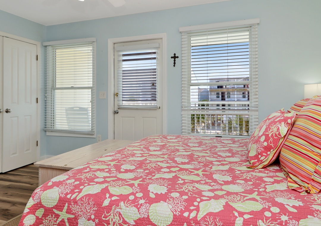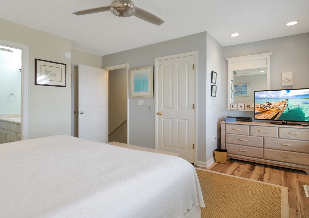 Floor Plan: Ground level-covered, paved parking, single garage and laundry room just inside the foyer. 1st level – living room with TV, DVD and gulf view deck furnished for outdoor dining; eat-in kitchen with dining for 6 and 3 barstools; and half bath. There are safety gates on all stairway entrances if you’re bringing little ones. 2nd level – Bedroom 1 – king bed, TV, full bath with shower/tub combo and gulf view deck; and Bedroom 2 – queen bed, TV, DVD and full bath with shower/tub combo. 3rd level – top floor master suite with king bed, TV, walk-in closet, gulf view deck and full bath with double vanities and shower/tub combo.