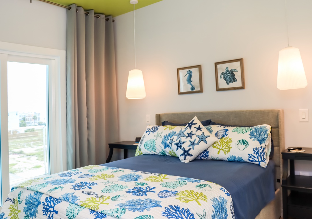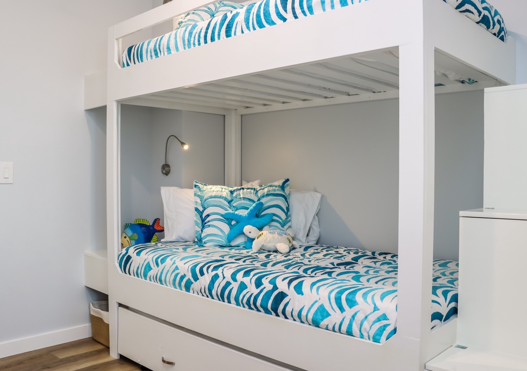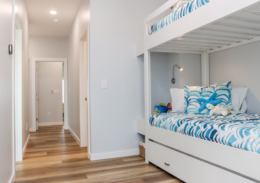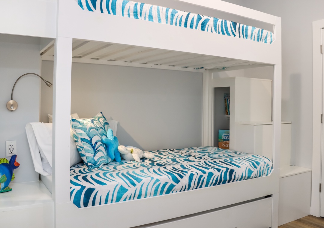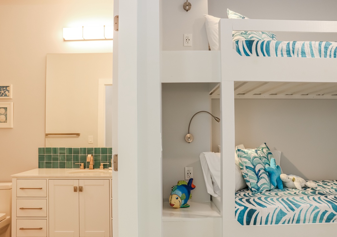 Retreat to the second floor for a restful night's sleep in one of the three plush bedrooms, with an additional sleeping loft available. Beachfront decks offer stunning views from two of the bedrooms, while a full bathroom in the hallway connects to another bedroom. A set of bunk beds with a twin trundle provides extra sleeping space.